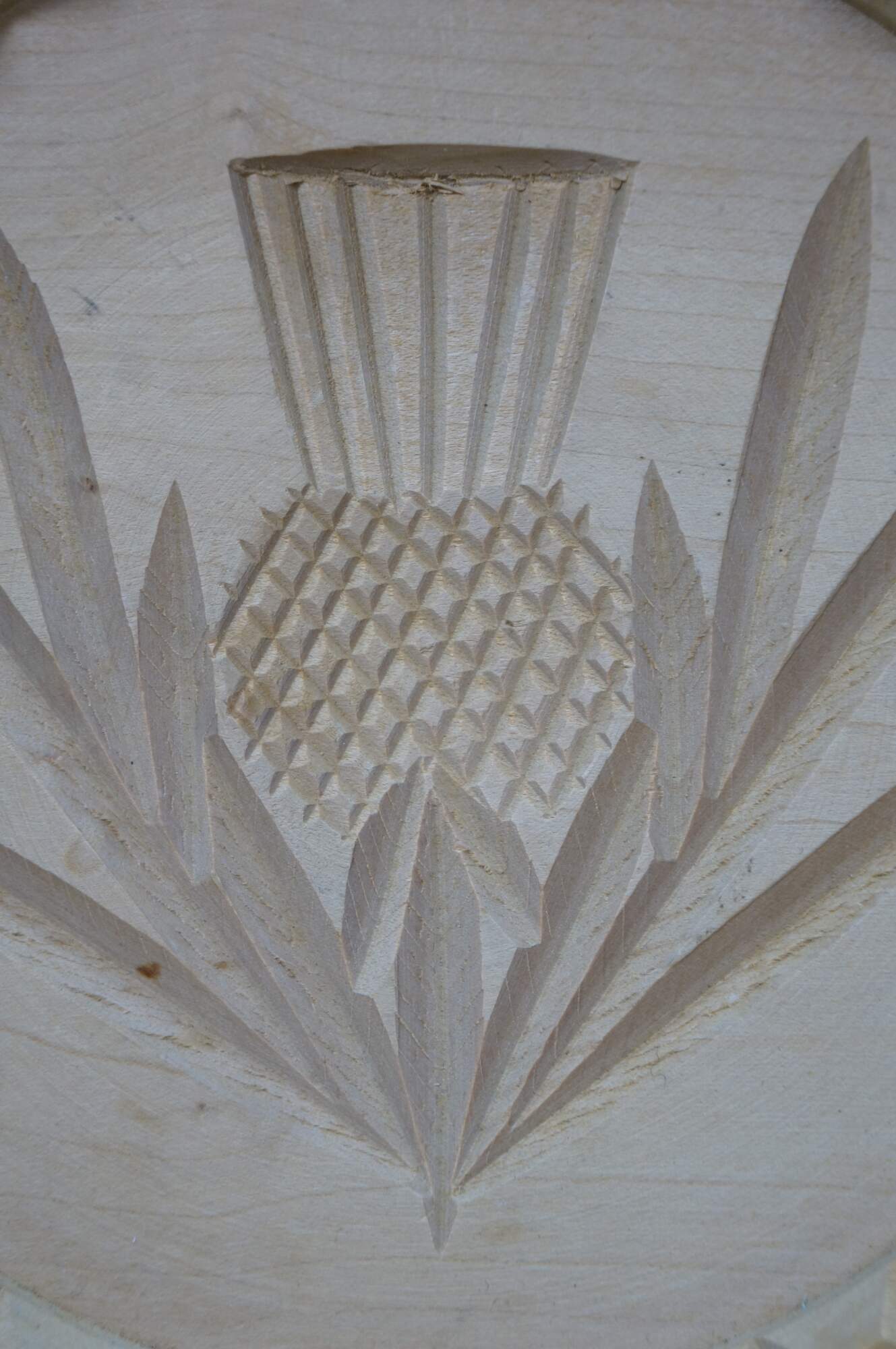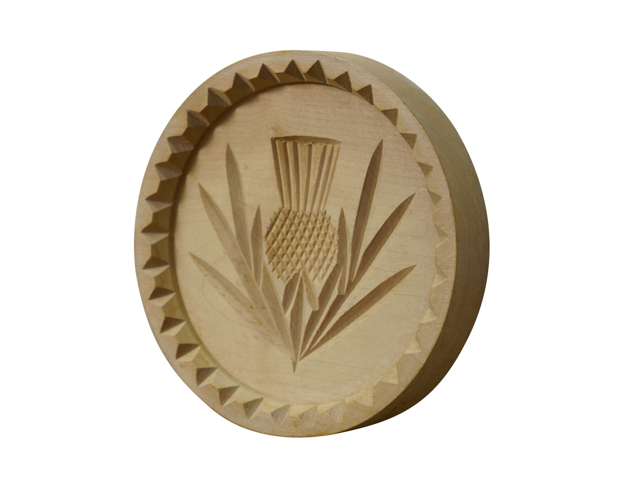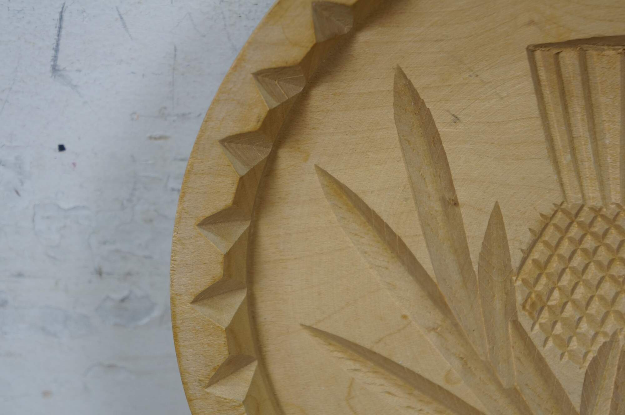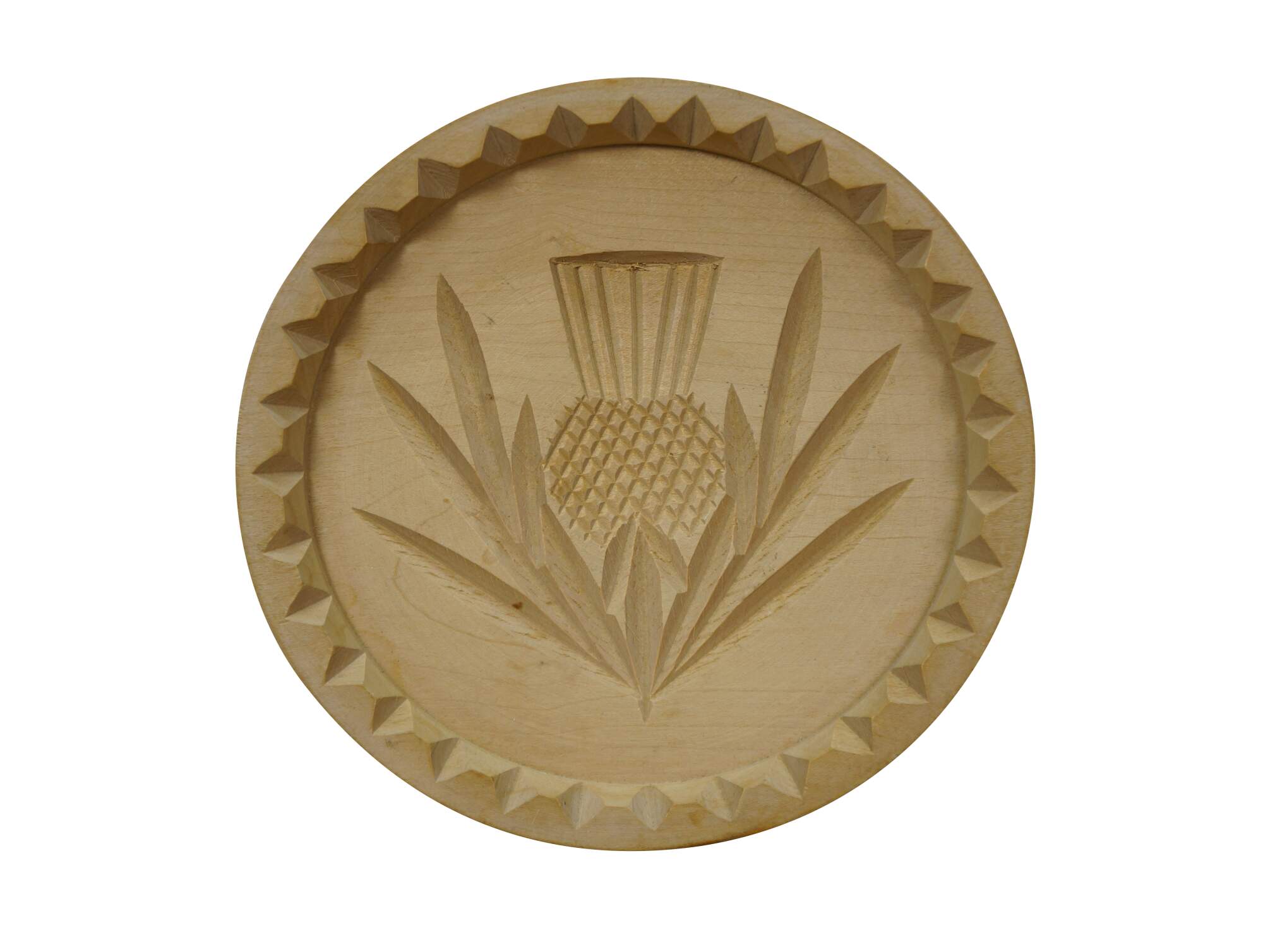 Late 20th century hand carved, round, wooden shortbread mold featuring a Scottish thistle and sunburst / sawtooth edge. Hand Made by J&I Crichton - Braemar, Scotland.