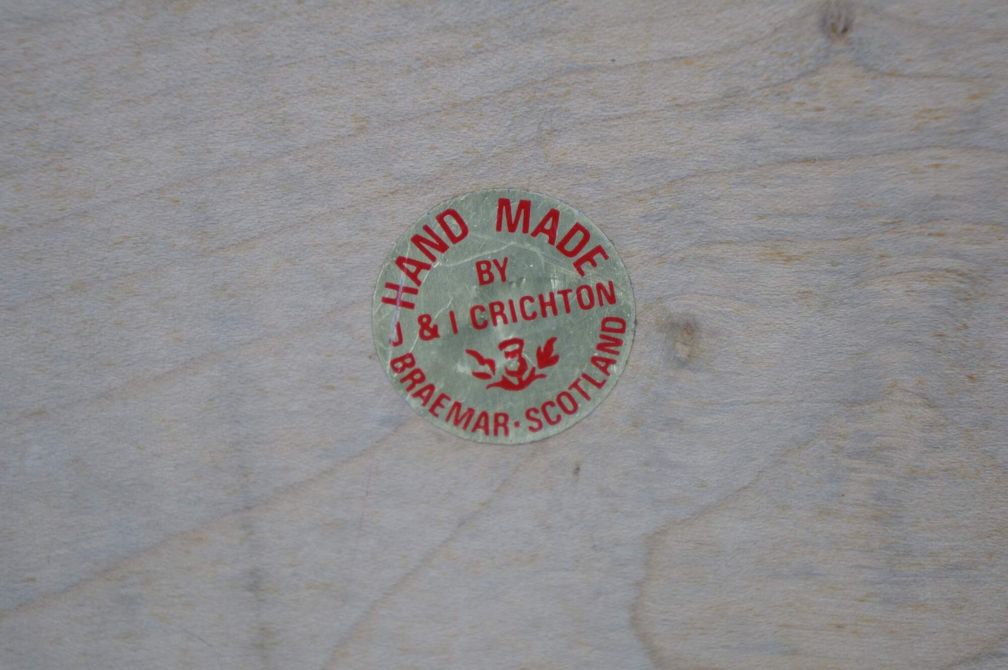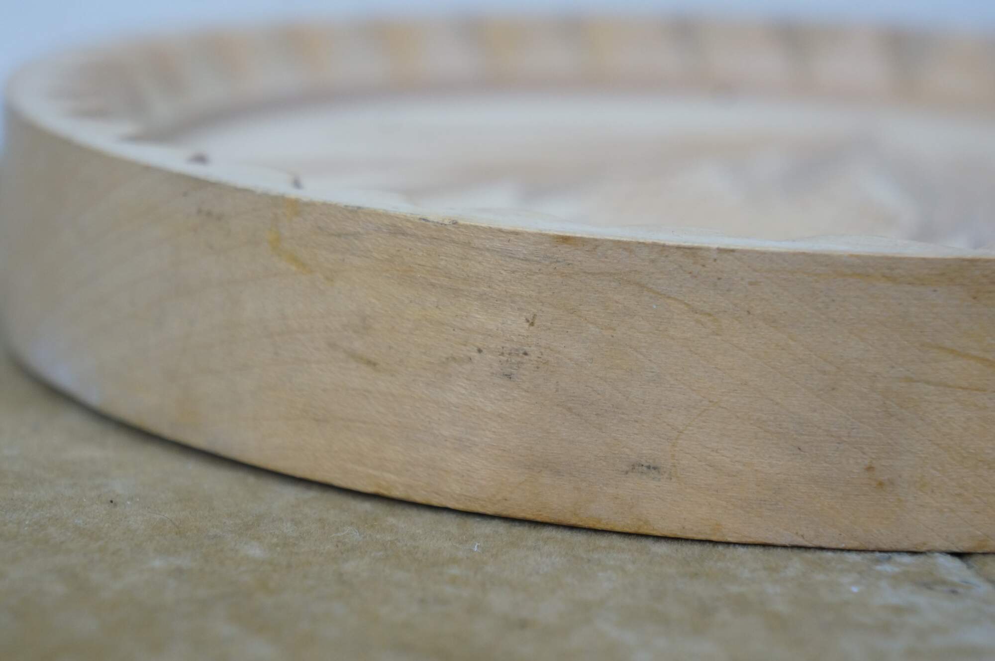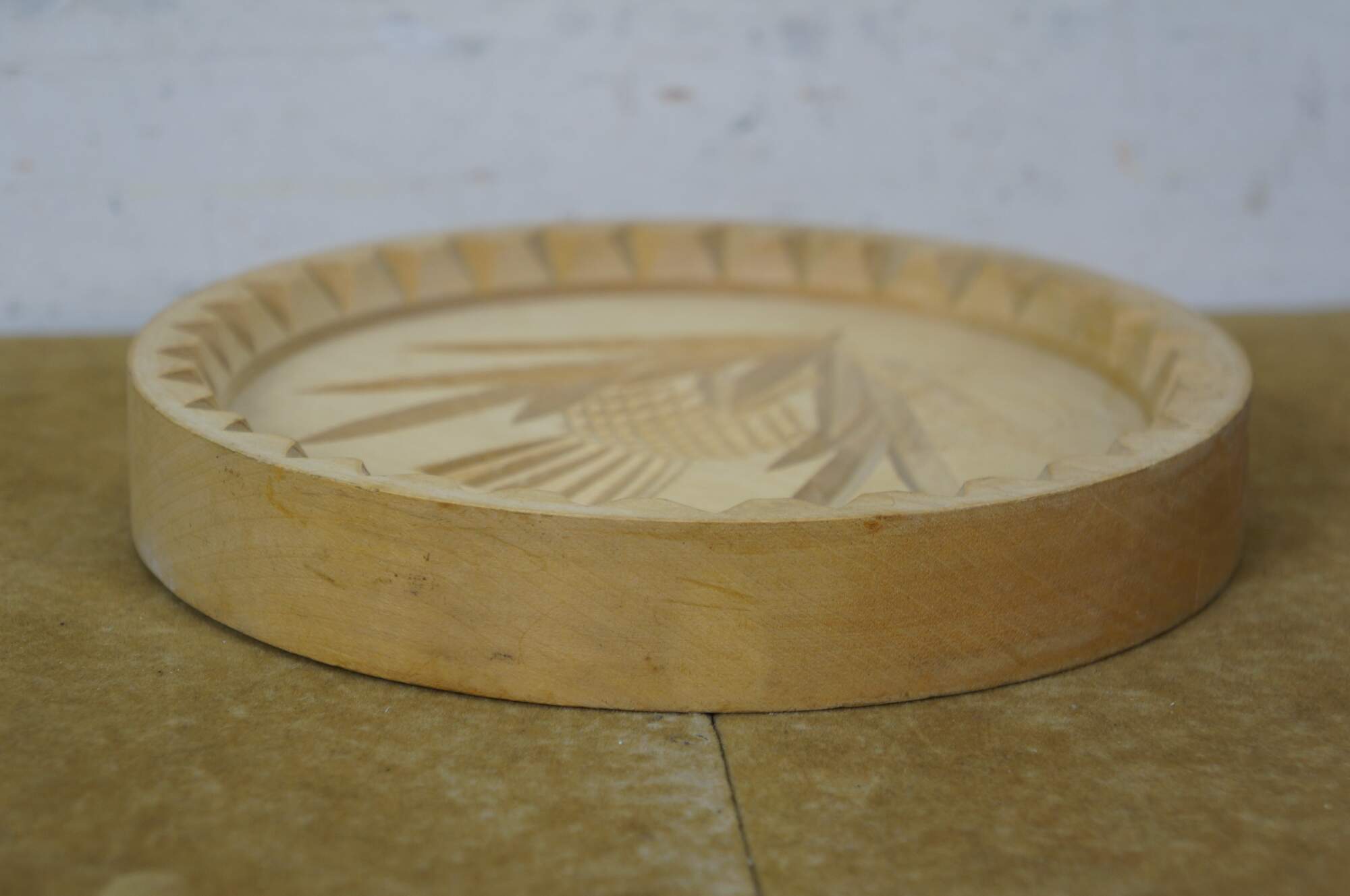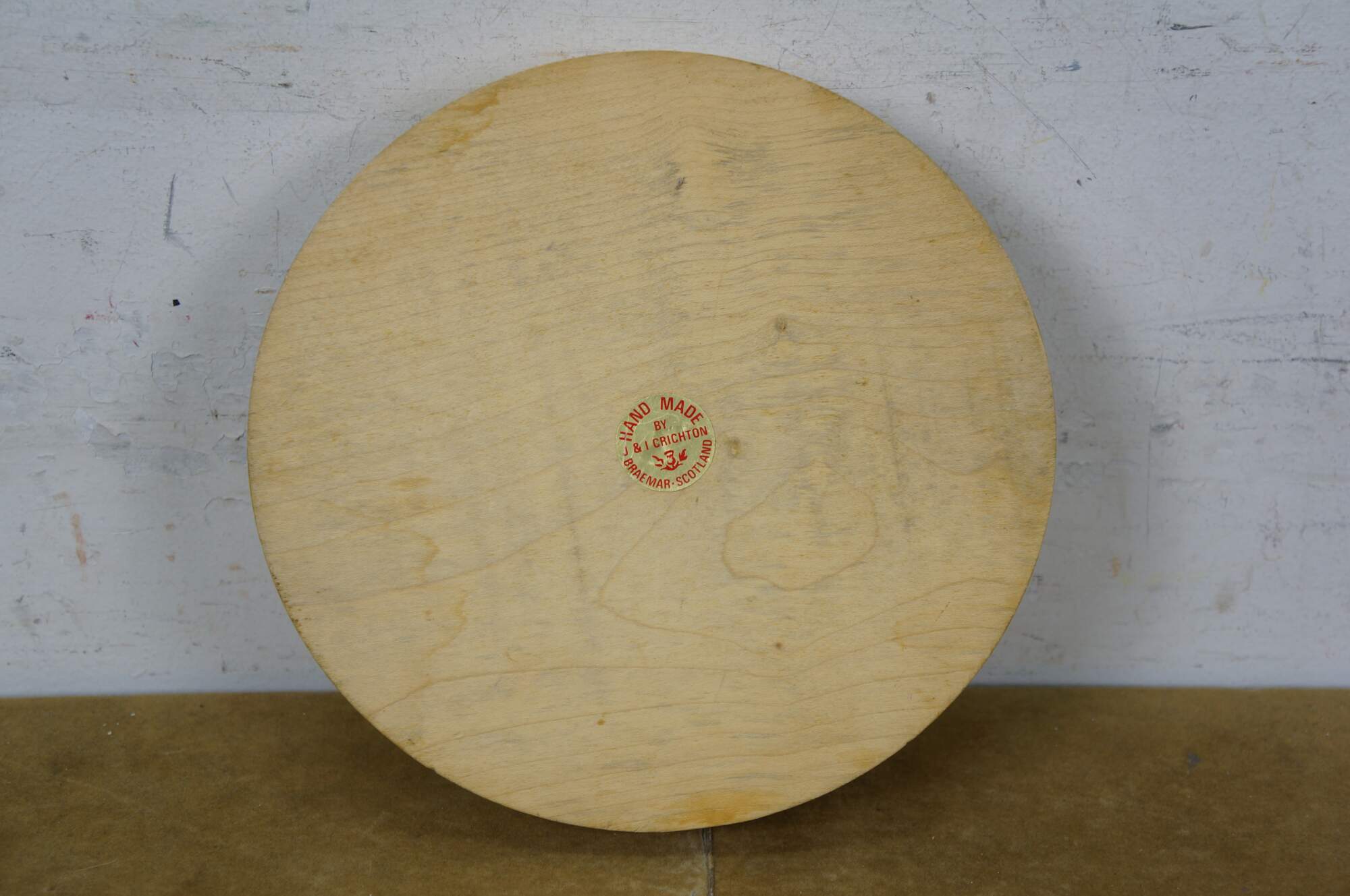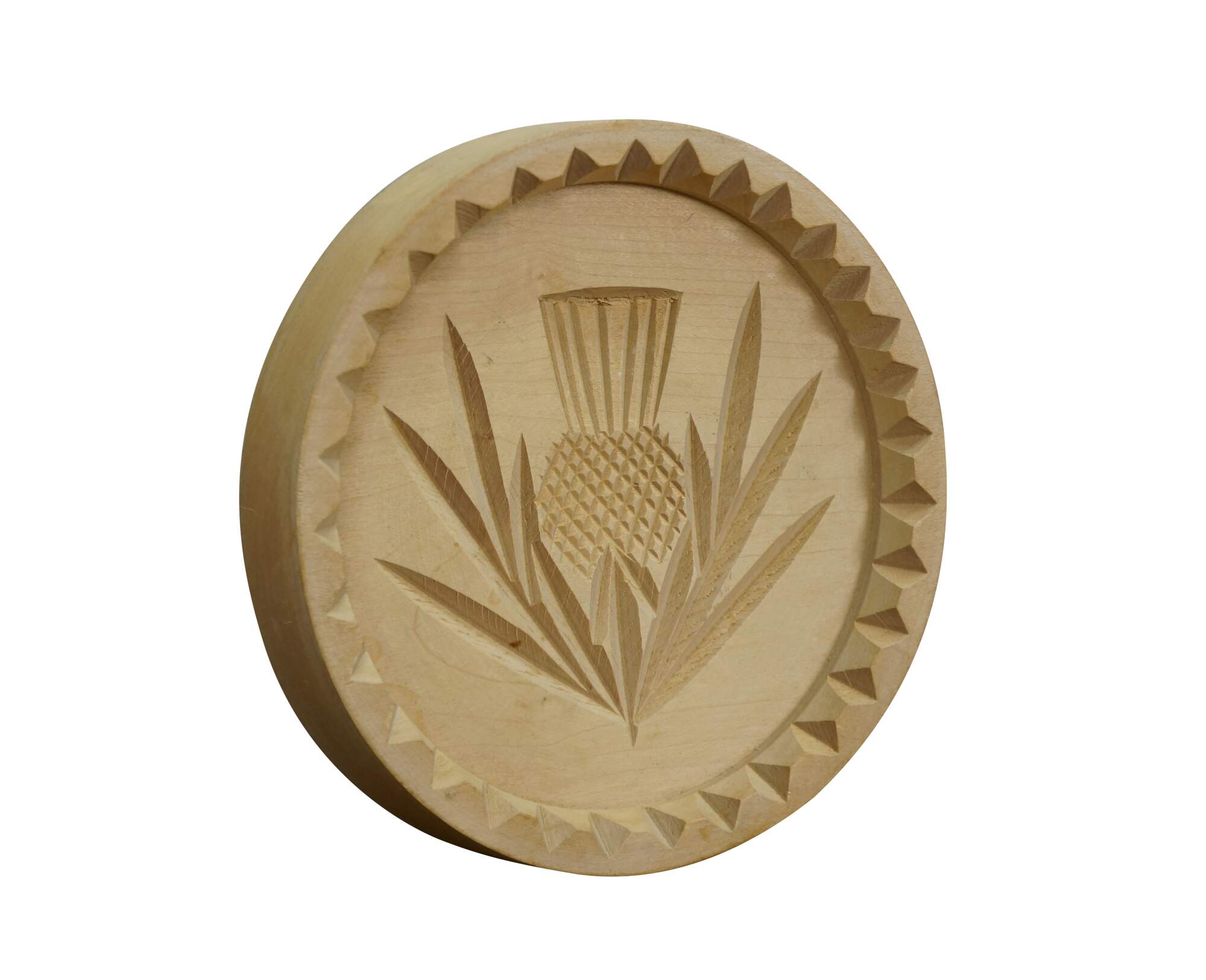 Late 20th century hand carved, round, wooden shortbread mold featuring a Scottish thistle and sunburst / sawtooth edge. Hand Made by J&I Crichton - Braemar, Scotland.