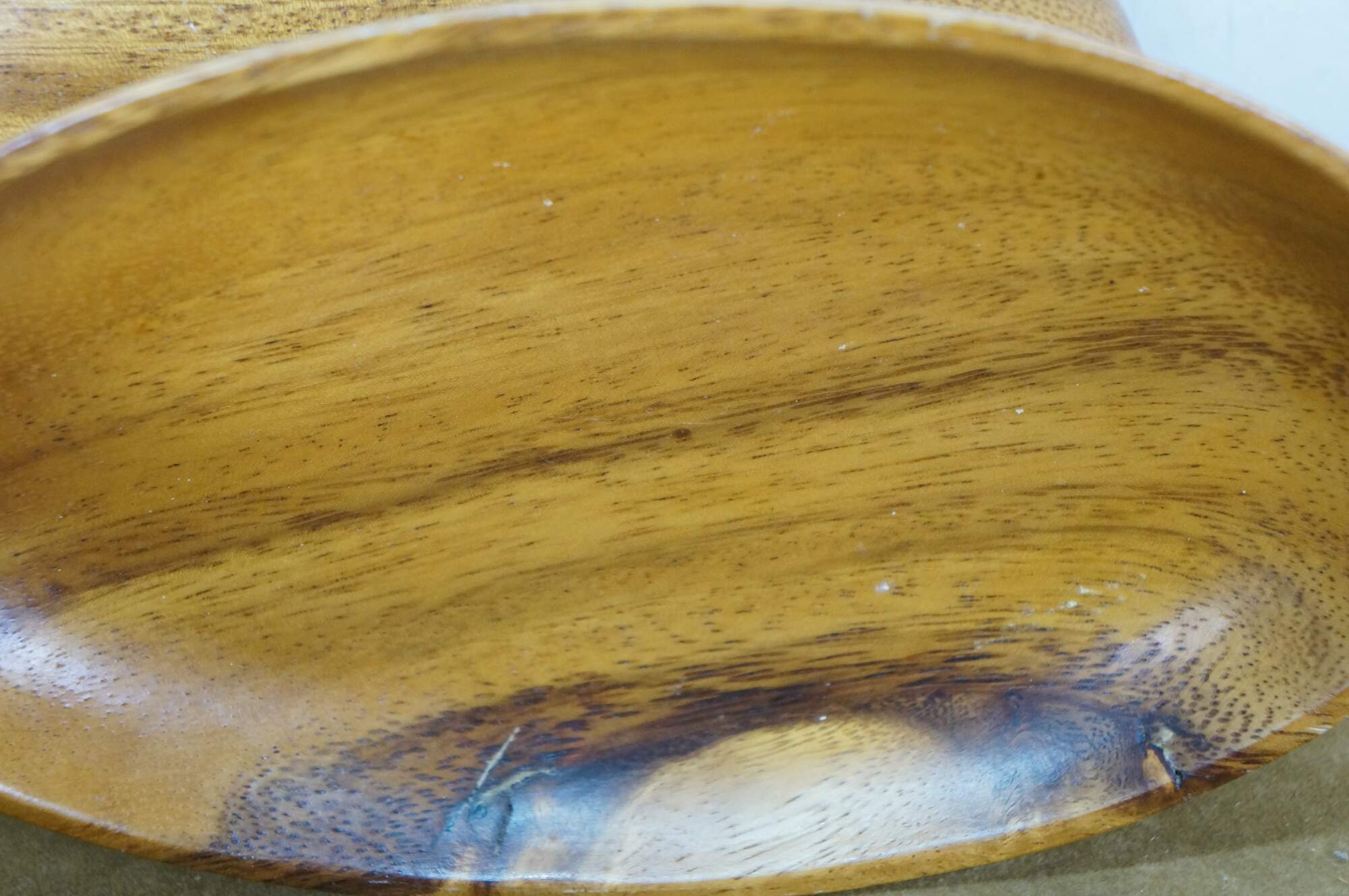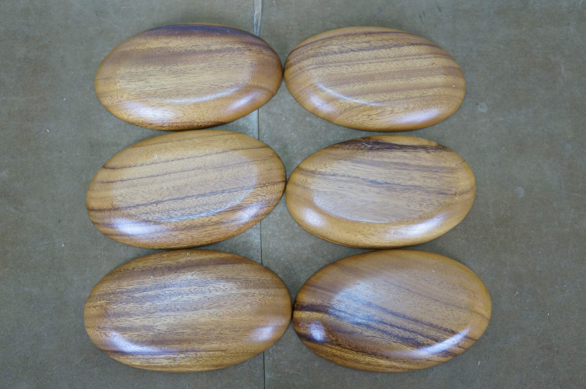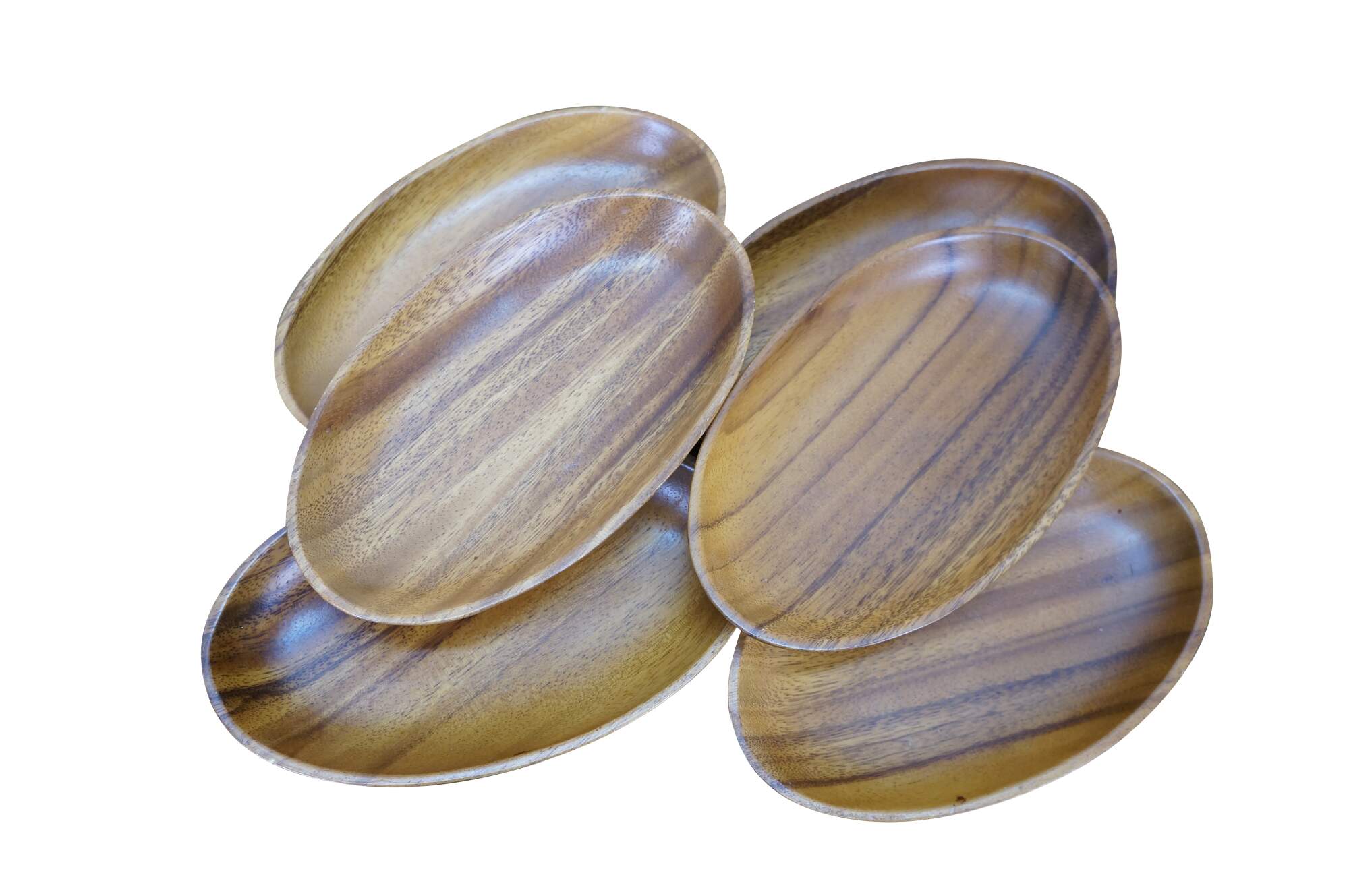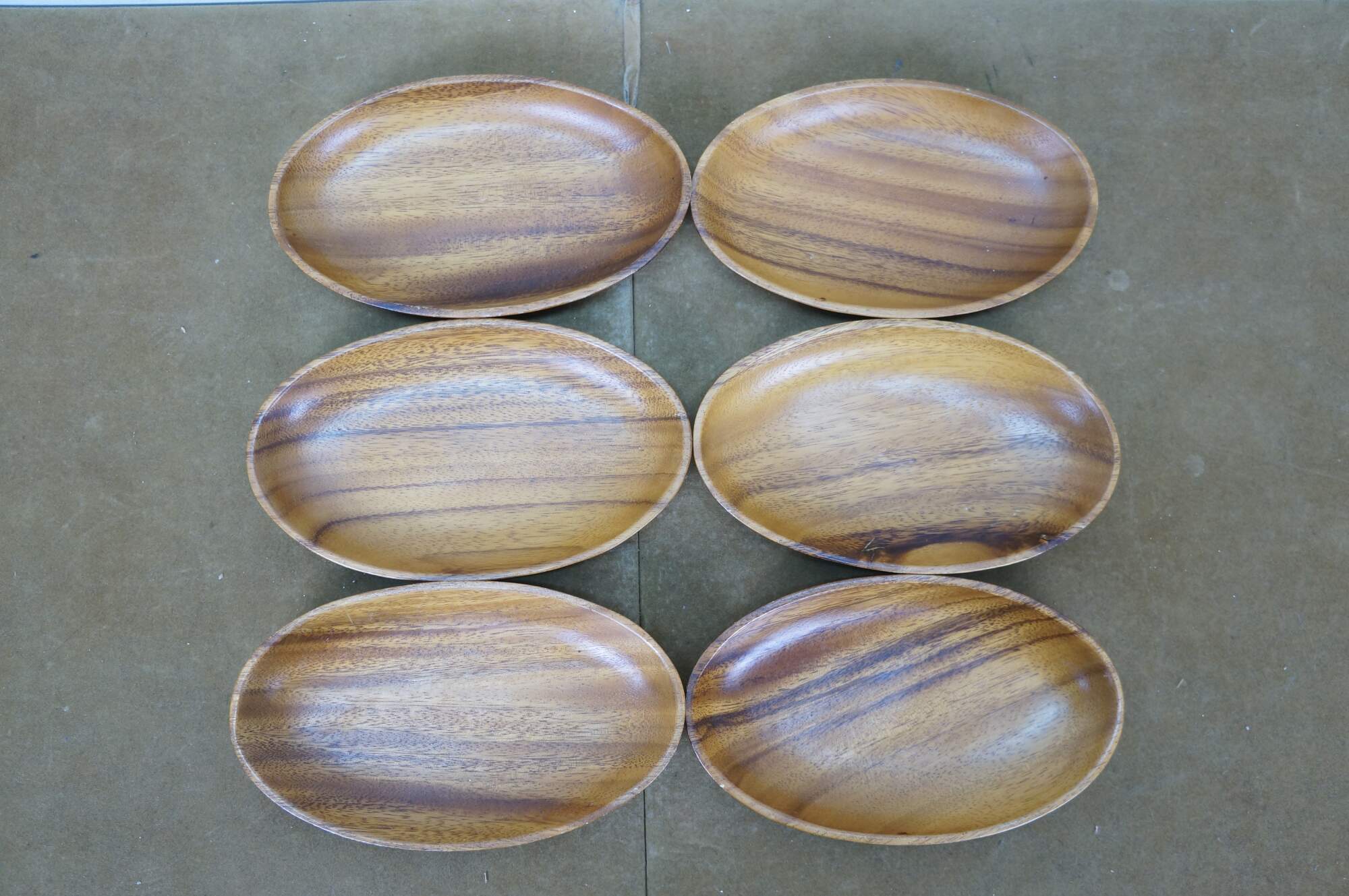Set of six acacia wood oval salad / fruit plates / snack trays. Un-branded.
