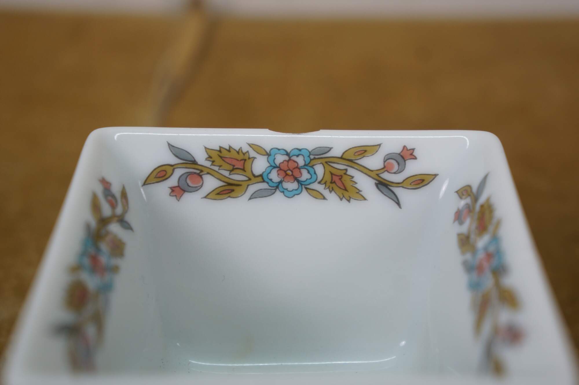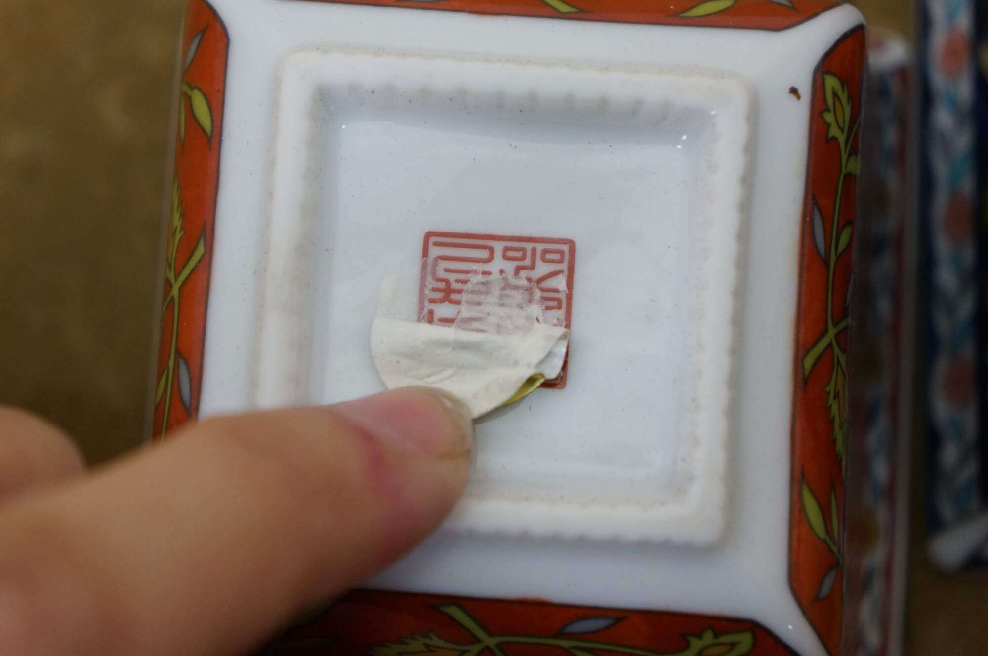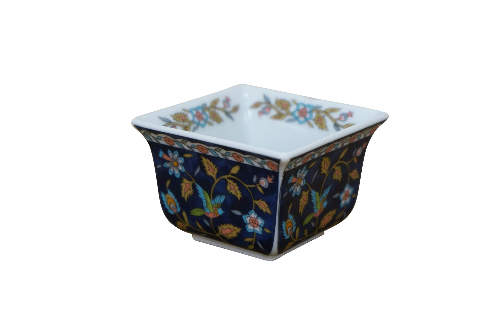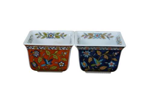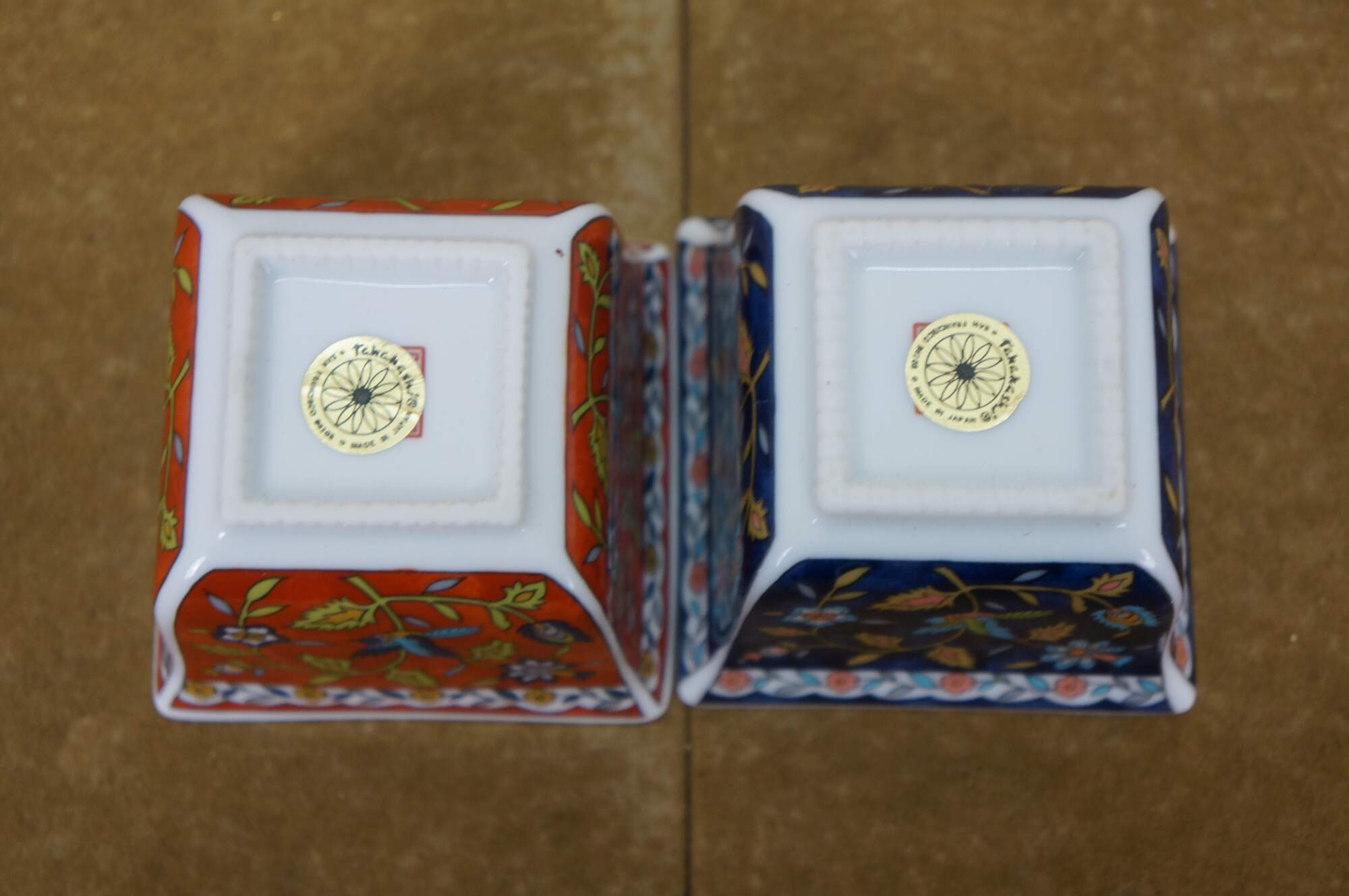 Pair of circa 1983 Takahashi Silk Road collection porcelain nut / bon bon dishes. Square form with rounded base edges and flared mouth, featuring matching floral designs accented with a bird, one with a red orange background and one with a dark blue background.