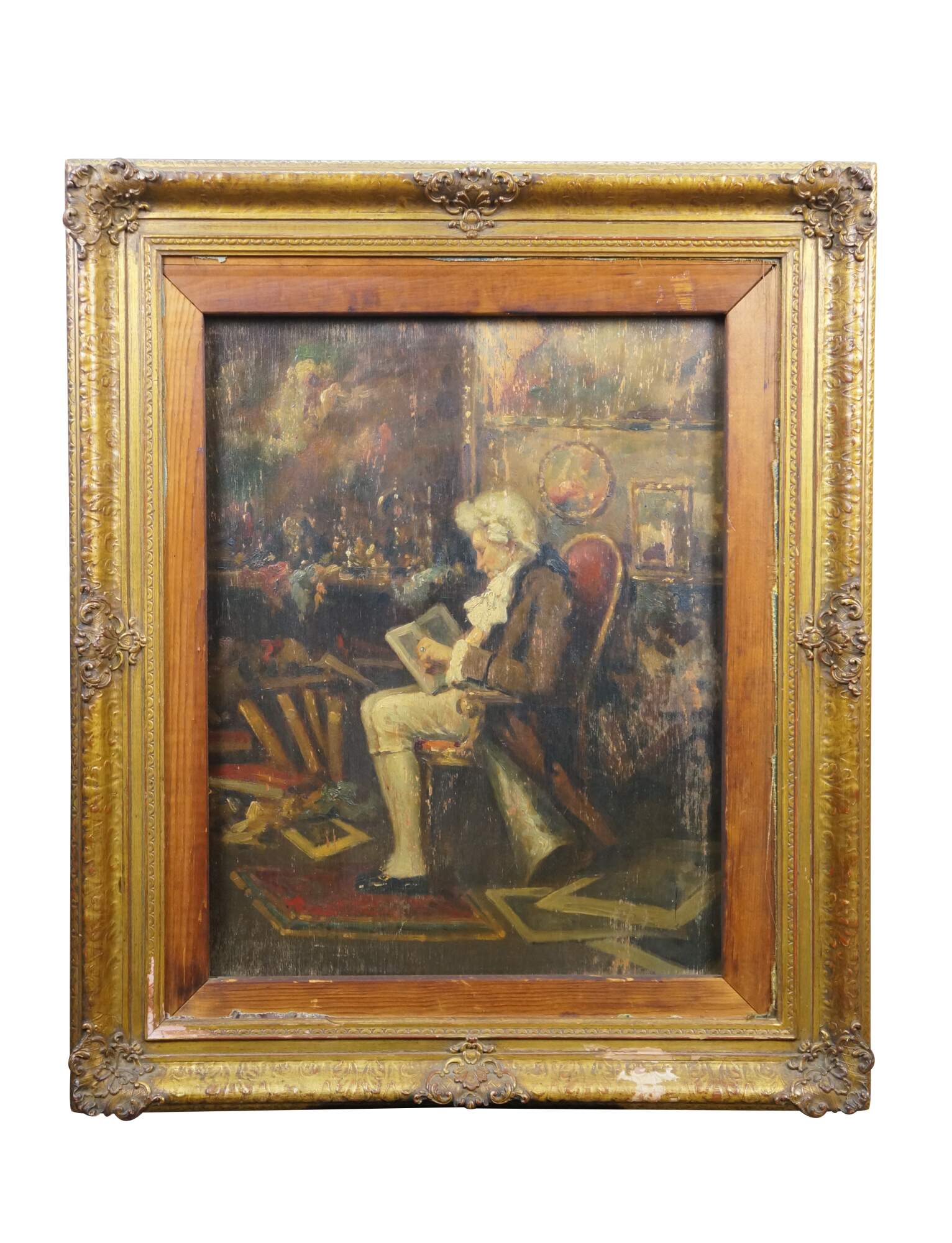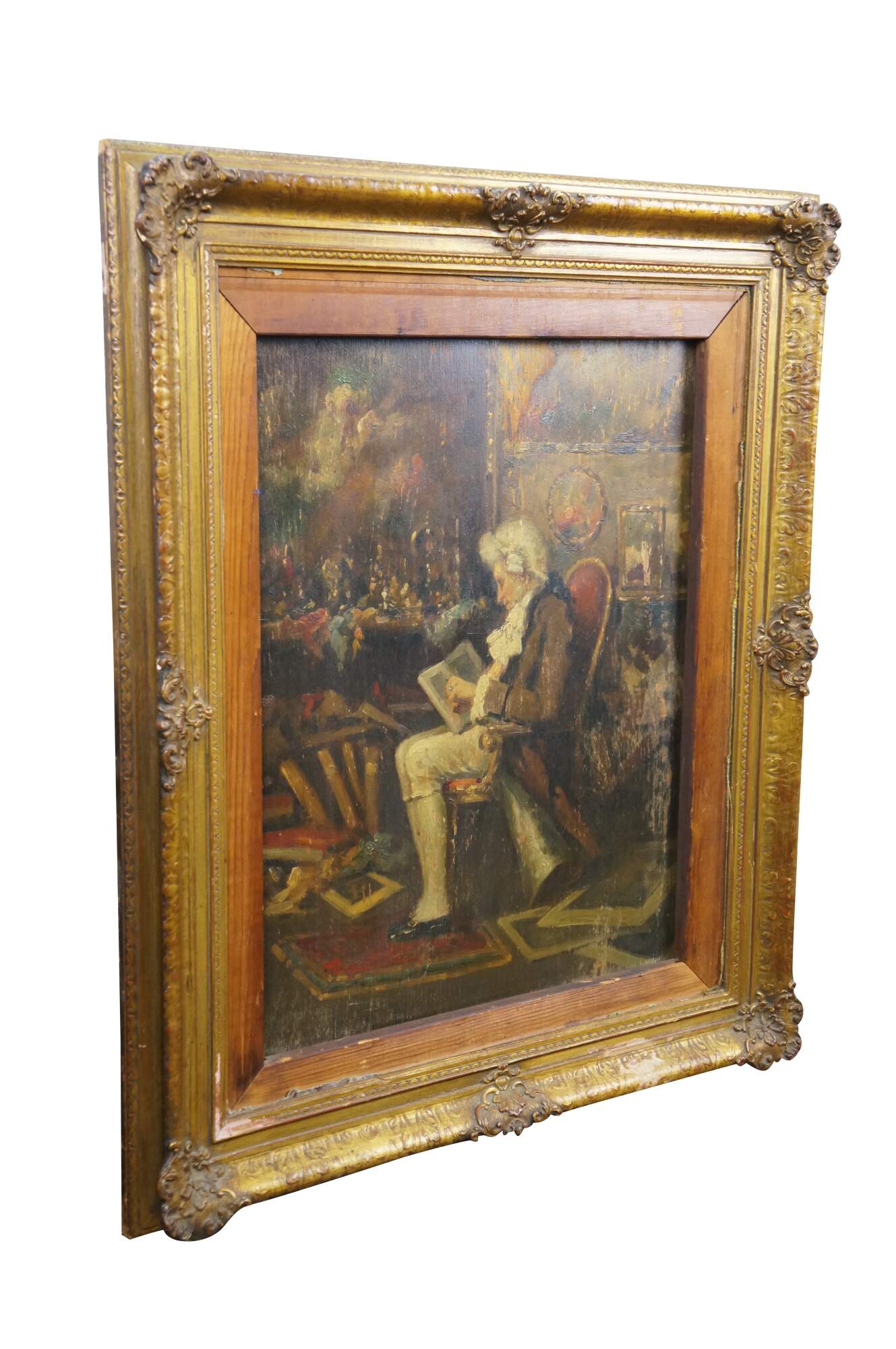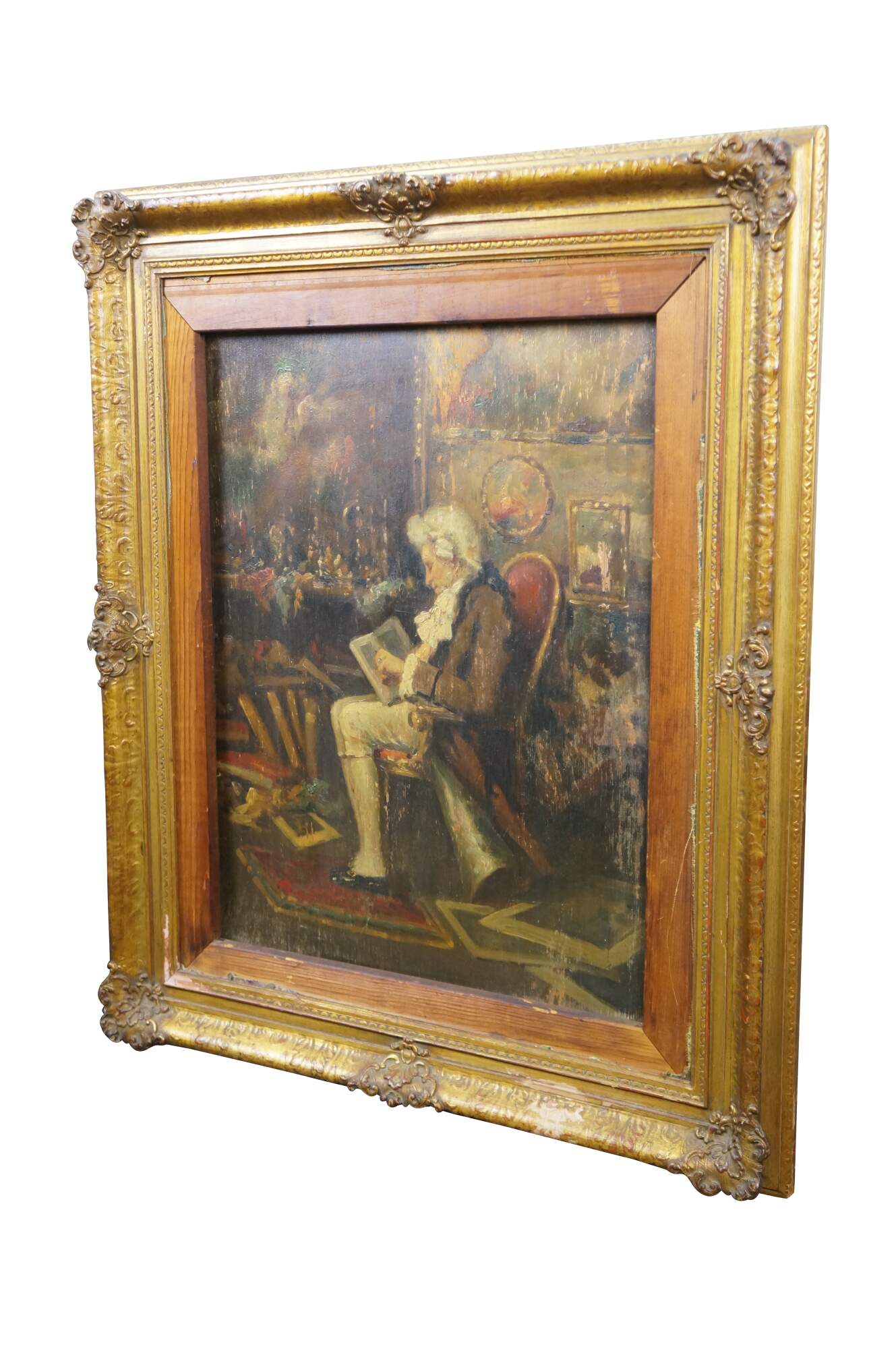 Antique oil on board genre painting depicting a man in 18th century Colonial clothing and wig, seated in a chair reading a book in his study. Gilt wood & composite frame with foliate details.