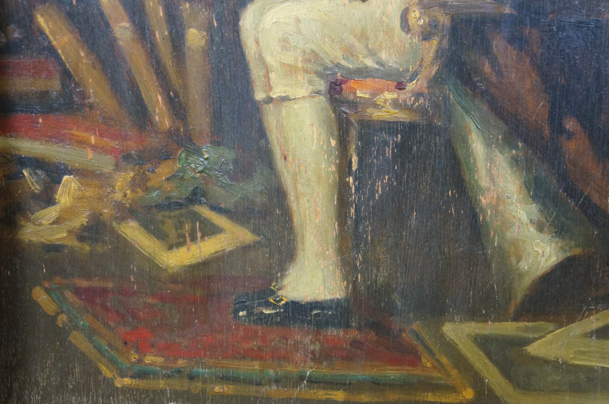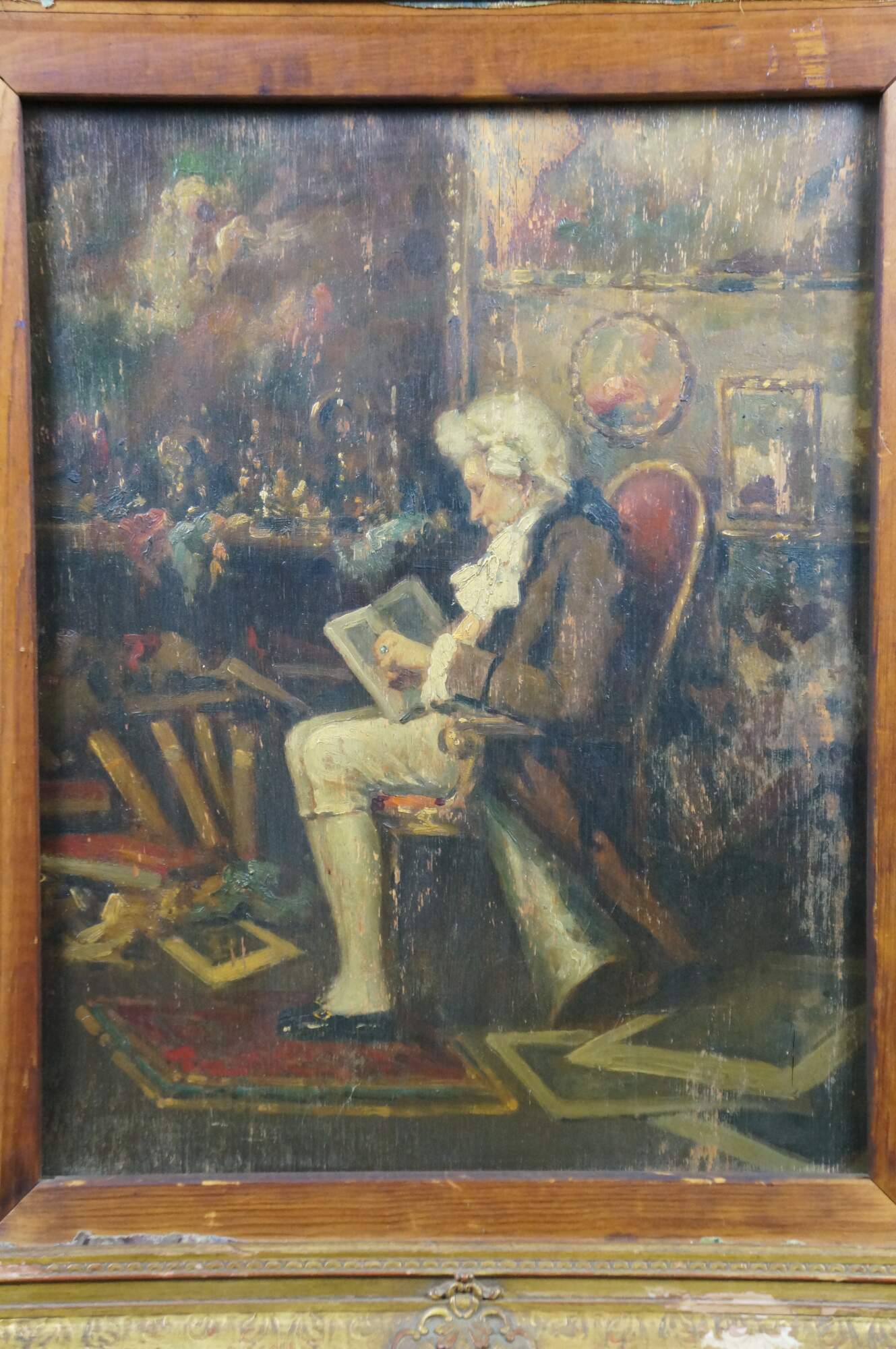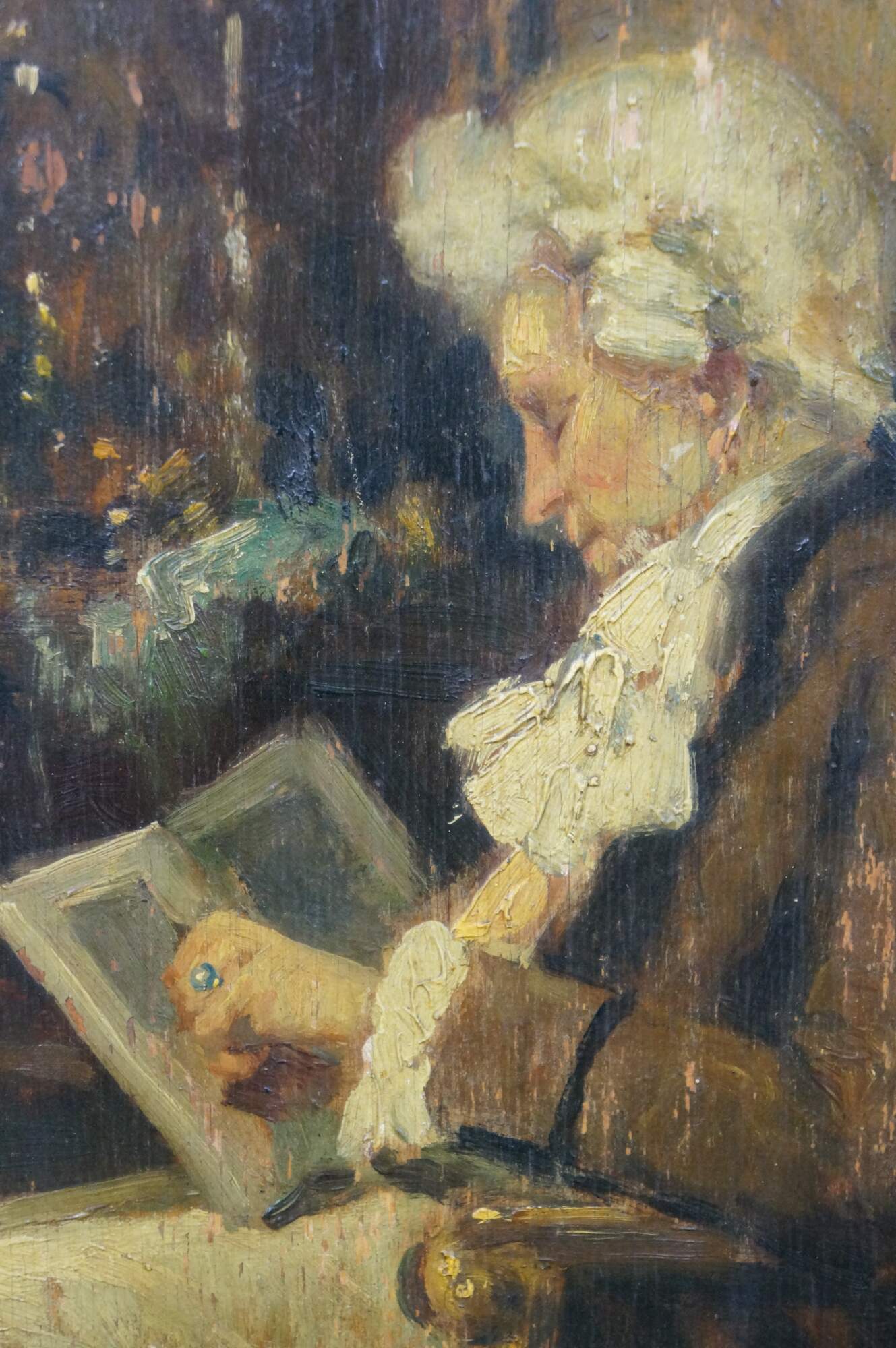 Antique oil on board genre painting depicting a man in 18th century Colonial clothing and wig, seated in a chair reading a book in his study. Gilt wood & composite frame with foliate details.