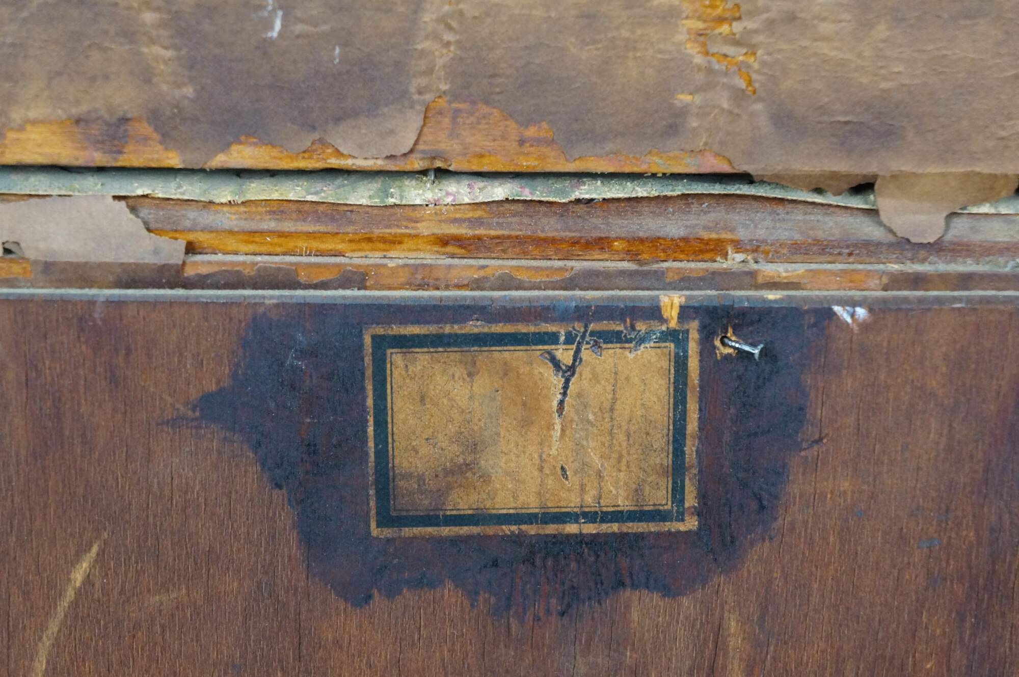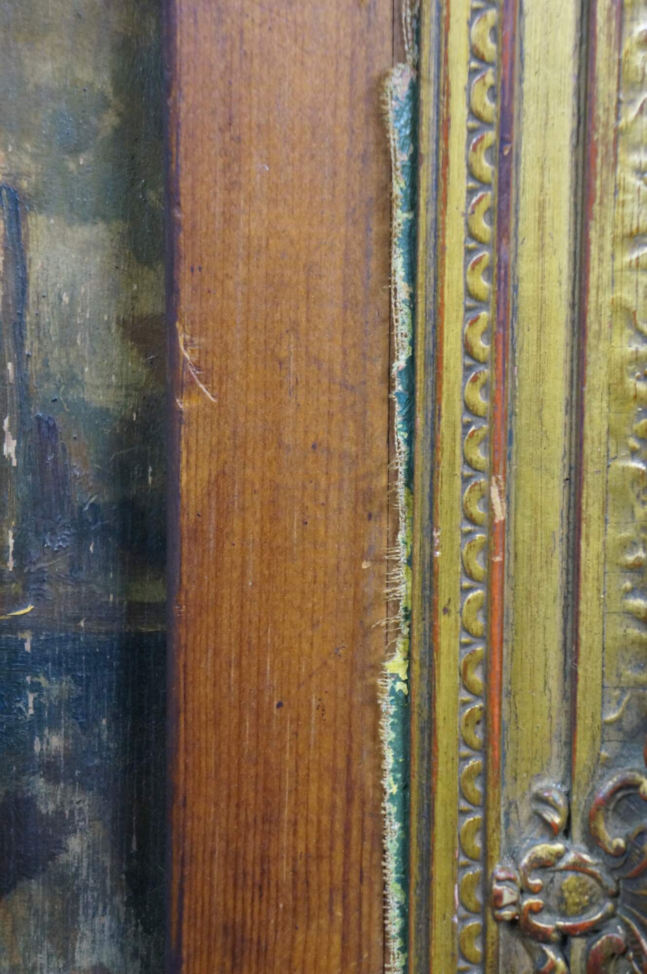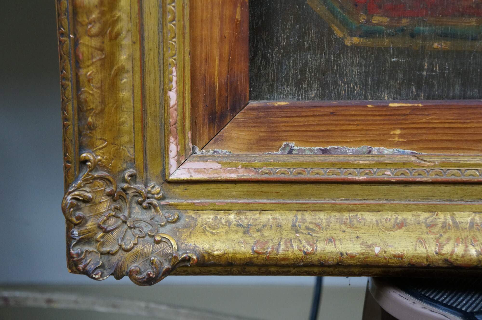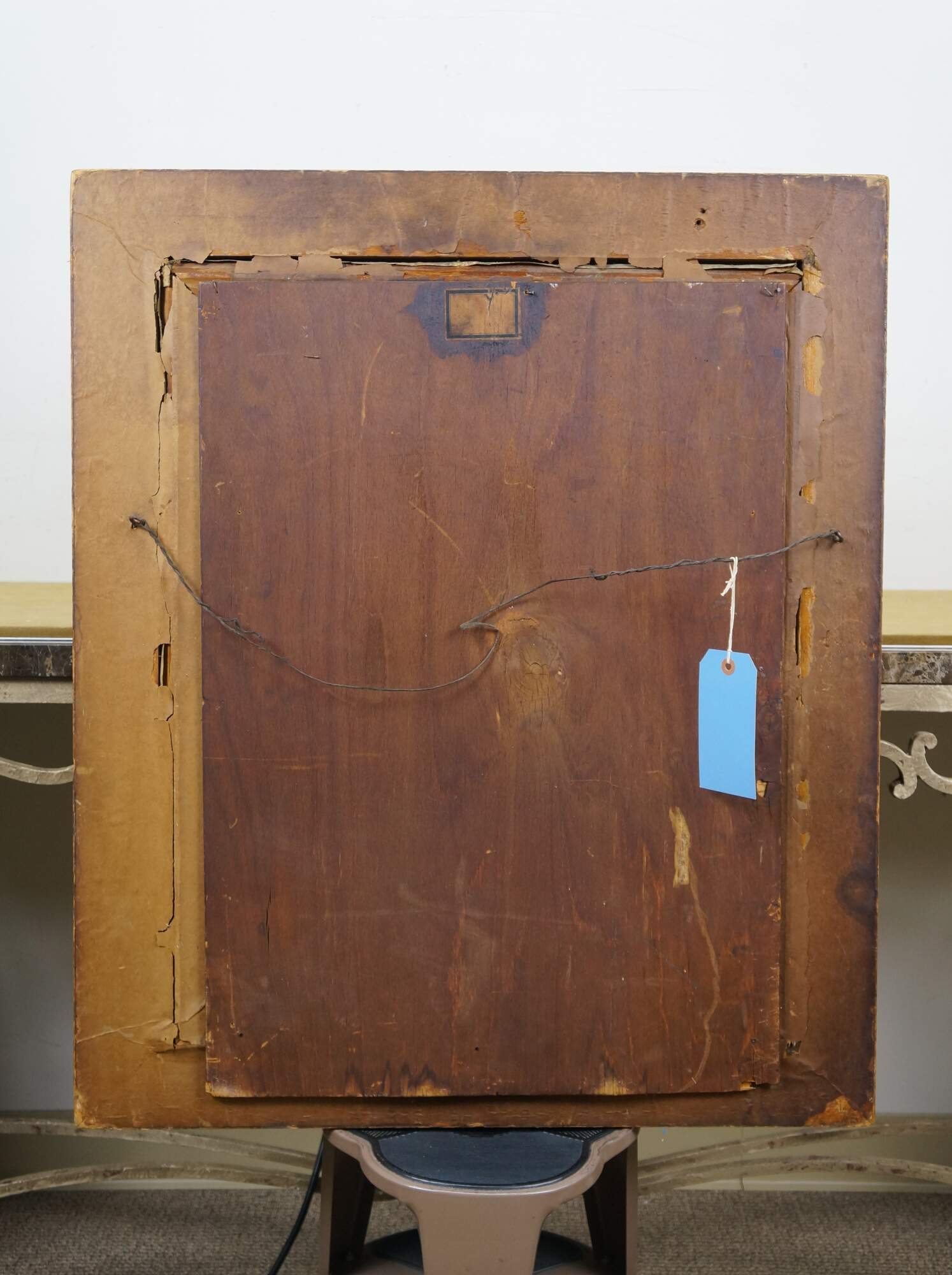 Wear from age, paint loss, fading, chipping to frame, original painting cut out and board used as a backing, which is now visible. not sure if it was intended to conceal this piece, or if it was used as a backing, or if someone just framed it this way.