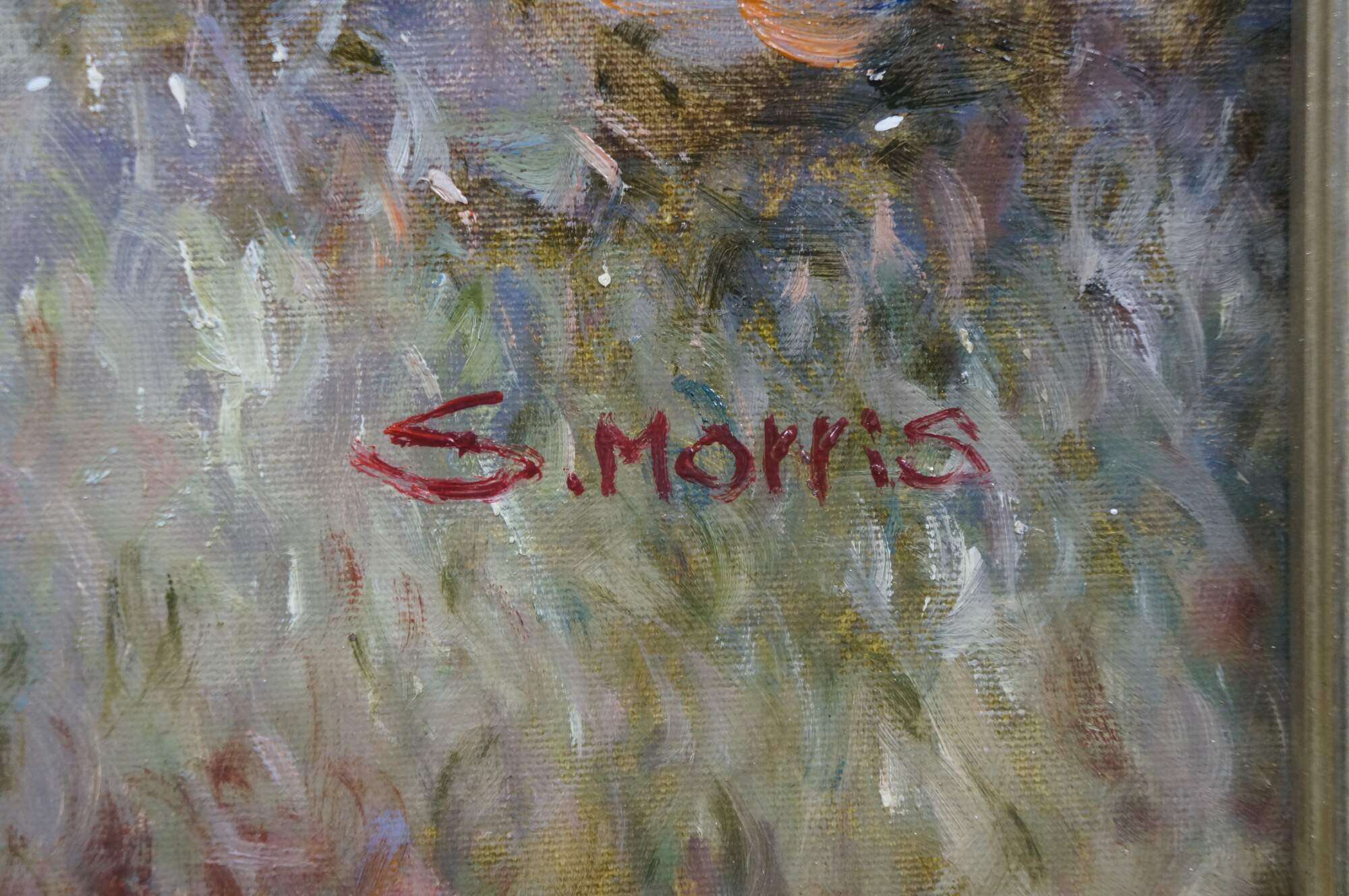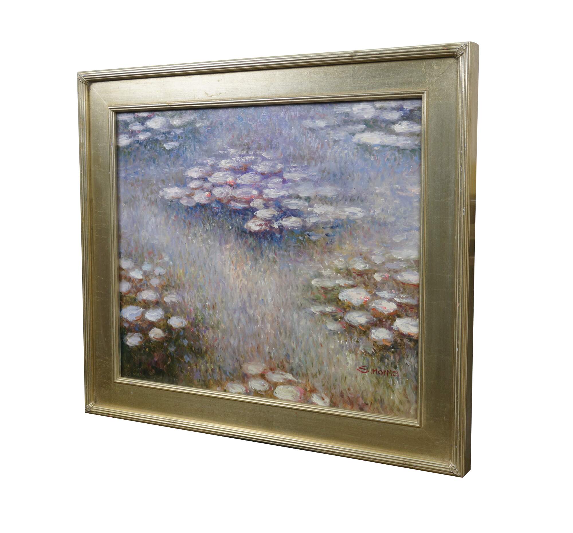 Late 20th century oil on canvas impressionist style painting after one of Claude Monet's many depictions of Water Lilies. Depicts clusters of lily pads in shades of violet, green, and blue. Signed S. Morris, lower right. Gilt composite frame.