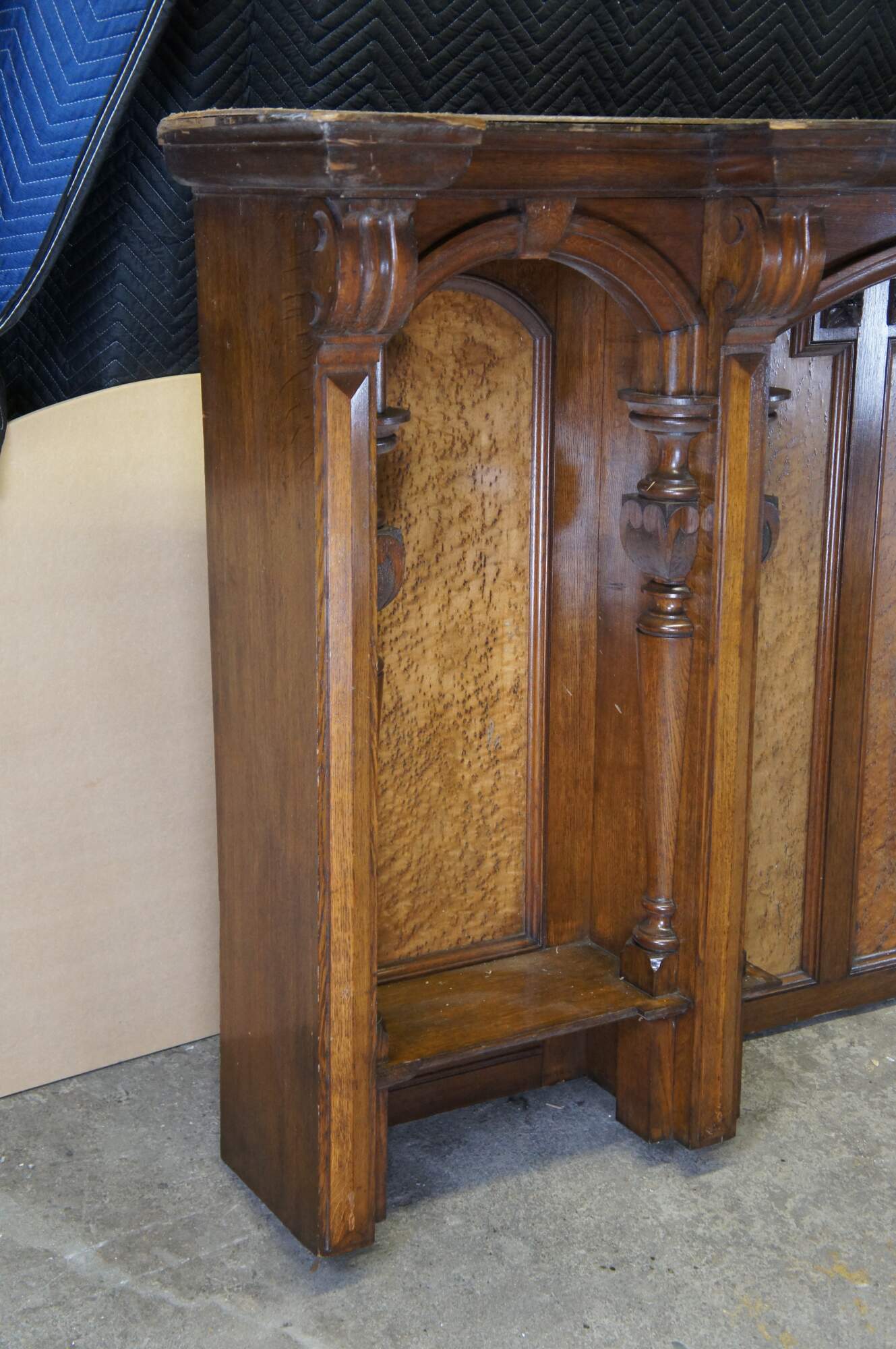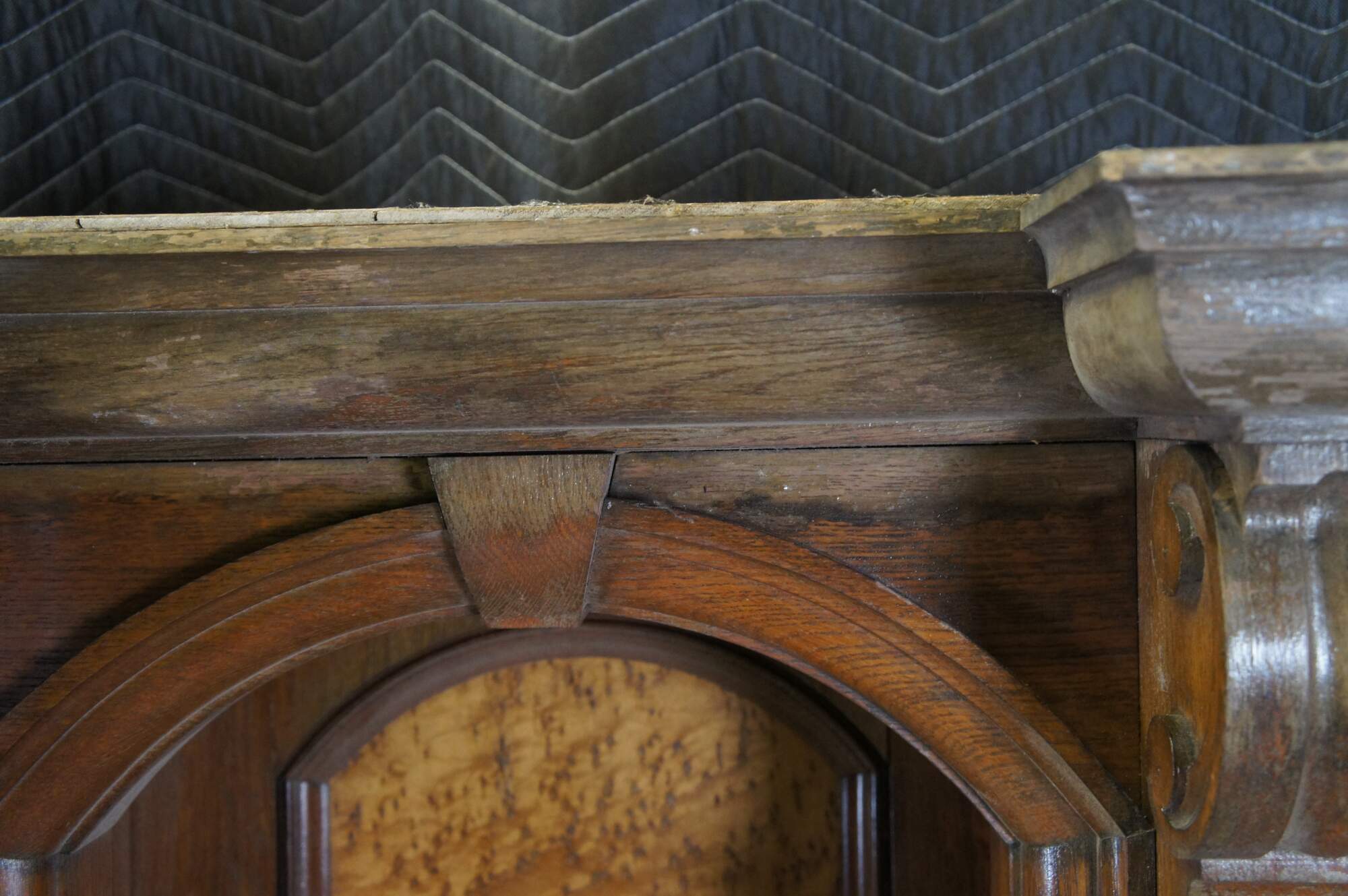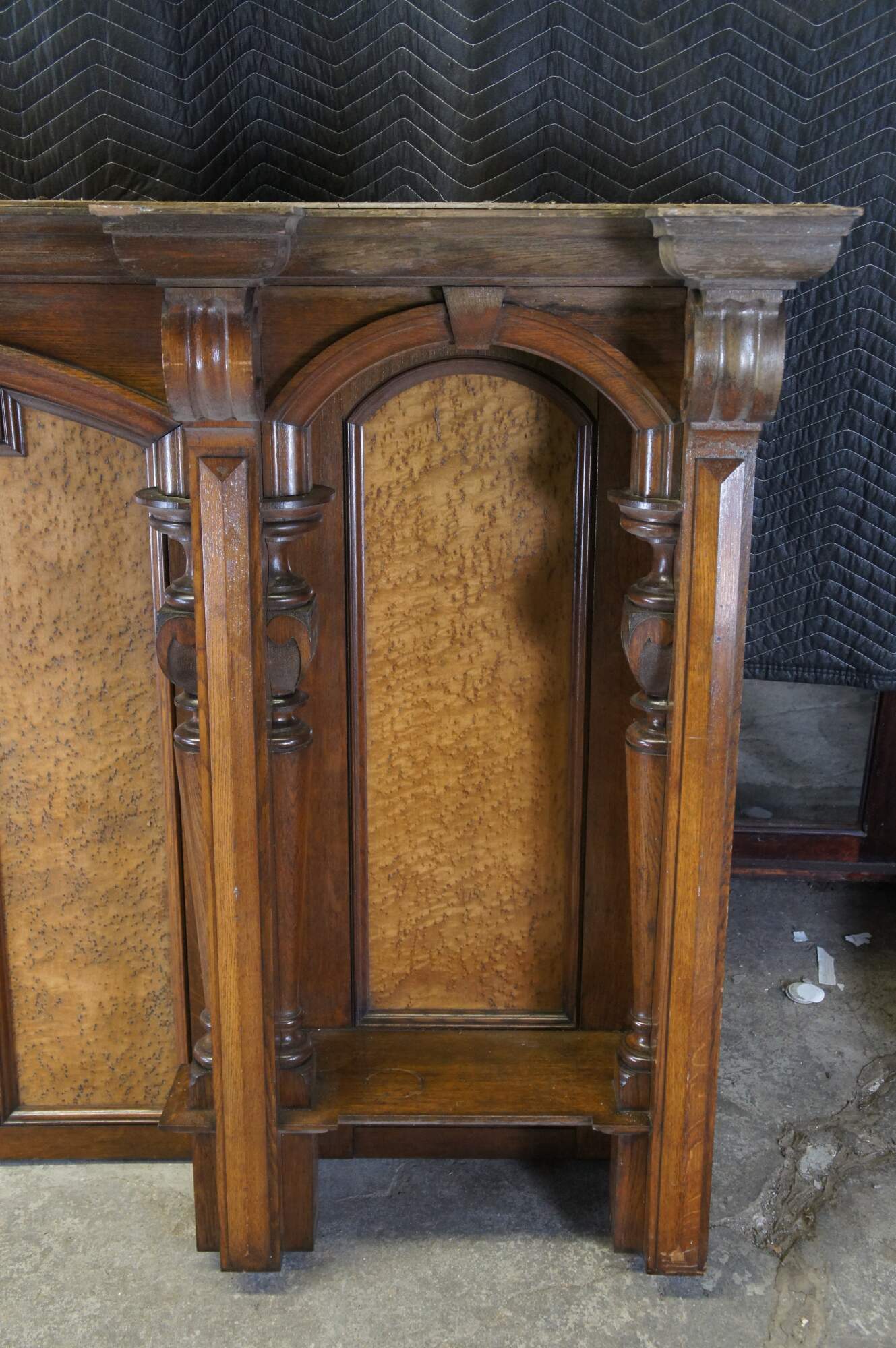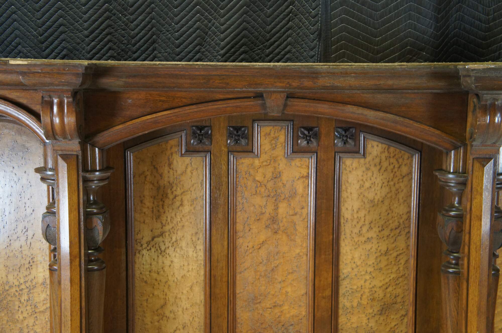 Large antique late 19th English Victorian reclaimed oak hutch. Features an arcaded front with partial turned and carved columns set around birdseye maple back panelling and 'C' scrolled spandrels along the top. Includes two shelves for display.