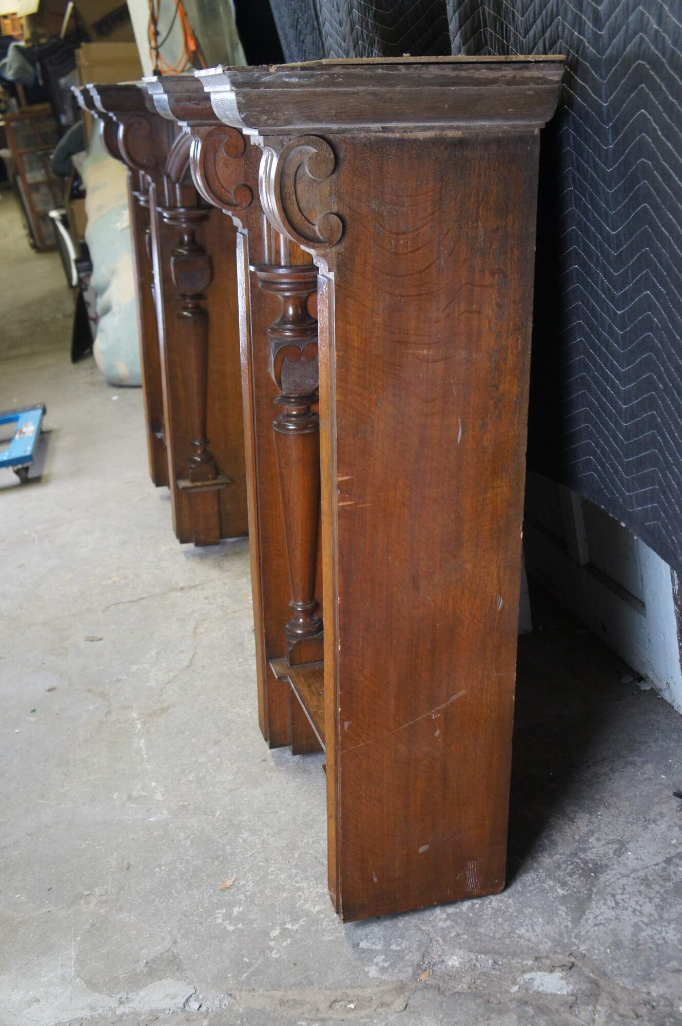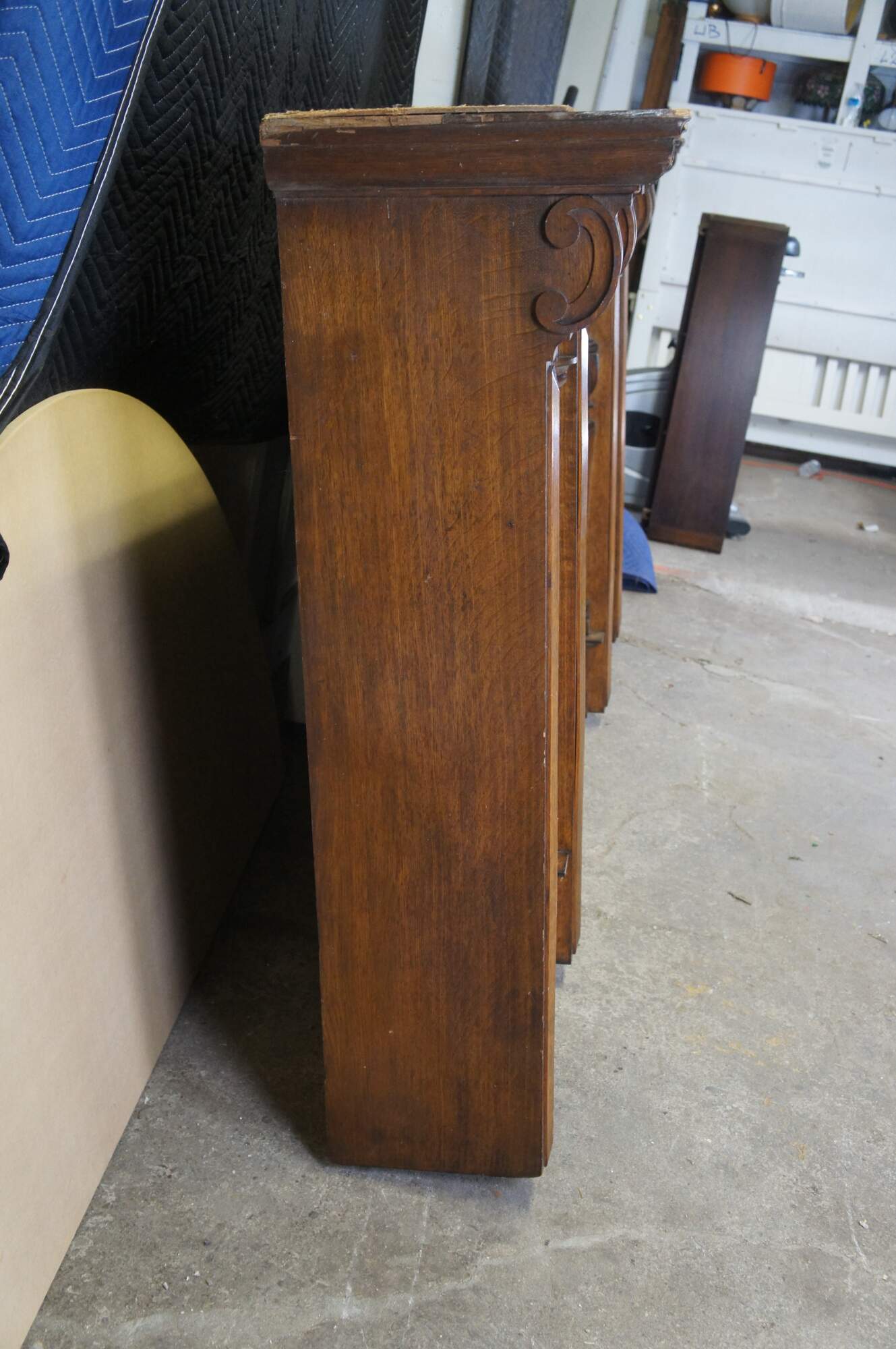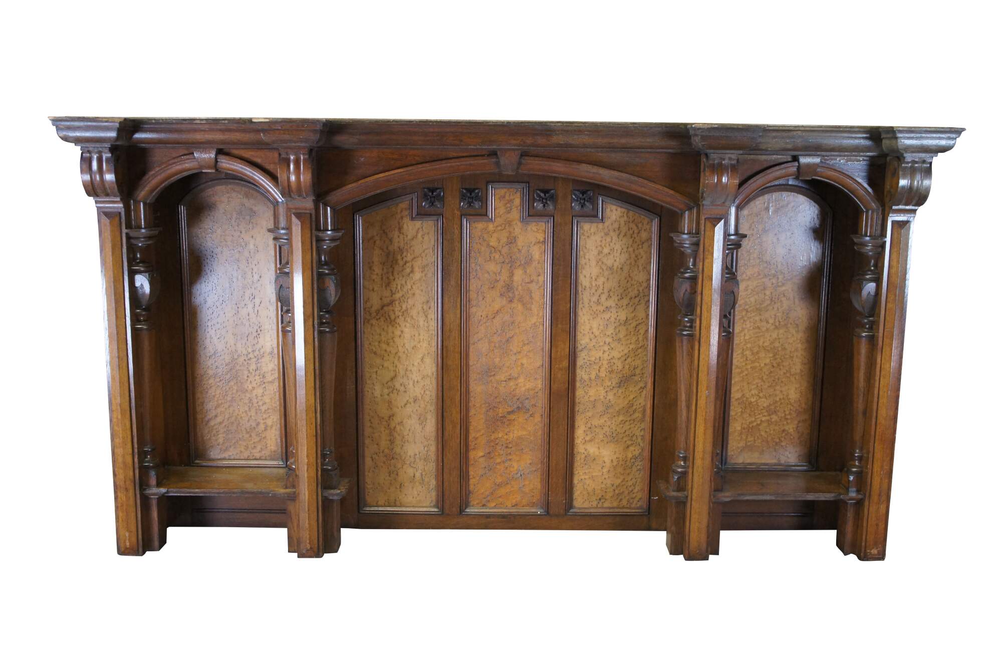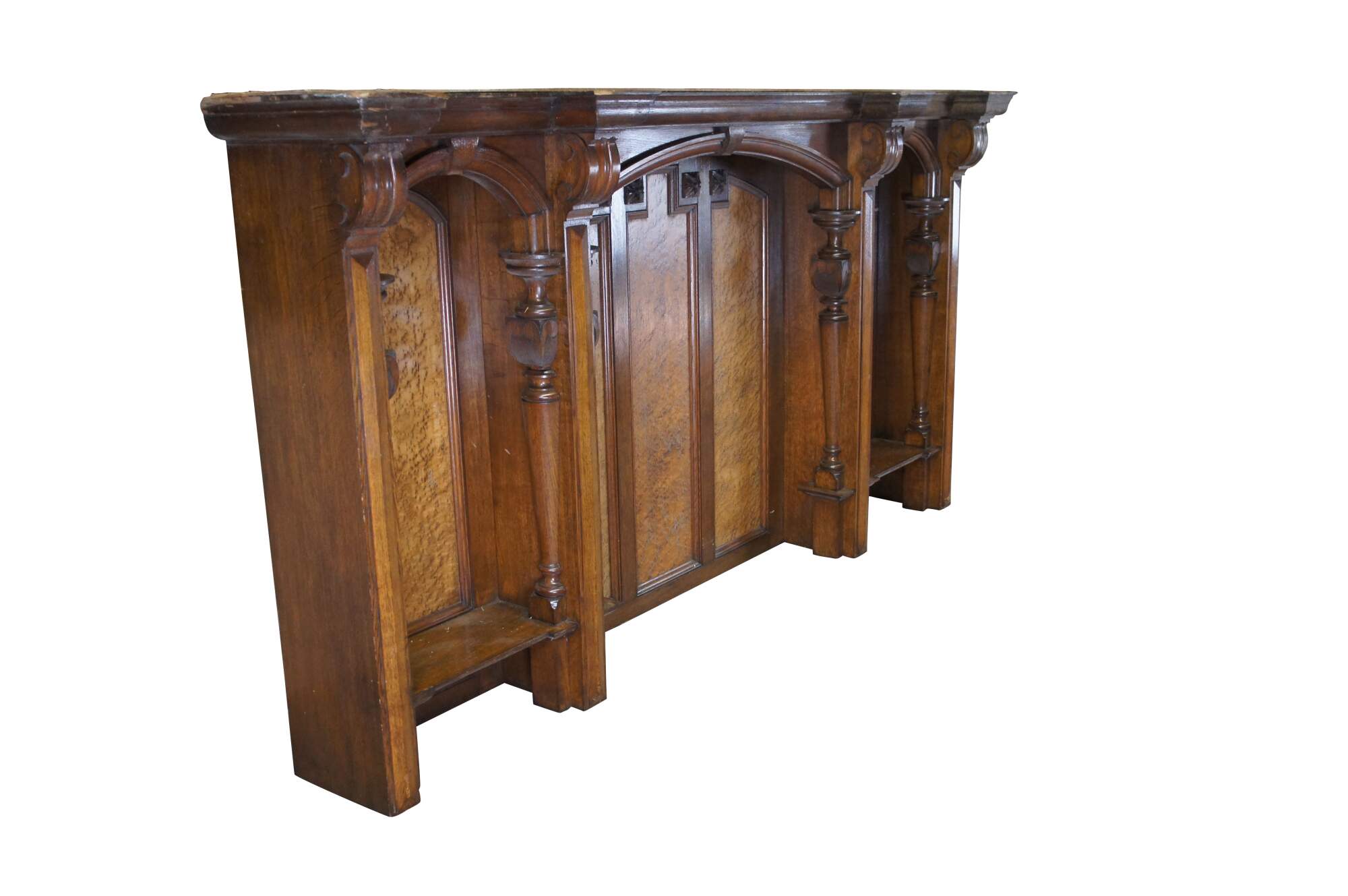 Large antique late 19th English Victorian reclaimed oak hutch. Features an arcaded front with partial turned and carved columns set around birdseye maple back panelling and 'C' scrolled spandrels along the top. Includes two shelves for display.