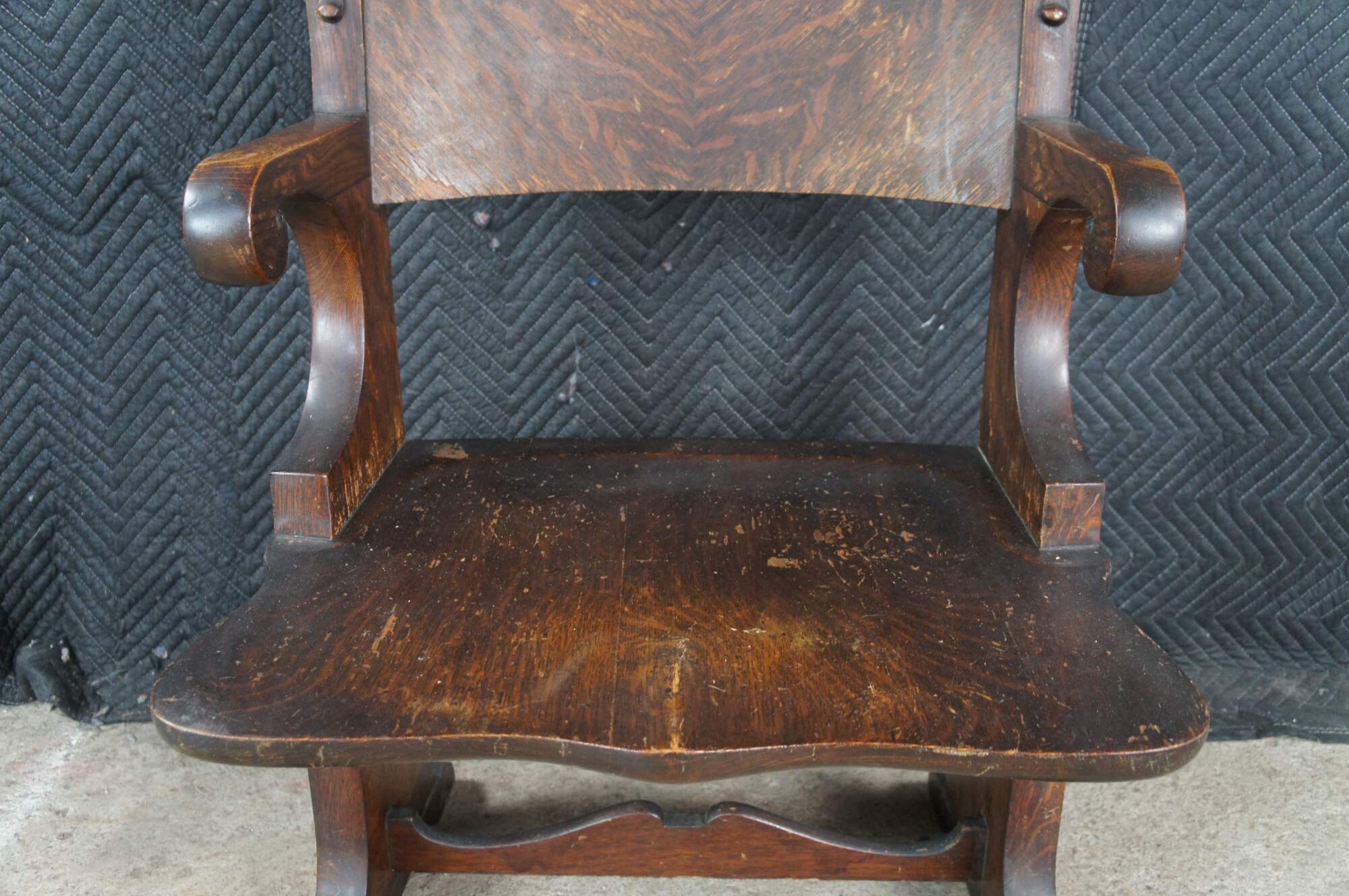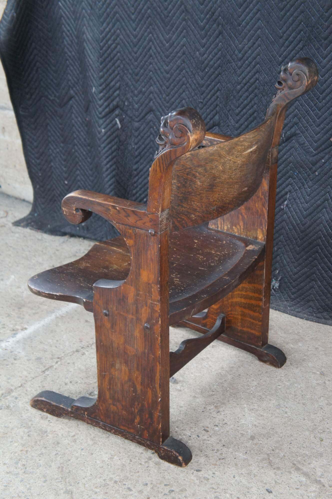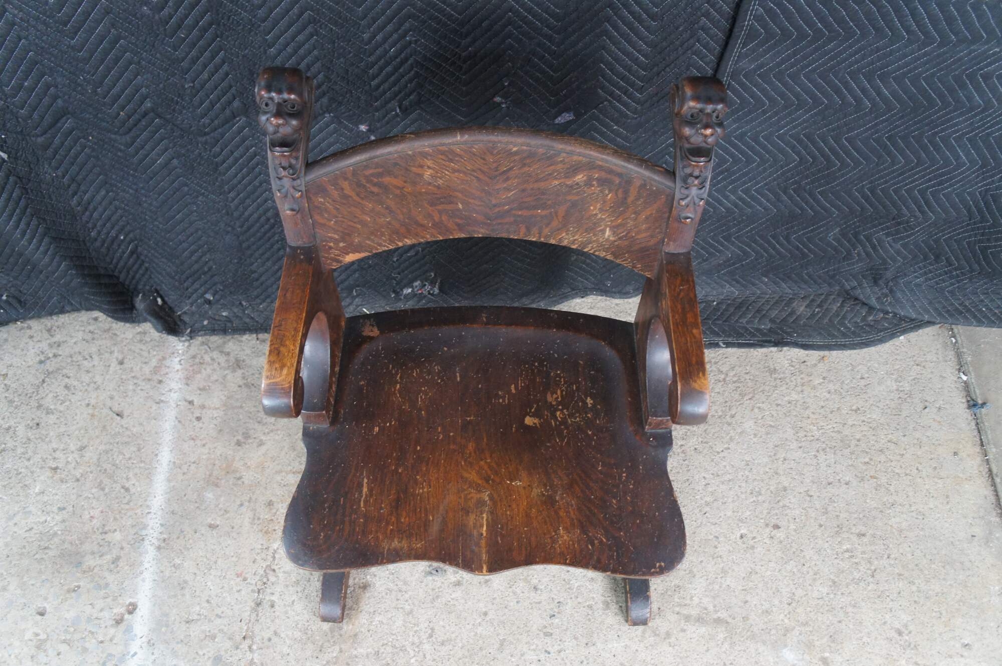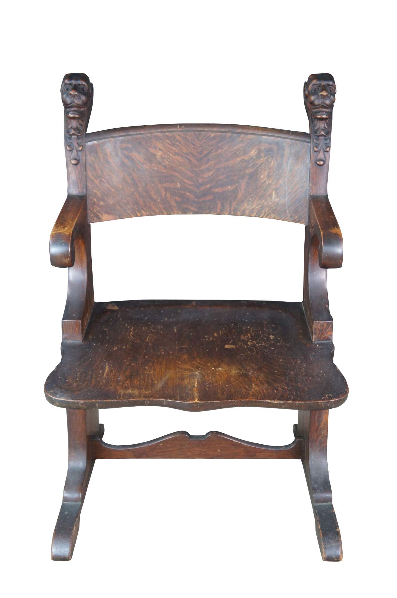 A spectacular antique 19th century American Victorian Arm Chair. Drawing inspiration from Renaissance Revival styling with grotesque face formed finials over a curved back, 'C' scrolled arms, a saddle seat and trestle form base. The perfect statement for any space.