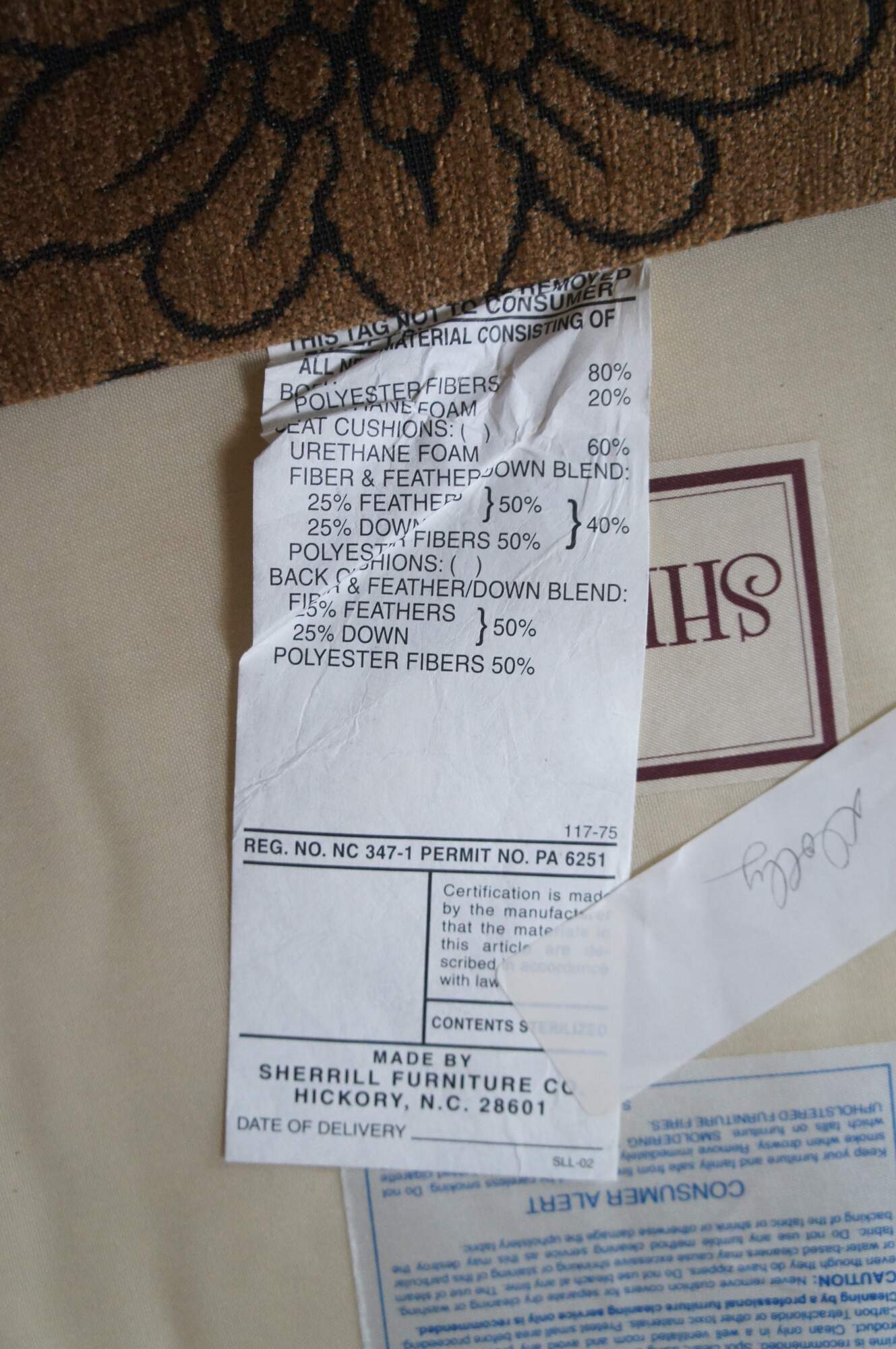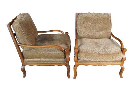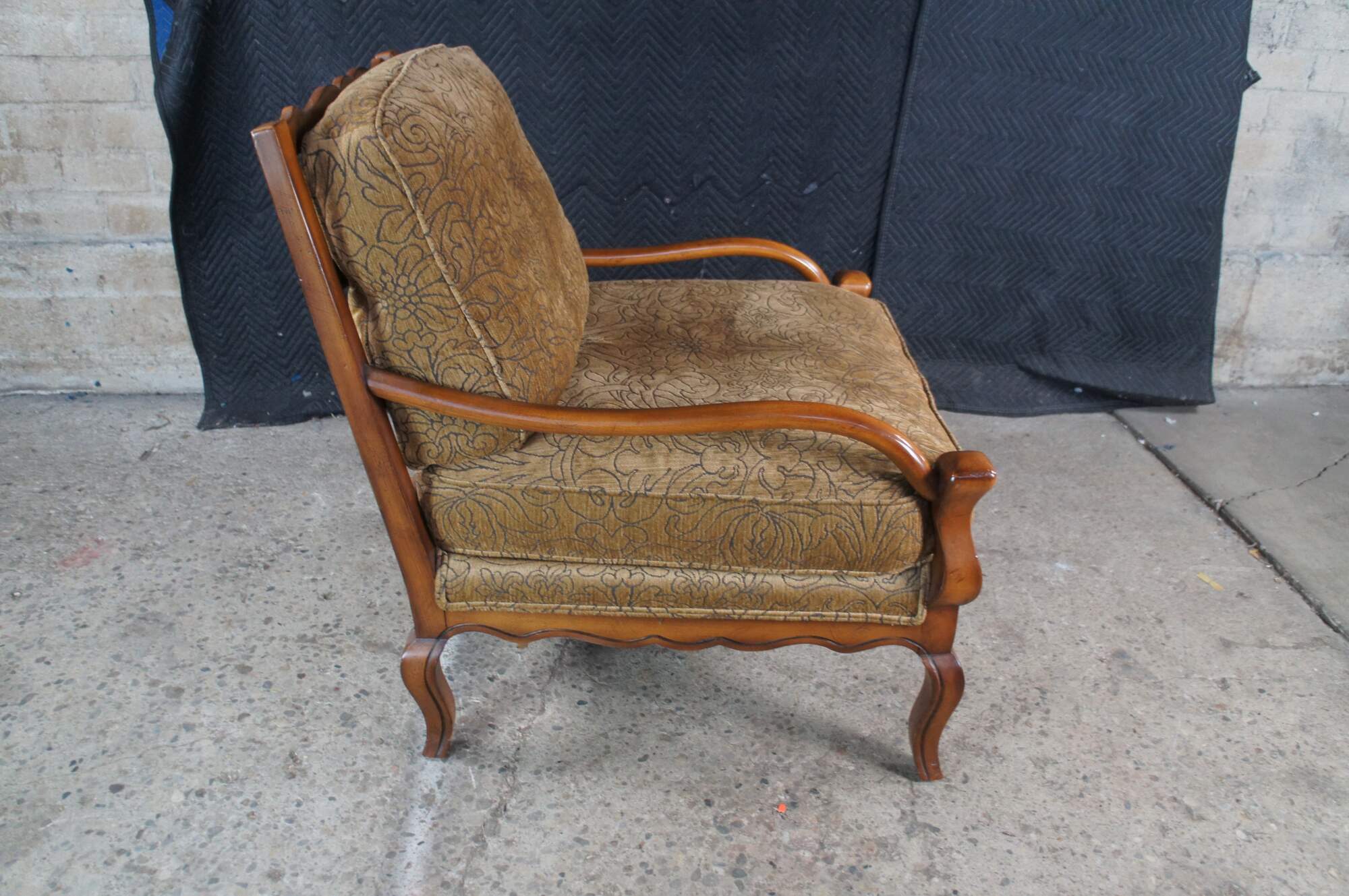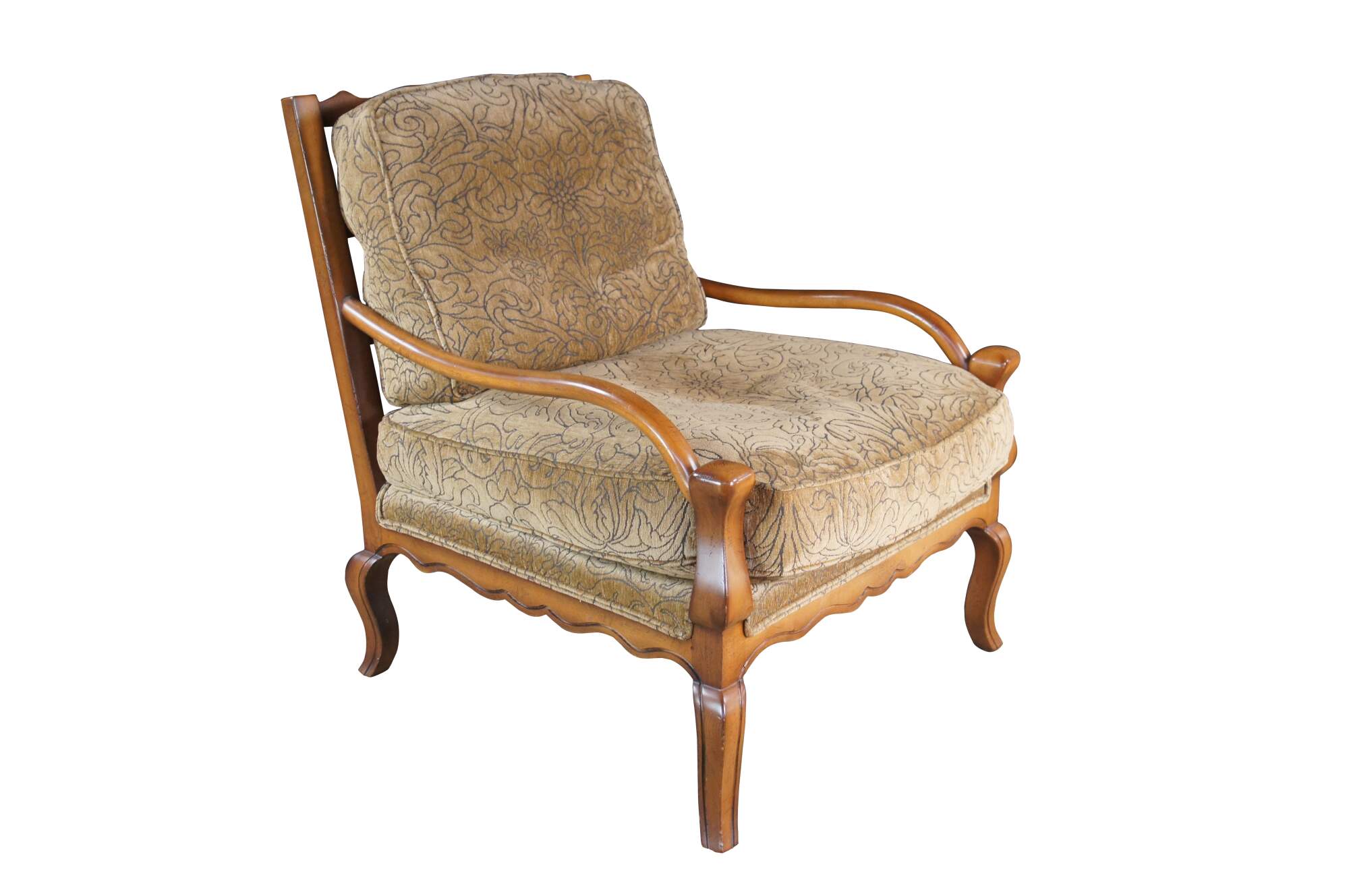 2 Late 20th Century Sherrill Oversized French Provincial Arm Chairs. Features a distressed hardwood frame with smooth sloping arms, ladderback, serpentine apron and cabriole legs. Upholstered in a gold floral brocade style fabric. Cushions are a blend of foam and down fill. A comfy addition to any setting.