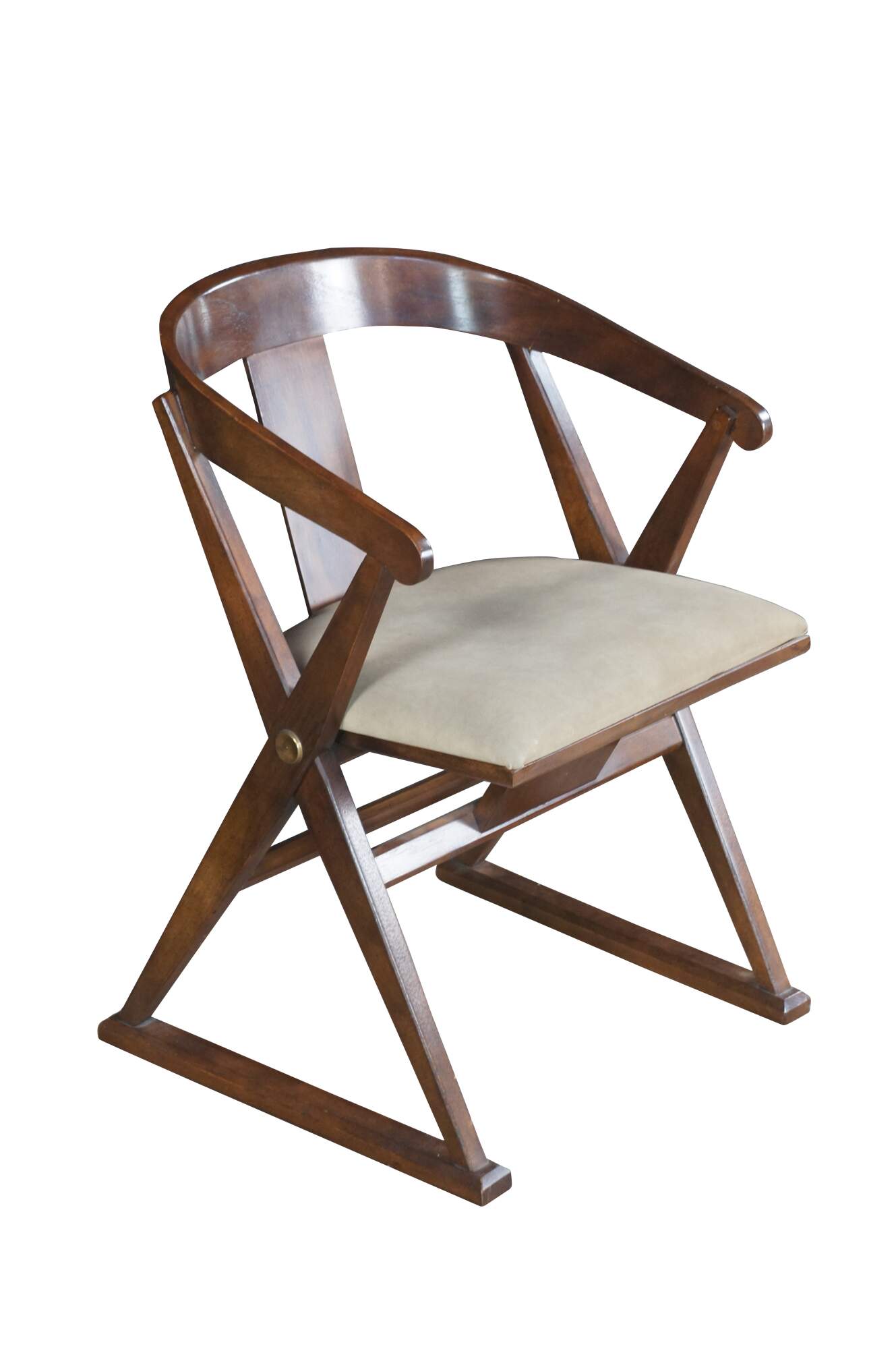 Drexel Heritage Campaign Style Arm Chair, circa 1970s. Features a distressed walnut finish with a curved back and 'x' frame with round brass medallion. Tag along underside.