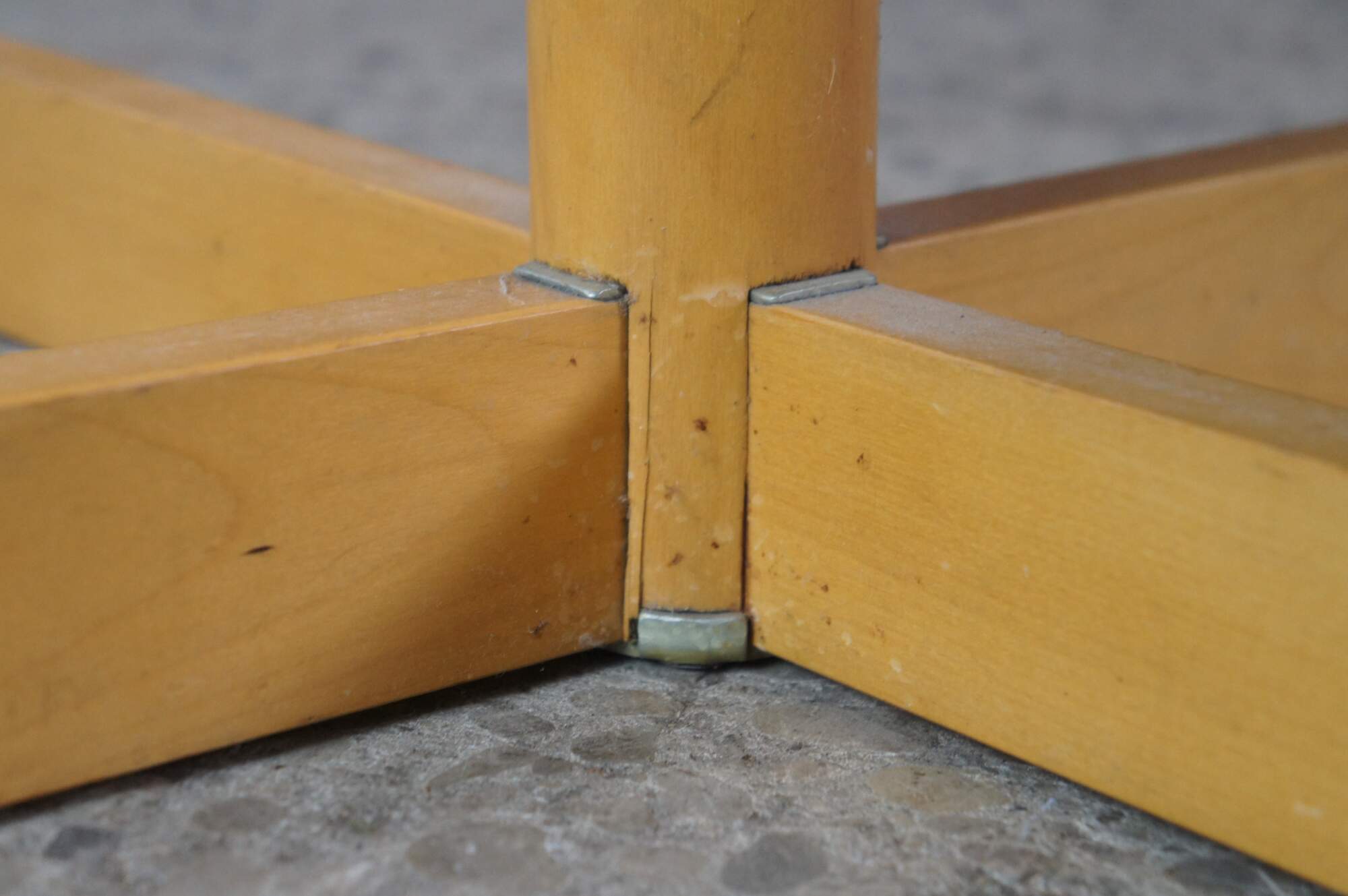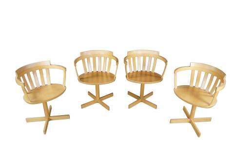 Set of 4 Swedish Modern swivel arm chairs by Sune Fromell & Jan Hallberg for Edsby Verken, circa 1960s. Features a birch frame with a barrel back and vertical slat back over an oval seat. Each chair is supported by a round column leading to an x form base. Marked along underside.