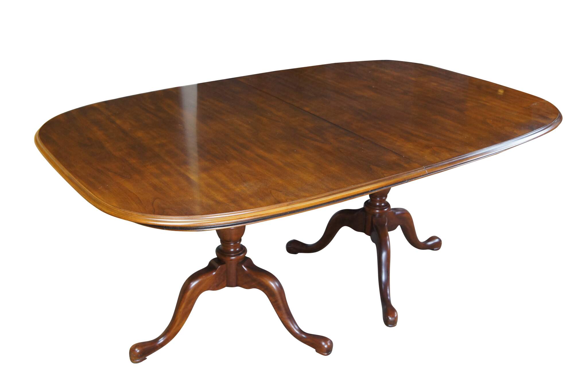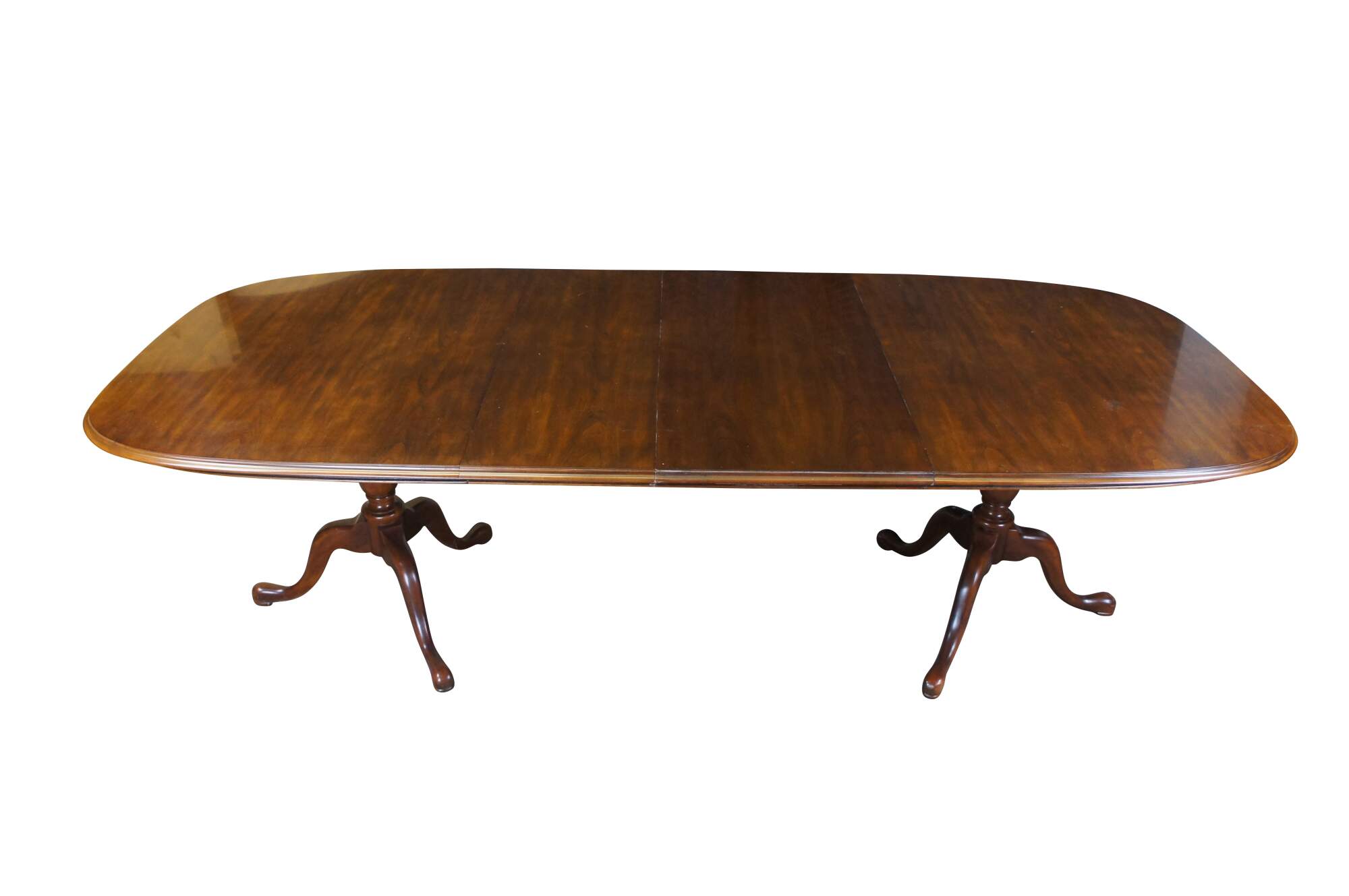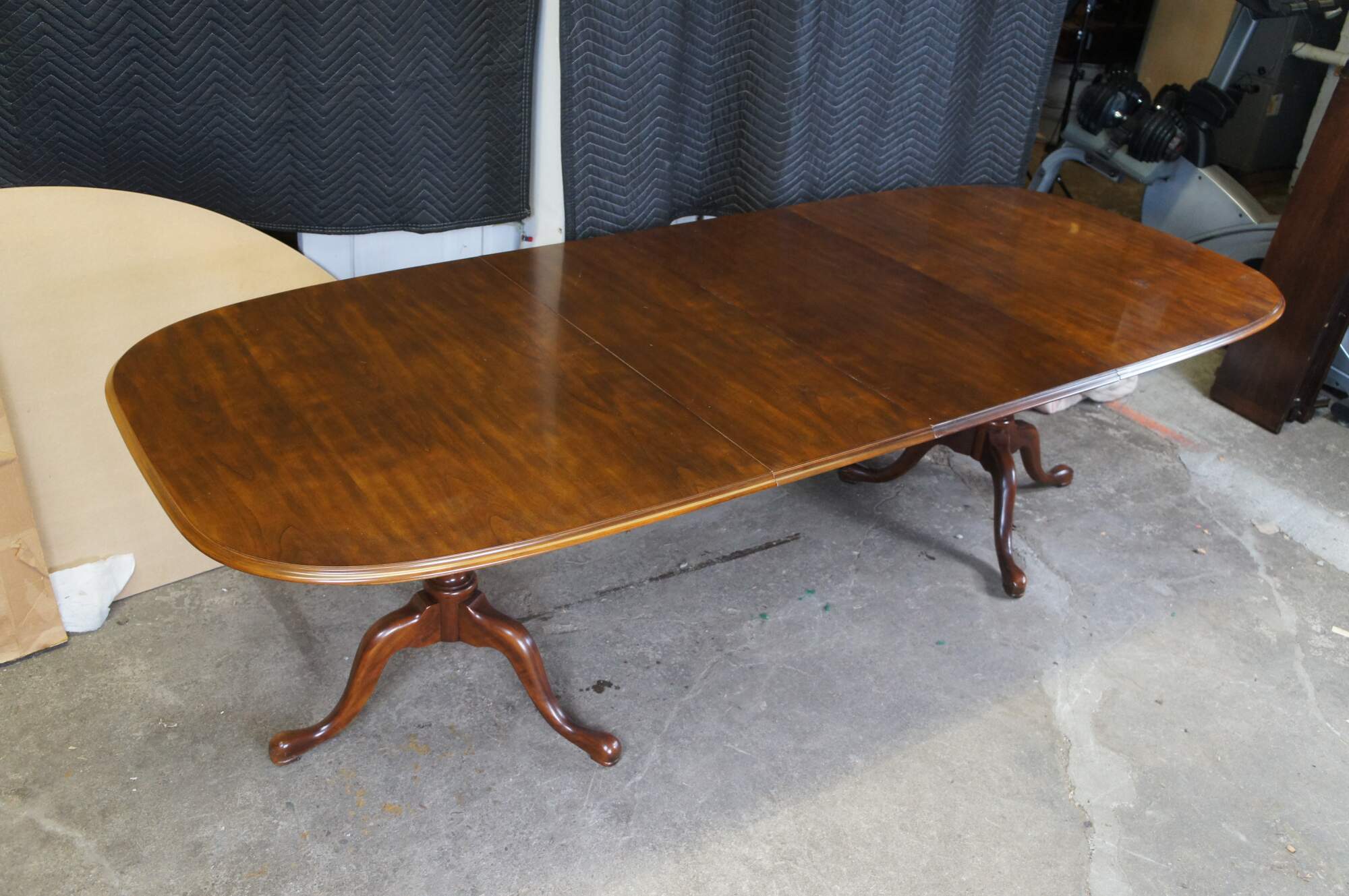 Vintage 1987 Drexel Furniture dining table featuring oval form with two extendable leaves, supported by a double pedestal base with slipper feet.
