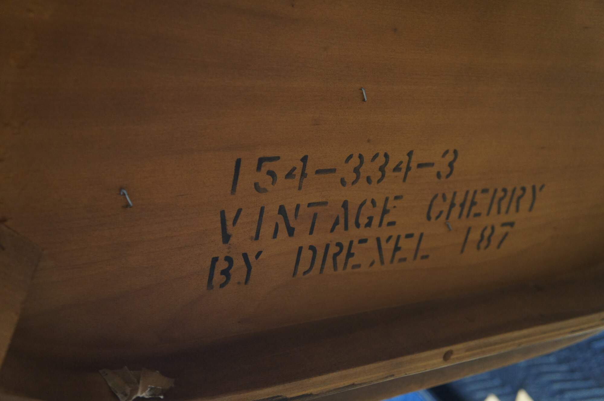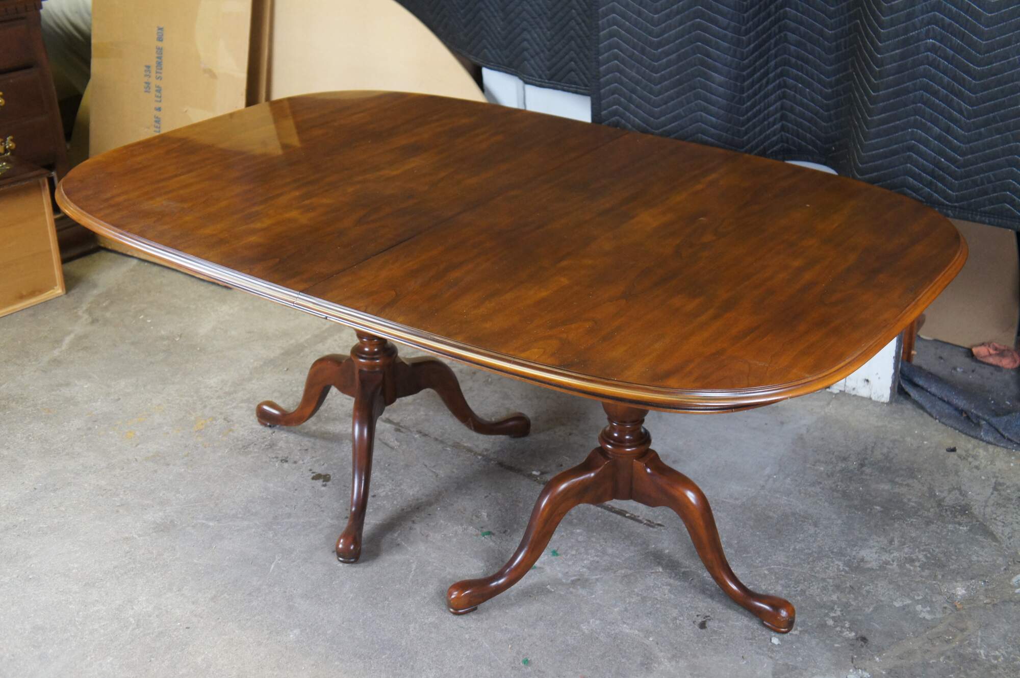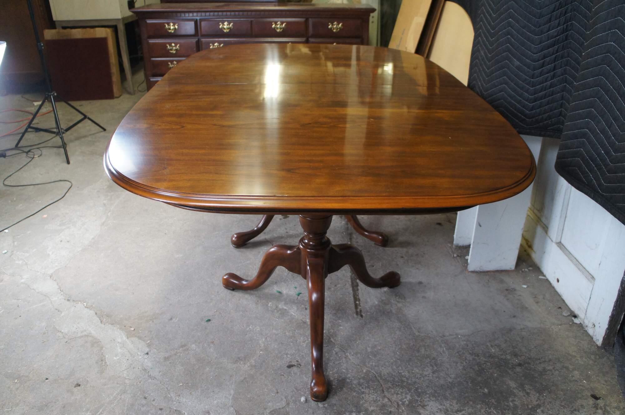 Vintage 1987 Drexel Furniture dining table featuring oval form with two extendable leaves, supported by a double pedestal base with slipper feet.