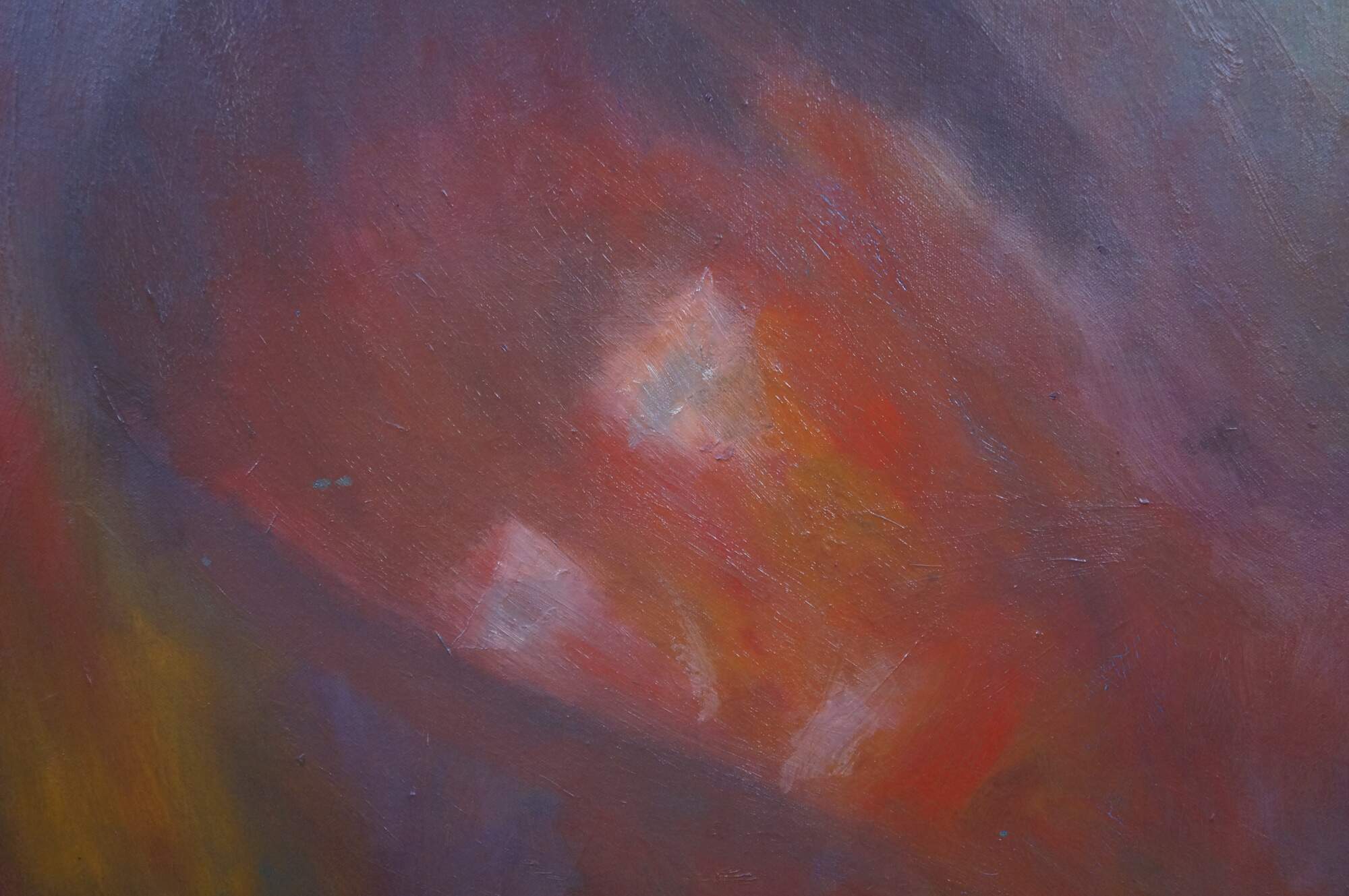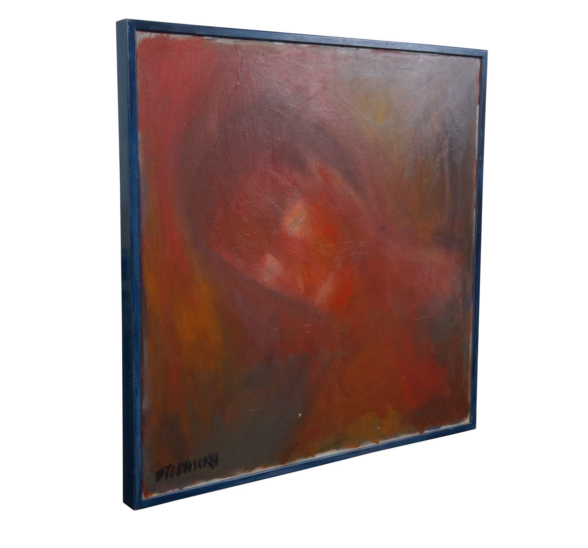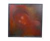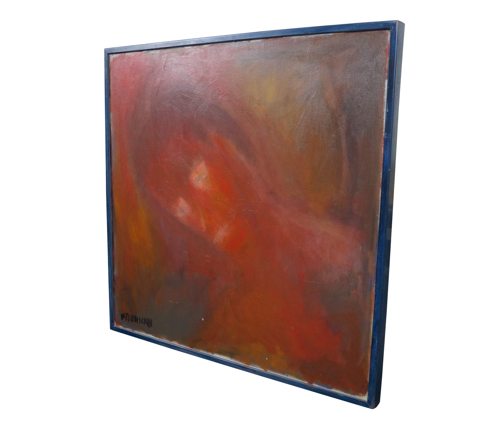 Late 20th century expressionist oil painting on canvas depicting a woman's face in a sea of mottled reds and oranges. signed, lower left by Dayton Ohio artist Jim Studnicka. Blue painted wood frame.