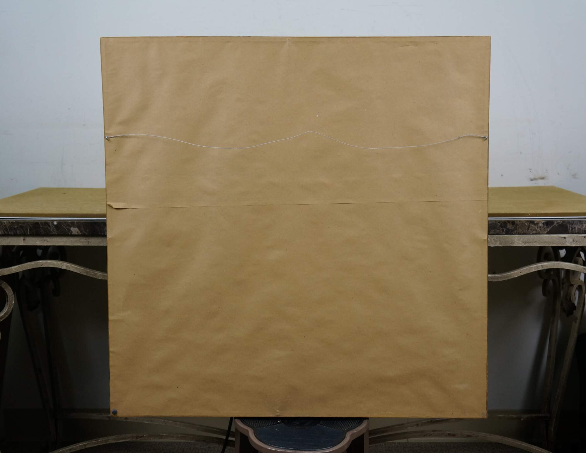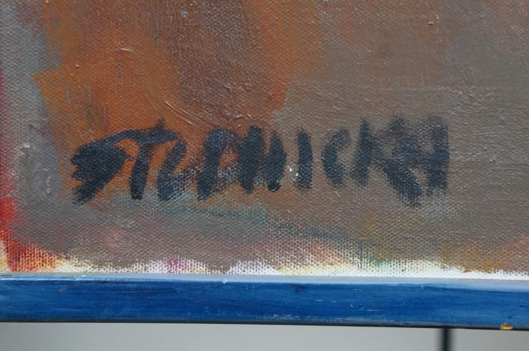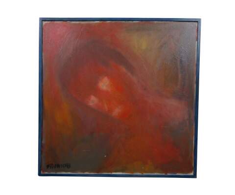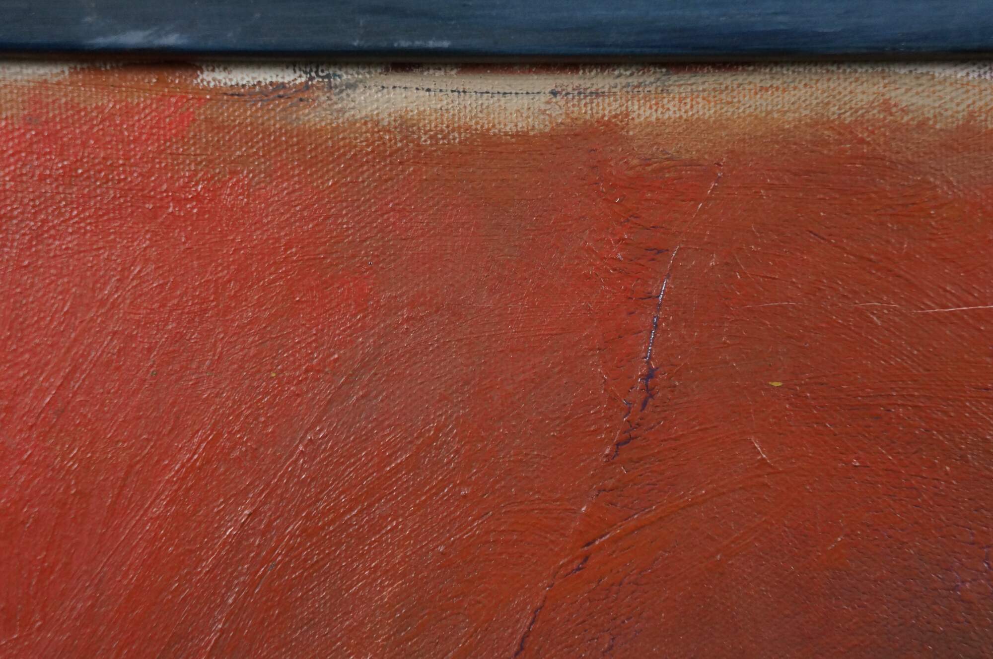 Late 20th century expressionist oil painting on canvas depicting a woman's face in a sea of mottled reds and oranges. signed, lower left by Dayton Ohio artist Jim Studnicka. Blue painted wood frame.