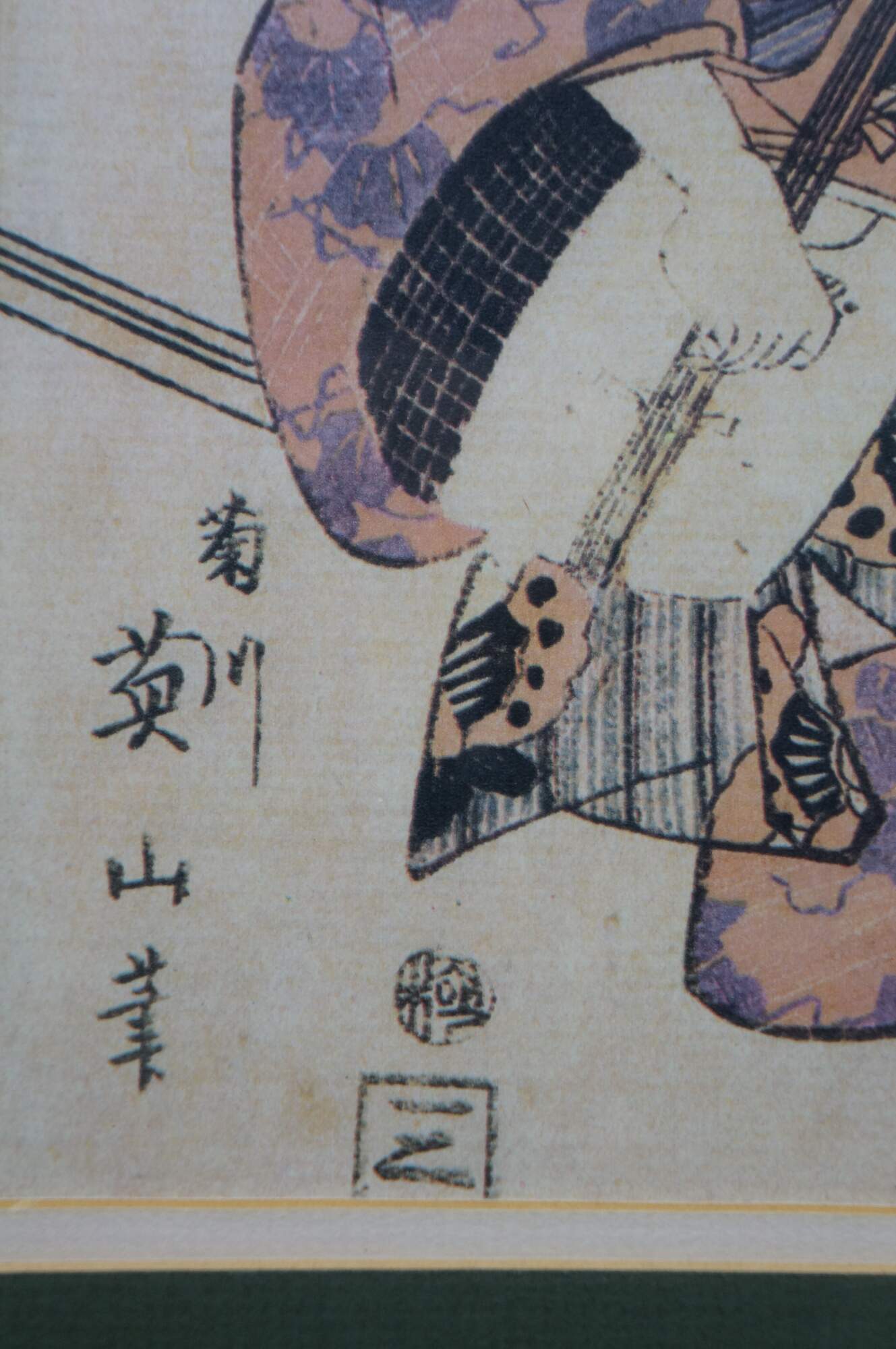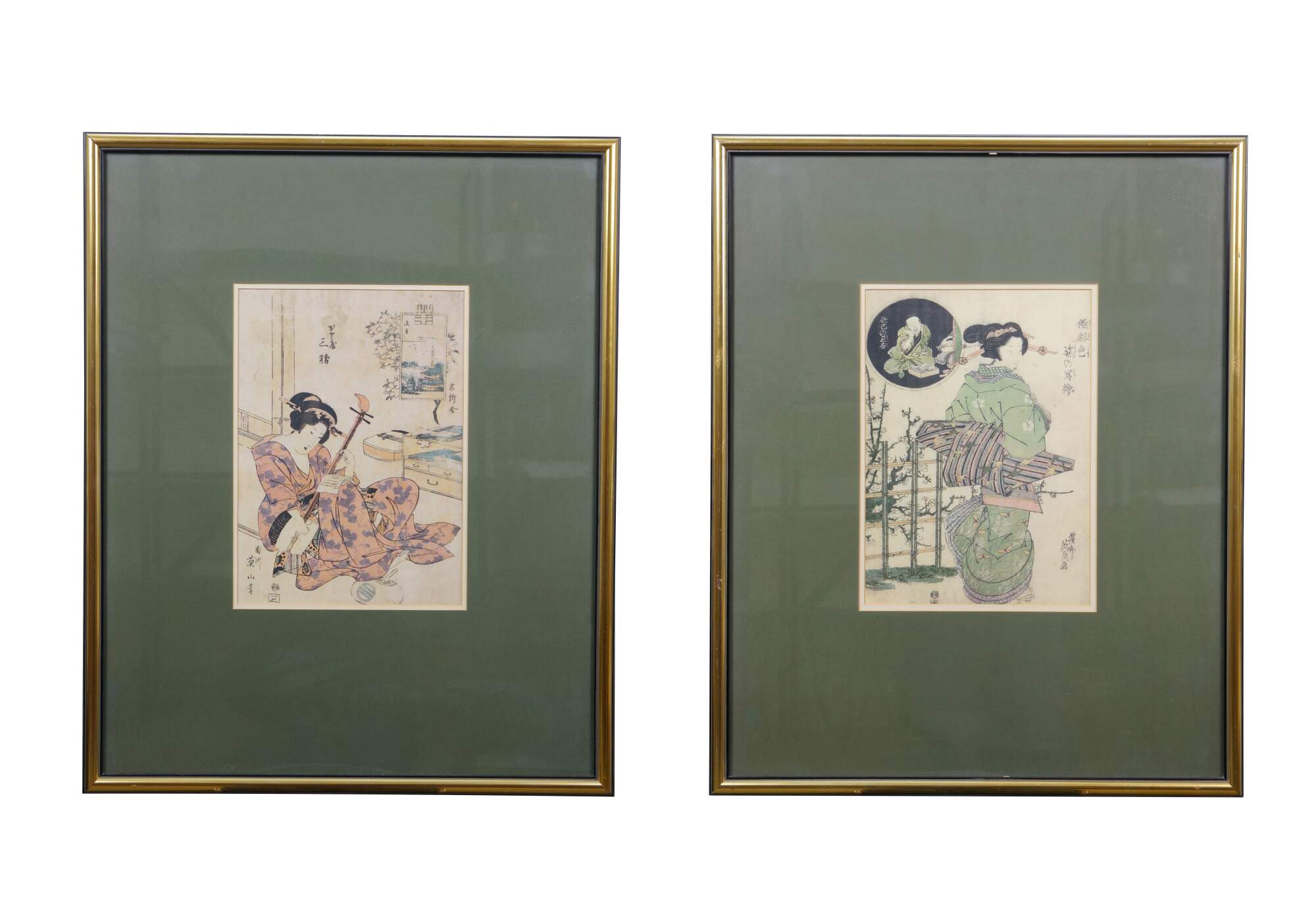Pair of vintage 20th century Japanese woodblock prints after ukiyo-e style art of geishas / courtesans by Kikukawa Eizan. One shows a seated courtesan in a pink floral kimono playing music on a shamisen. The other shows a courtesan in green with a striped sash, walking and turning her head over her shoulder; a gentleman admirer is shown picture-in-picture in the upper corner. Black and gold composite frames; green mat.