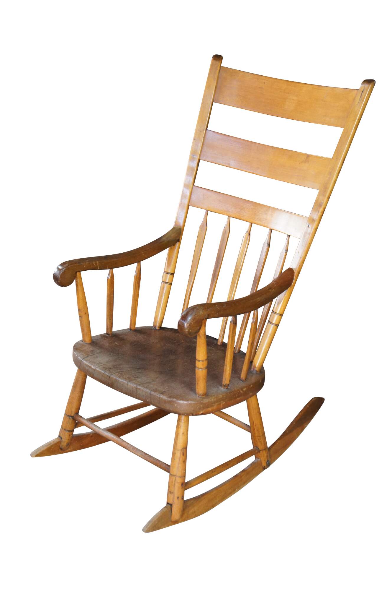 Antique Early American Country Farmhouse Windsor arm chair rocker. Made of maple featuring a primitive slatted ladderback design.