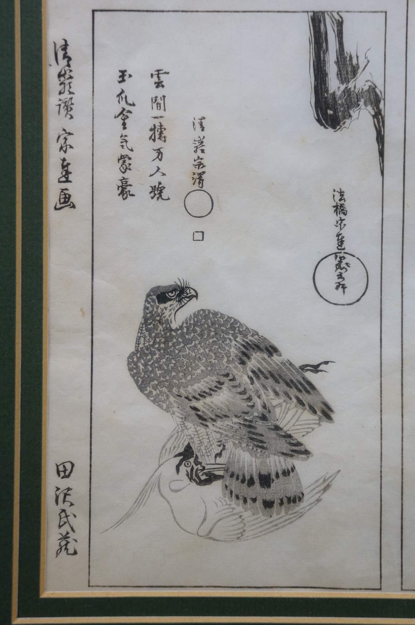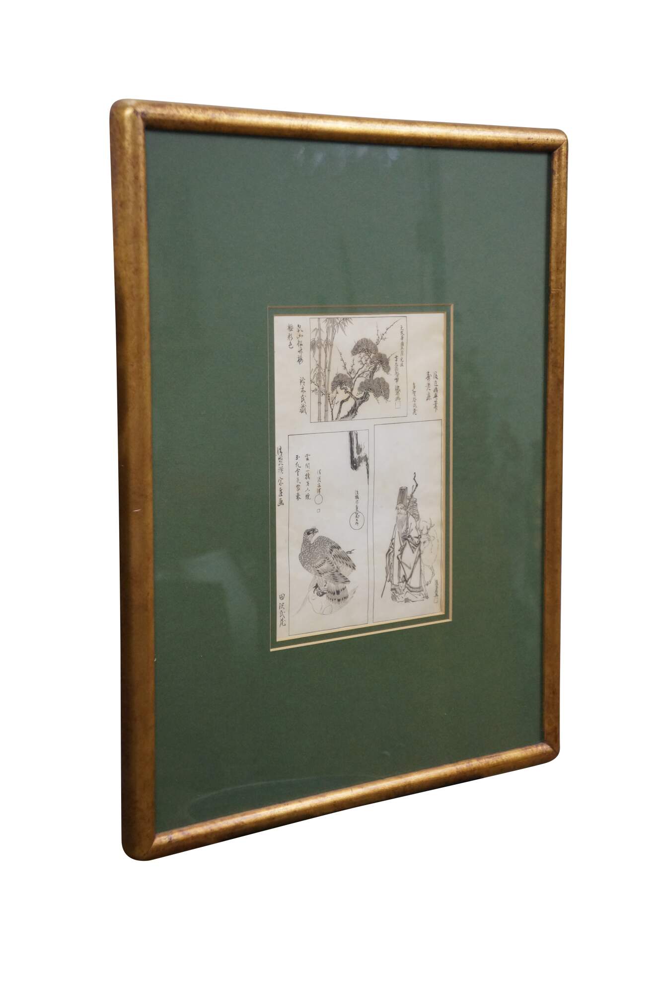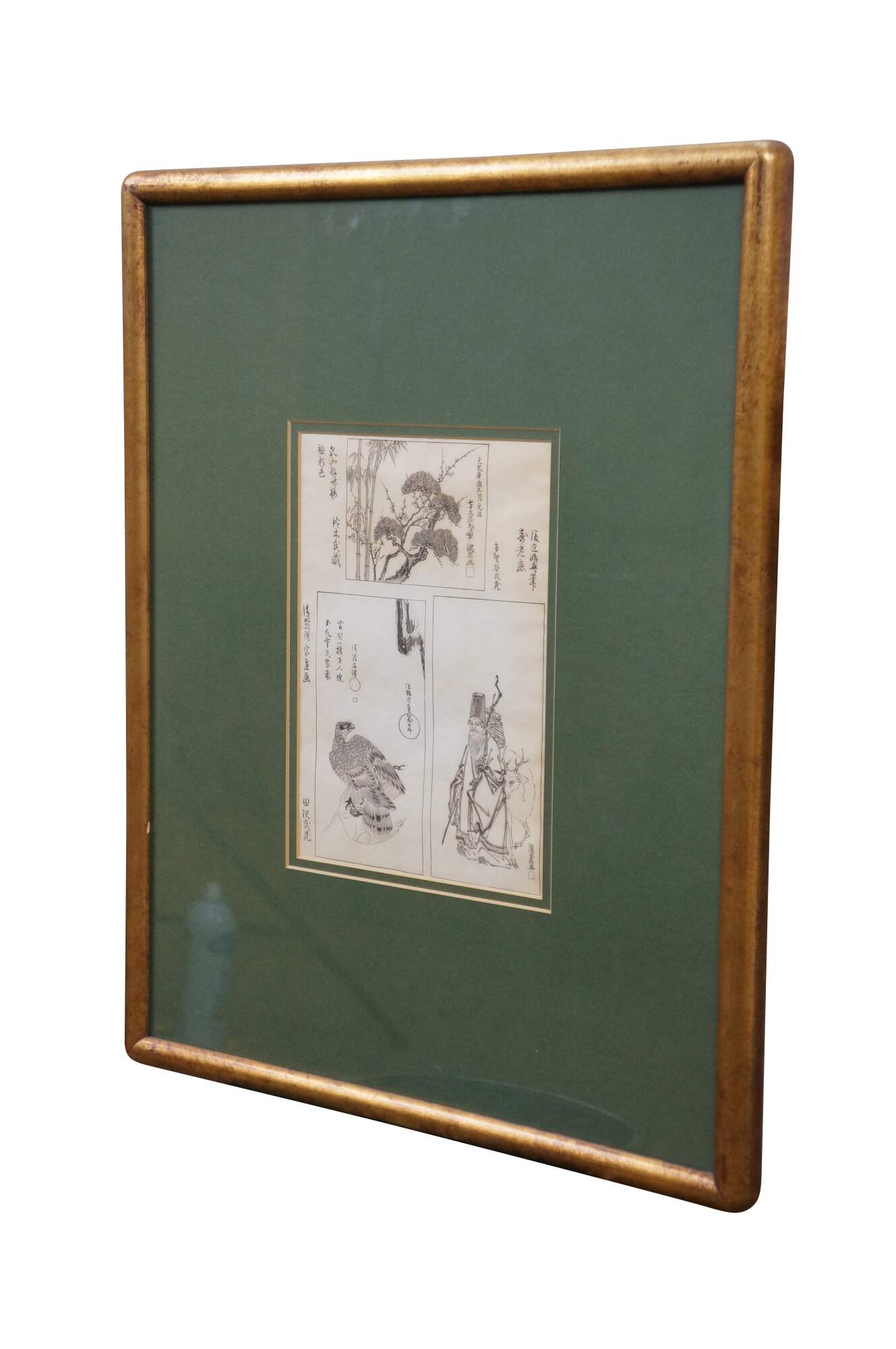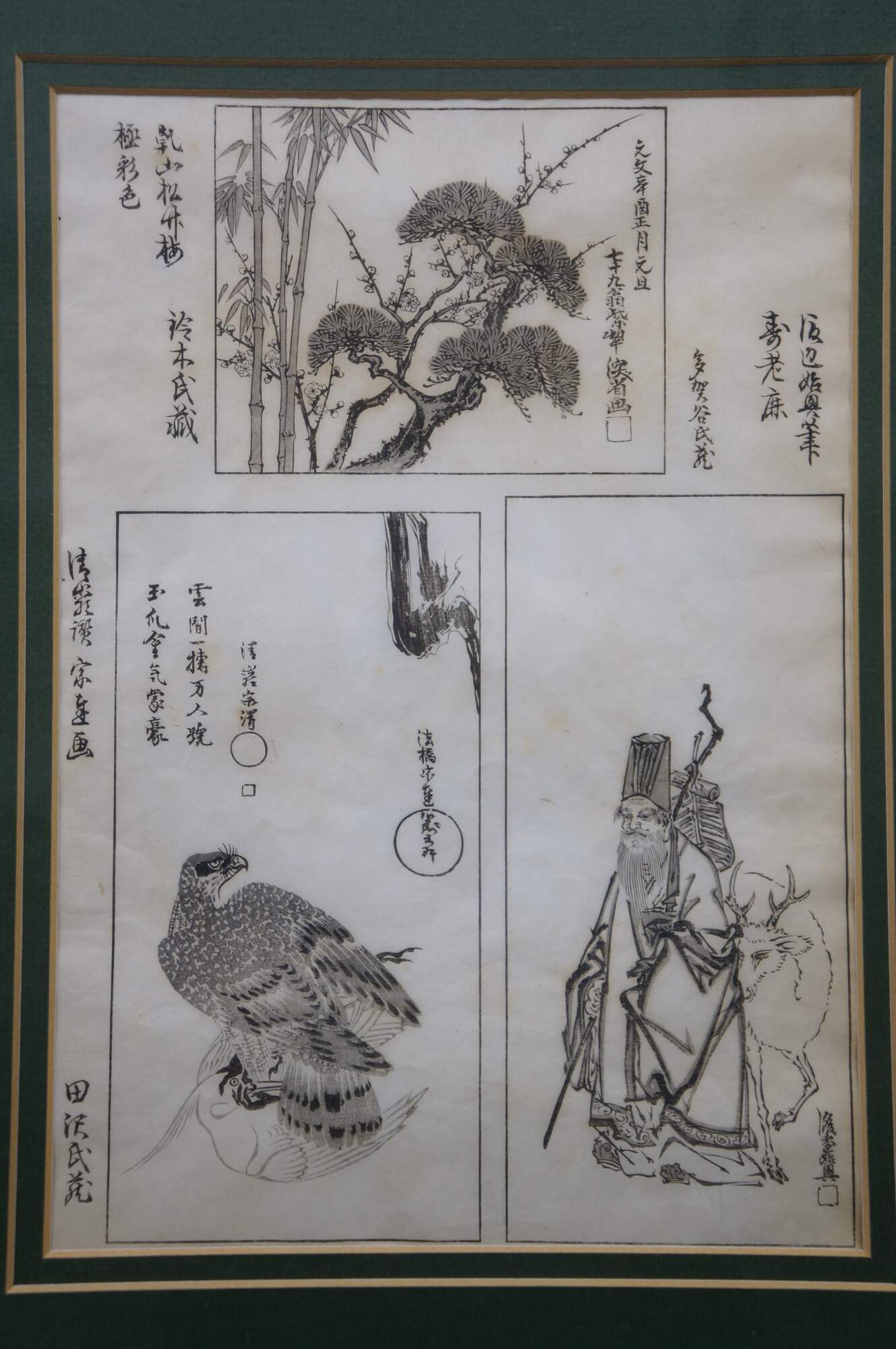Circa mid 19th century ukiyo-e Japanese woodblock print in black and white featuring a trio of panels showing a stand of bamboo and gnarled pine, a falcon / hawk attacking a Crane / Phoenix, and Jurojin - God of wisdom and longevity with his messenger deer. Giltwood frame; green mat.