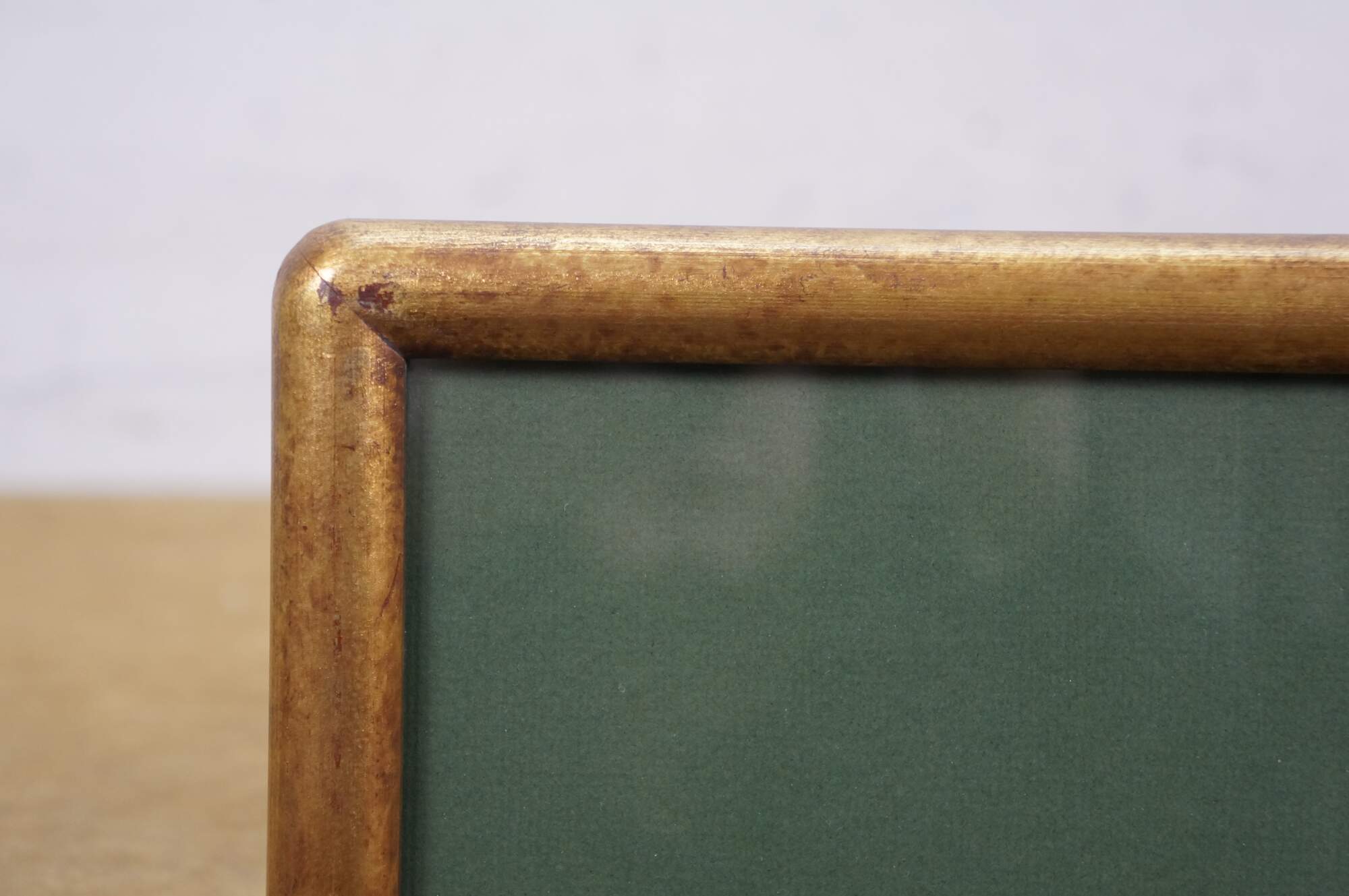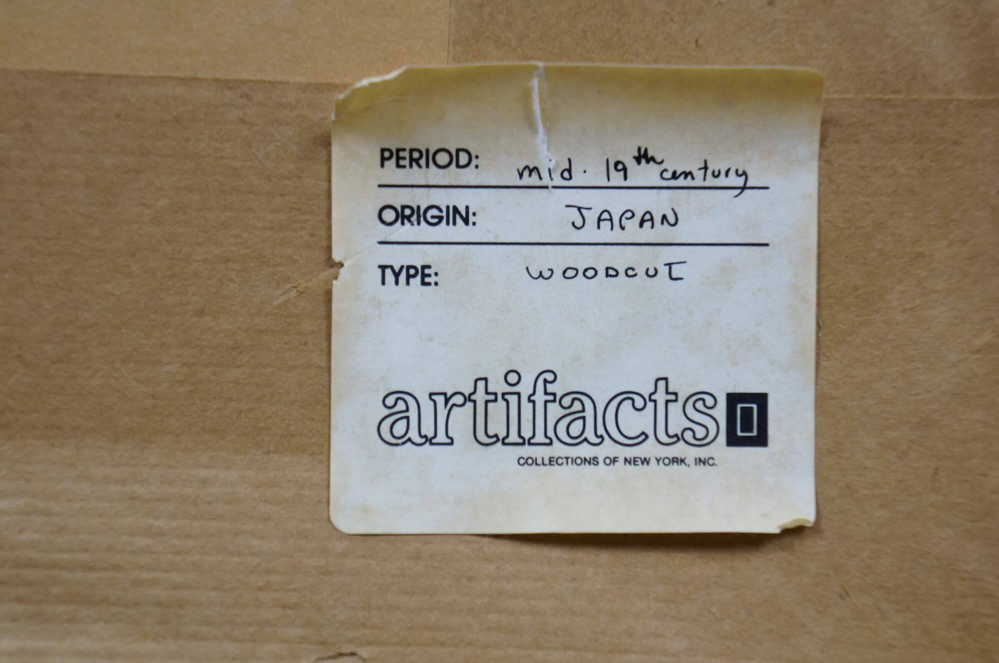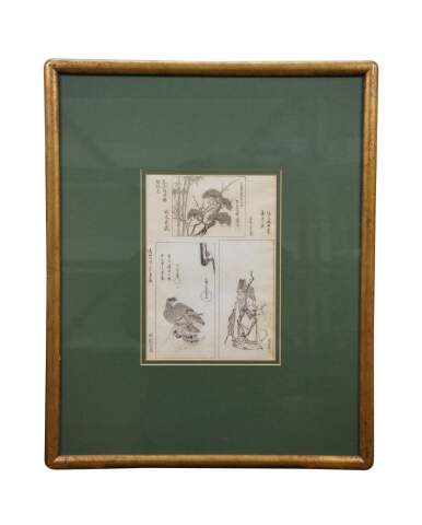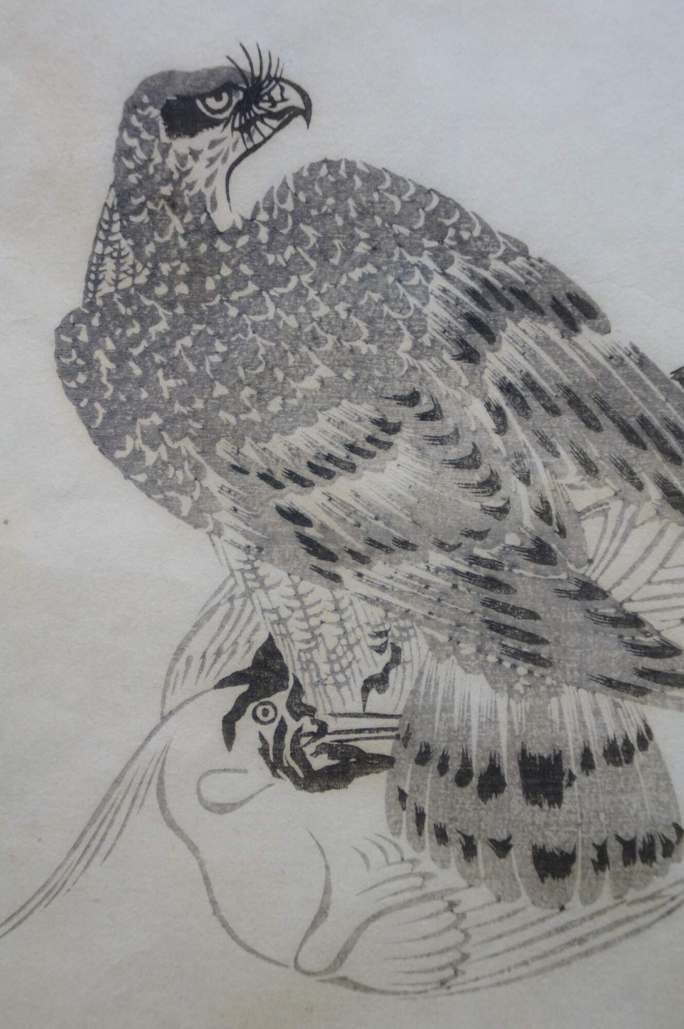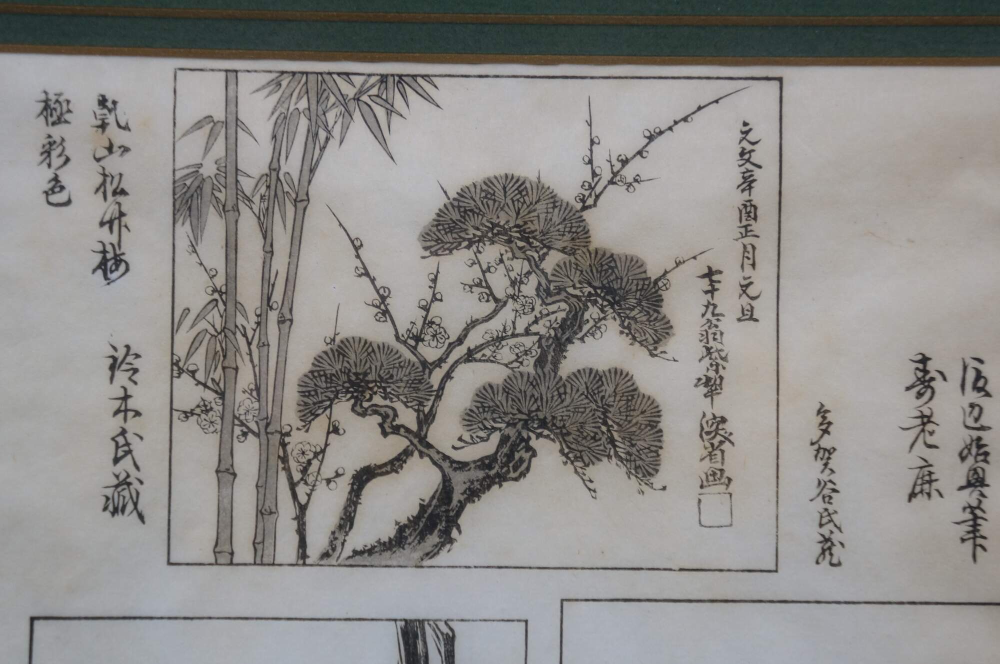 Circa mid 19th century ukiyo-e Japanese woodblock print in black and white featuring a trio of panels showing a stand of bamboo and gnarled pine, a falcon / hawk attacking a Crane / Phoenix, and Jurojin - God of wisdom and longevity with his messenger deer. Giltwood frame; green mat.