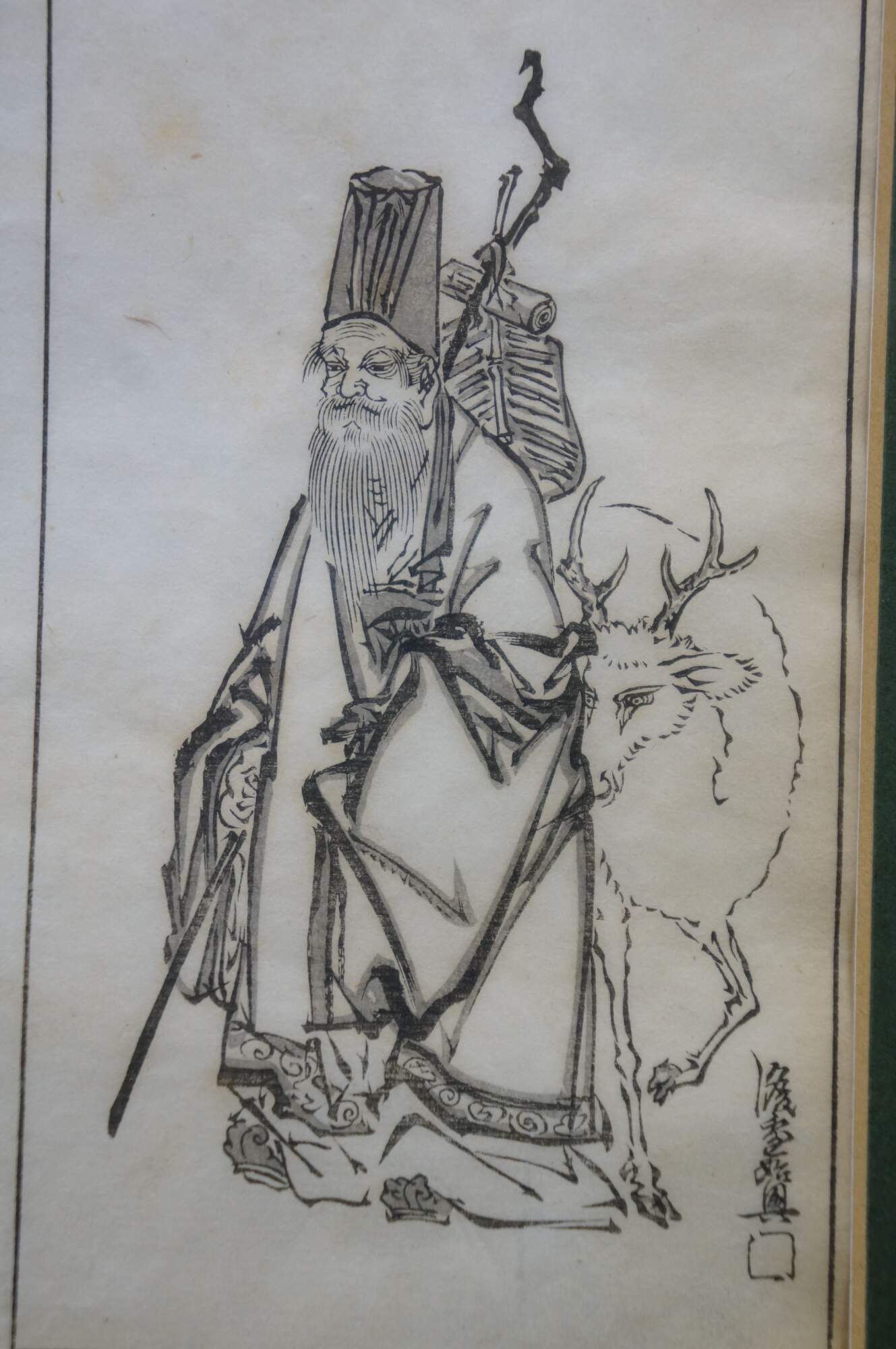 Jurōjin and the deer together represent longevity, wisdom, and natural harmony. Jurōjin is the Japanese god of longevity, who carries a scroll with the lifespan of all living things, while the deer is his messenger and a symbol of long life. They symbolize peaceful aging and living a life in harmony with nature.