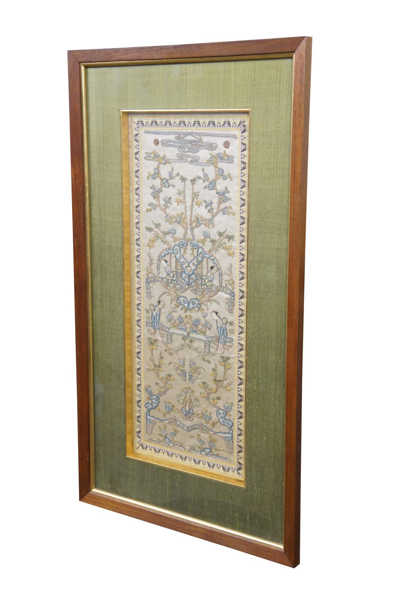 Circa late 19th century Chinese embroidered silk robe sleeve panel featuring a symmetrical design showing a garden landscape with bridge, plant table, trees, and Geishas figures, in shades of blue, pale rose pink, green, and gold. Features the "forbidden stitch" - an intricate, raised embroidery stitch commonly found on textiles from the Qing Dynasty (1644—1911). Wood frame; green silk mat.