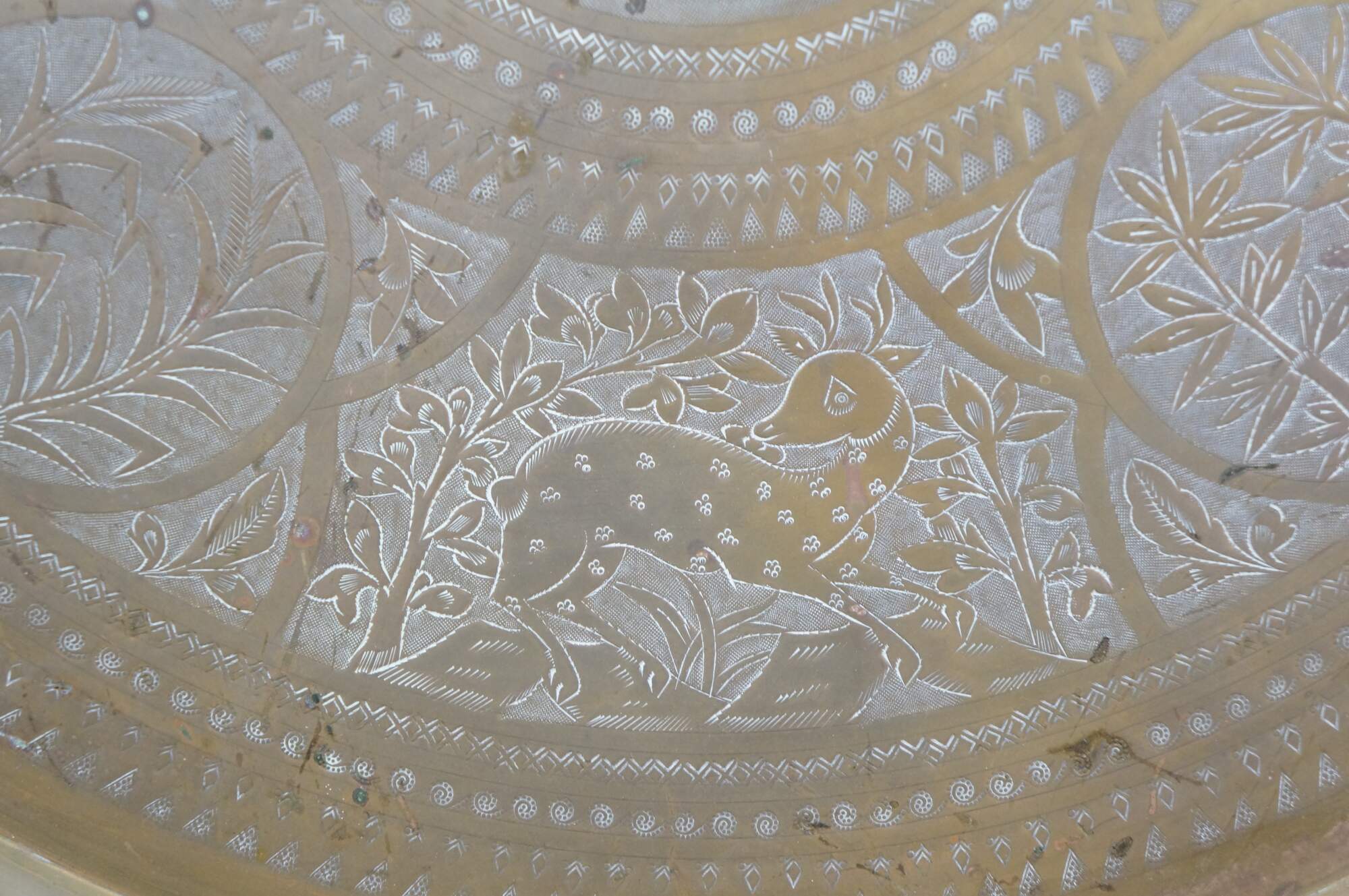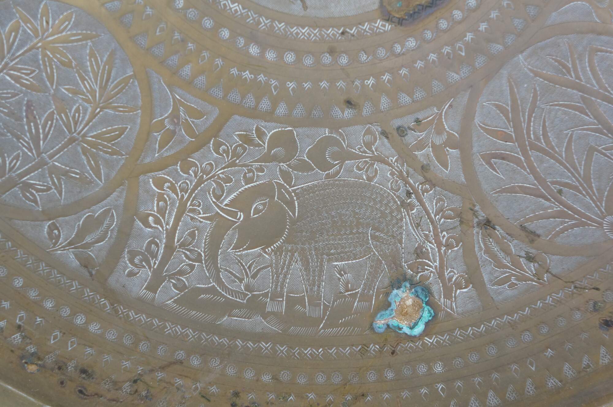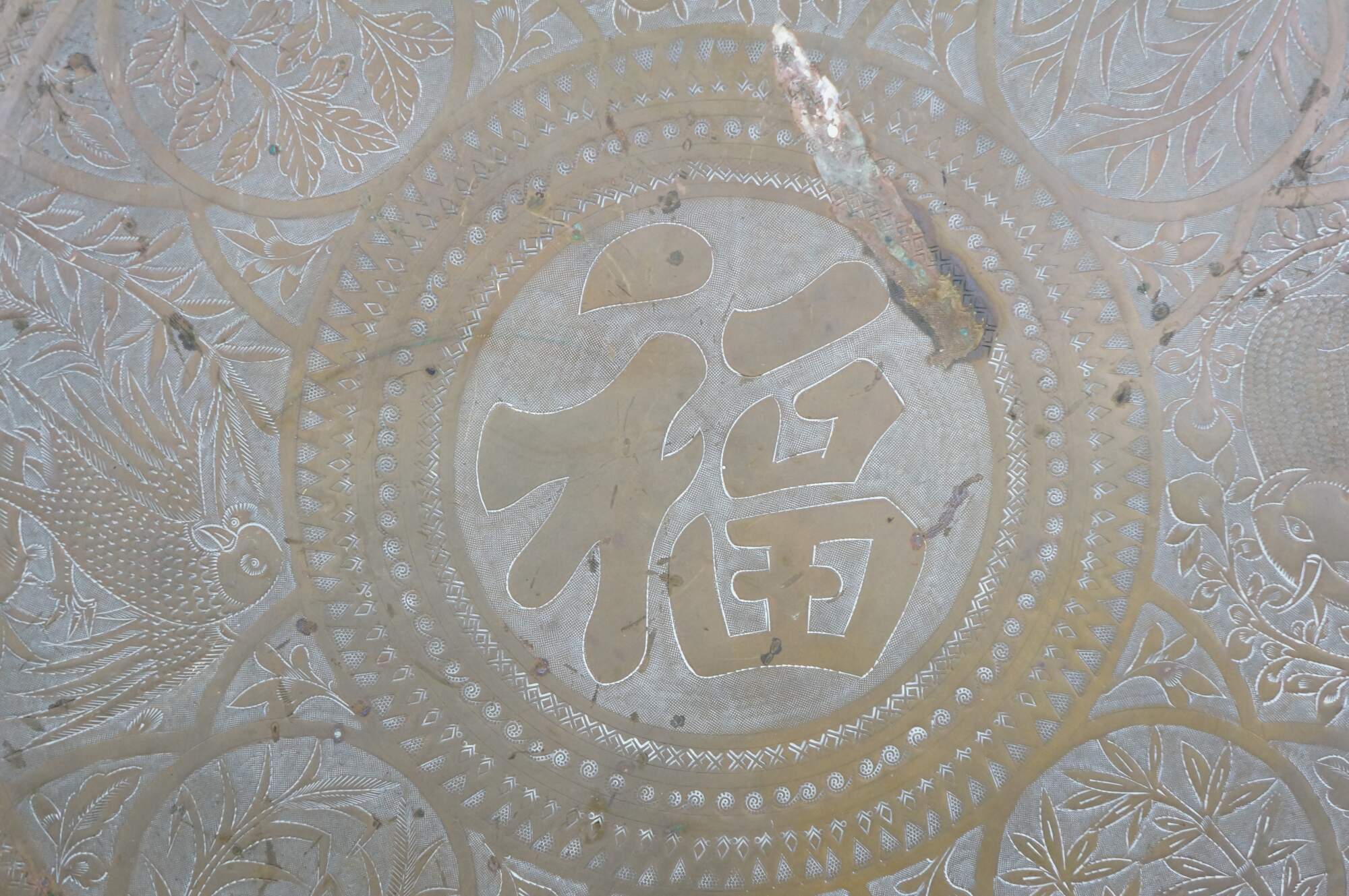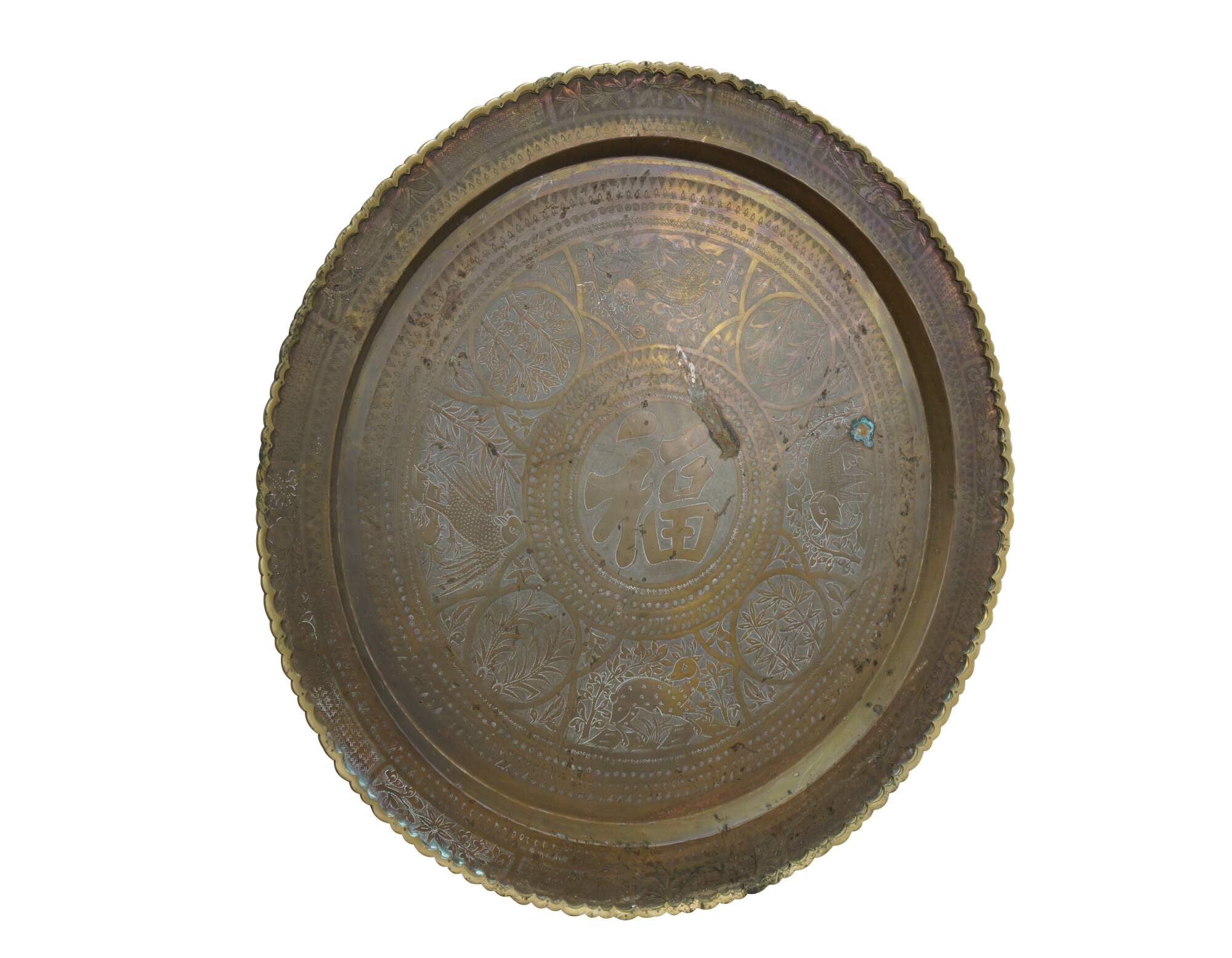 Large 20th century round brass tray with lightly scalloped edge, decorated with a Chinese fu symbol of good fortune, surrounded by flowers and a variety of animals including an elephant, deer, bird and fox (?). Ring on back for hanging as a wall display. Could also be set on a folding stand for use as a side table.