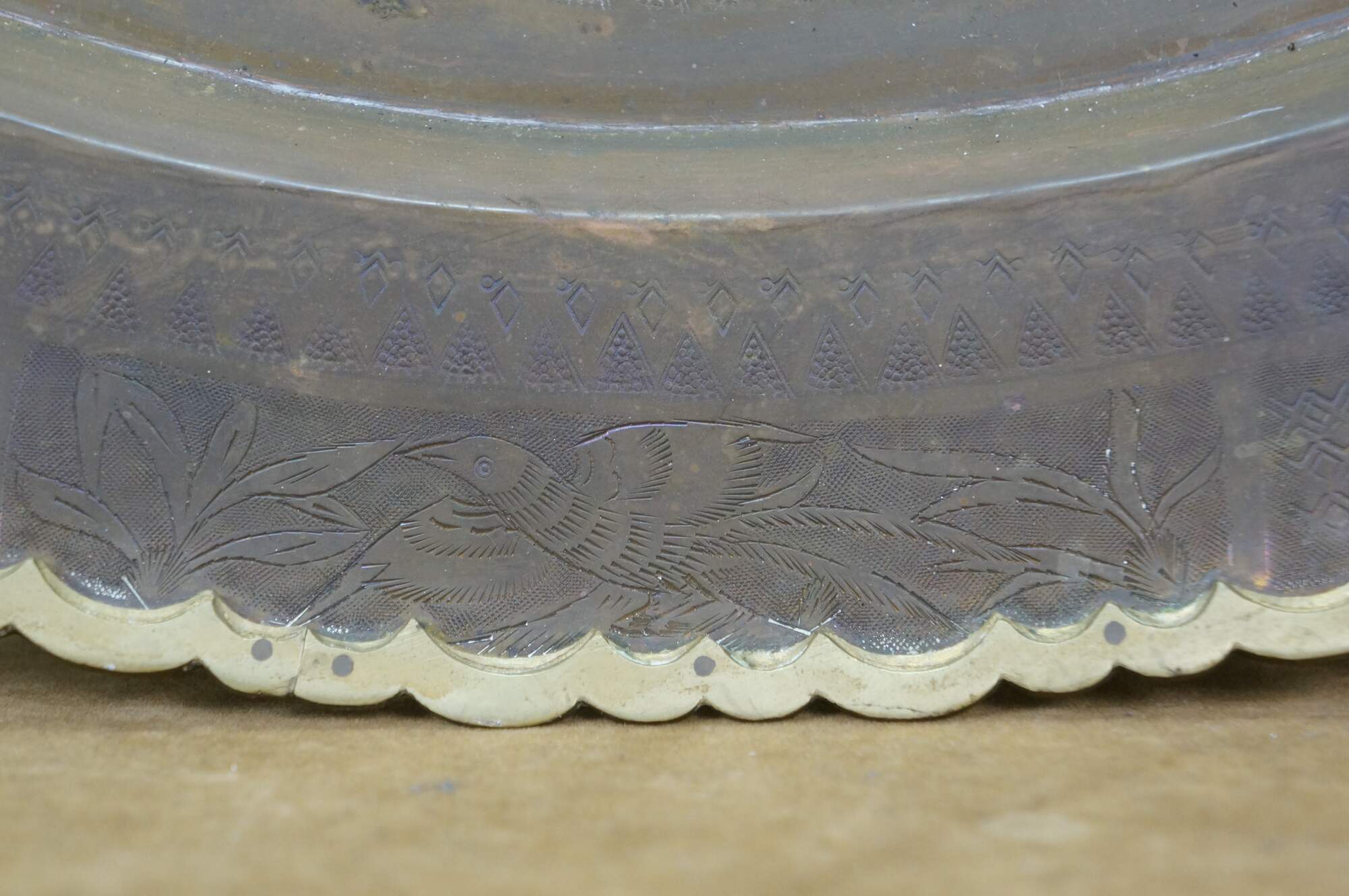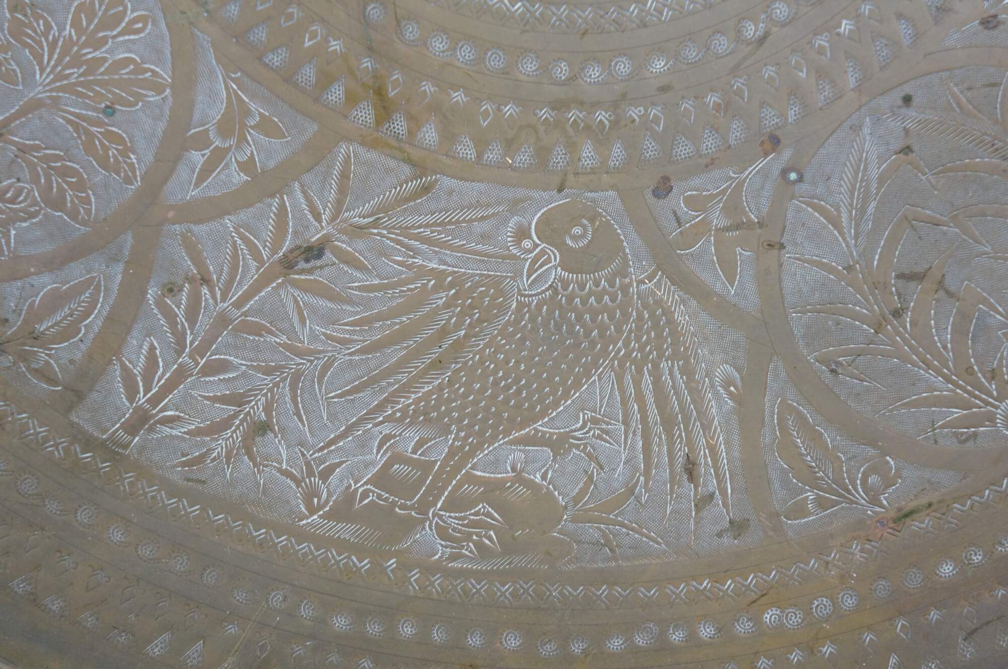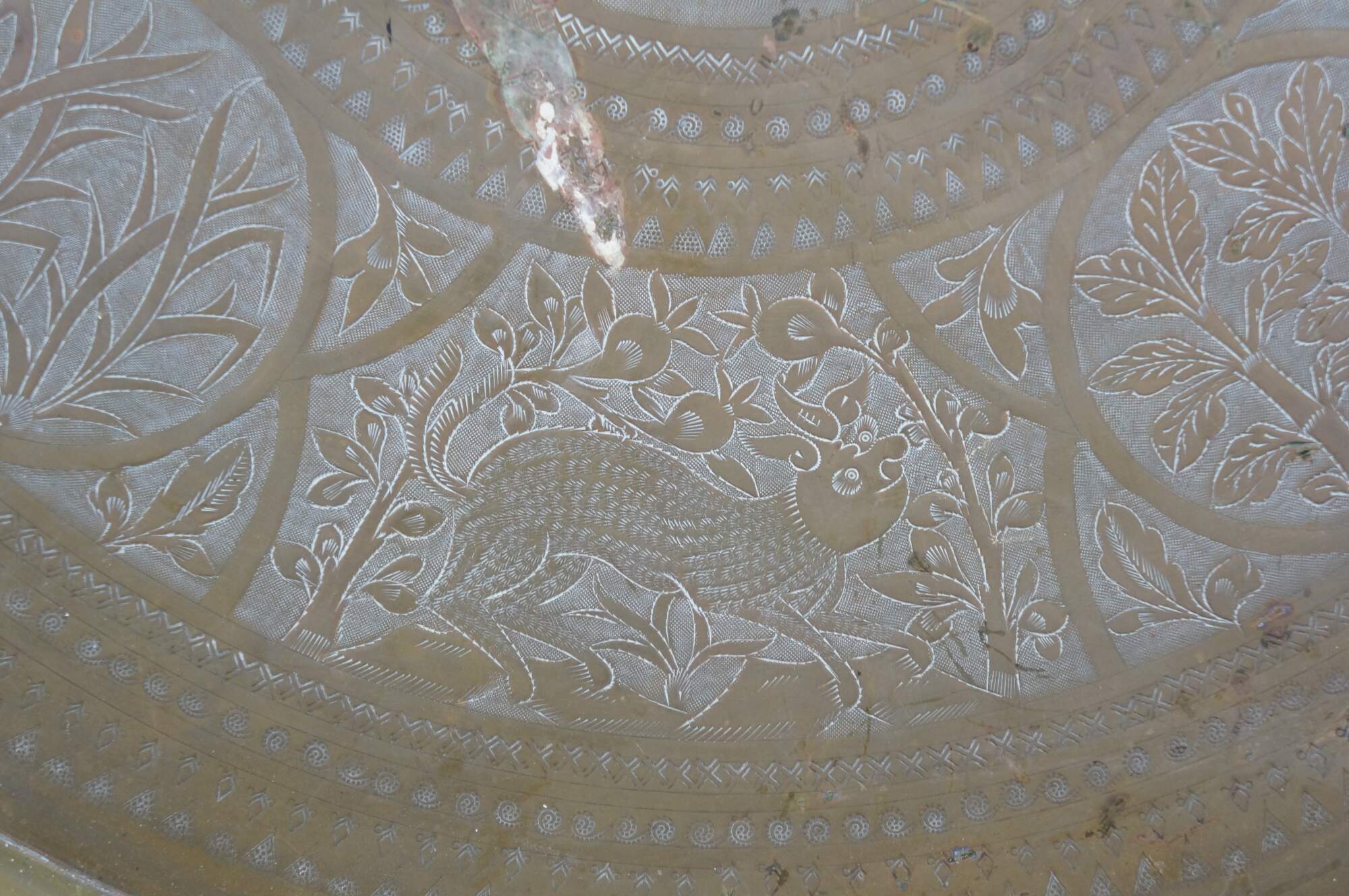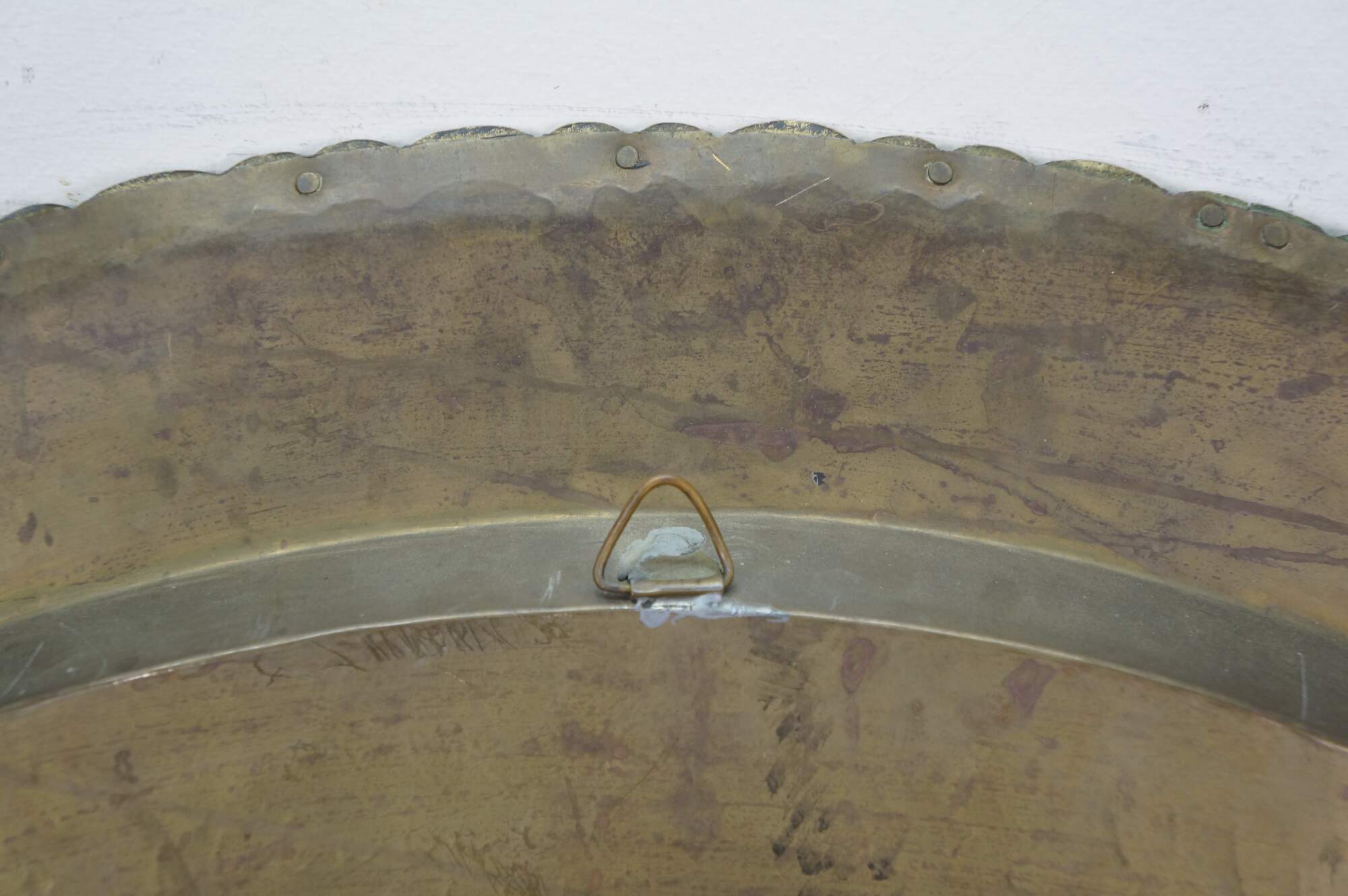 Large 20th century round brass tray with lightly scalloped edge, decorated with a Chinese fu symbol of good fortune, surrounded by flowers and a variety of animals including an elephant, deer, bird and fox (?). Ring on back for hanging as a wall display. Could also be set on a folding stand for use as a side table.