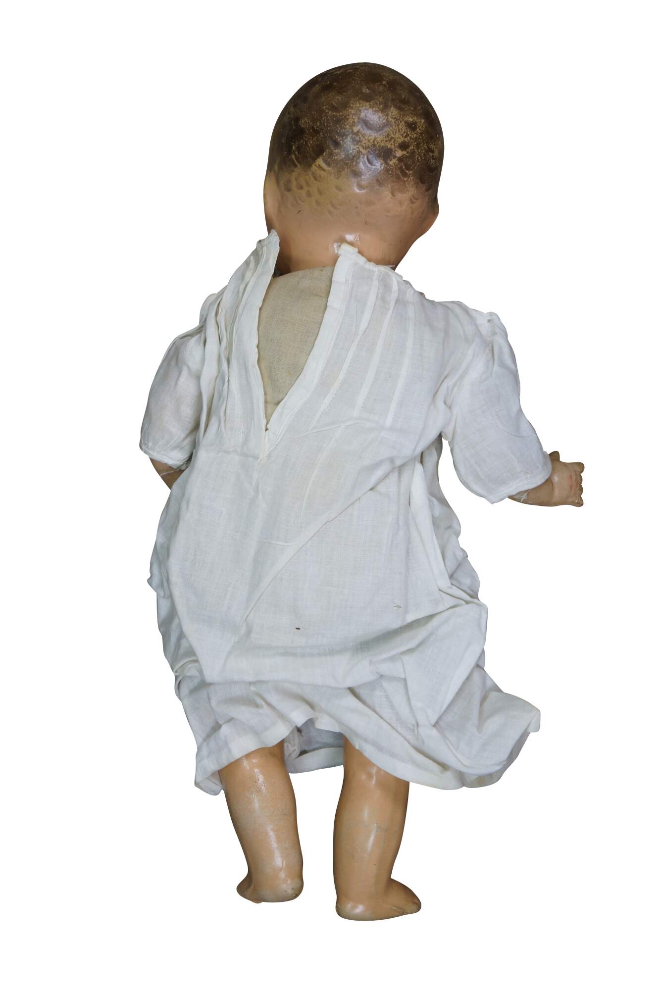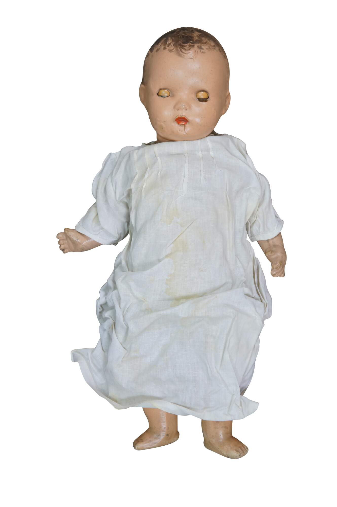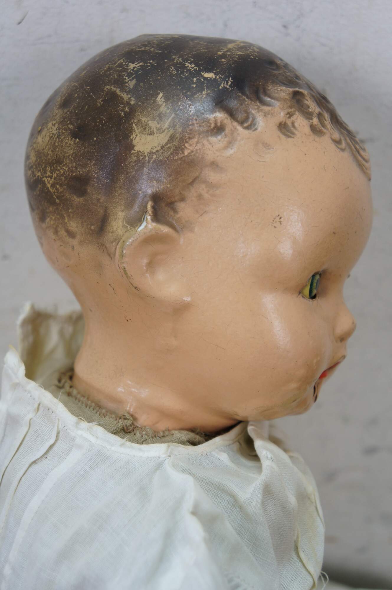 Circa 1940's Horsman Enchanting Eyes baby doll with composition head, arms, and legs, stuffed cotton body, green sleep eyes, and painted hair/features. Unknown puck shaped object inside back. Dressed in Victorian style white cotton nightgown / shift. "1940s Horsman Enchanting Eyes doll, 15-16" tall (probably other sizes as well), composition flange head, full or partial composition arms or legs, cloth stuffed body, brown painted molded hair, flirty sleep eyes that also move side to side (some have been found with non-flirty sleep eyes too), closed mouth, doll marked A Horsman Doll." (Doll Reference)