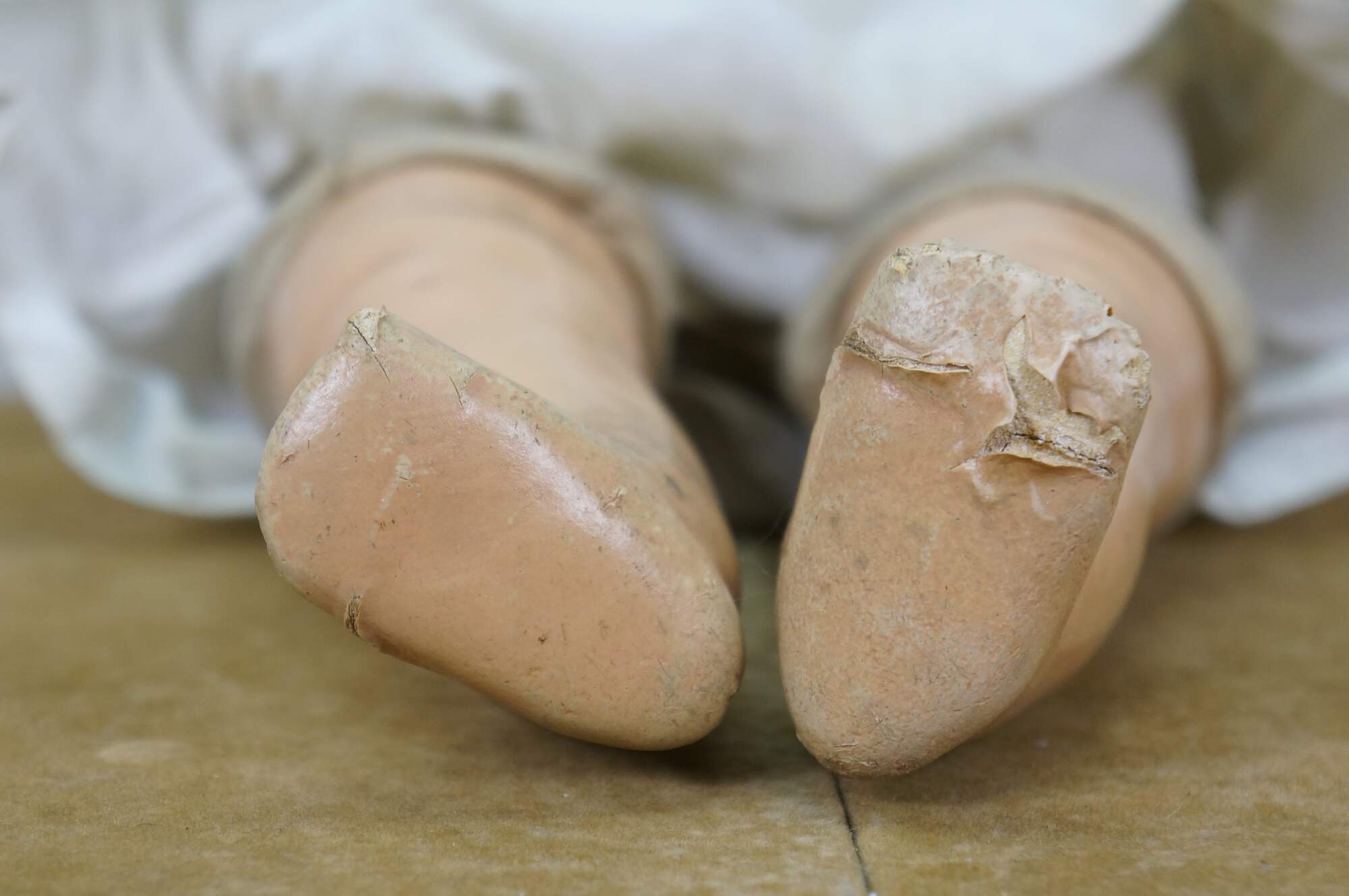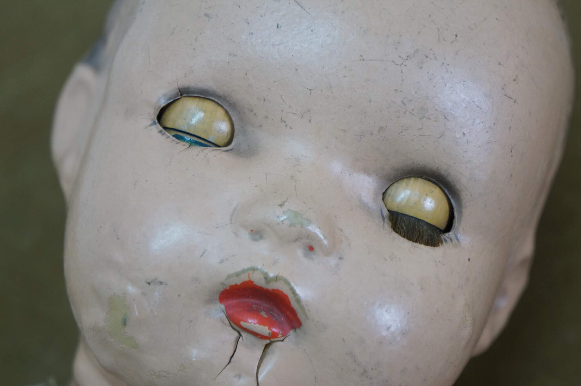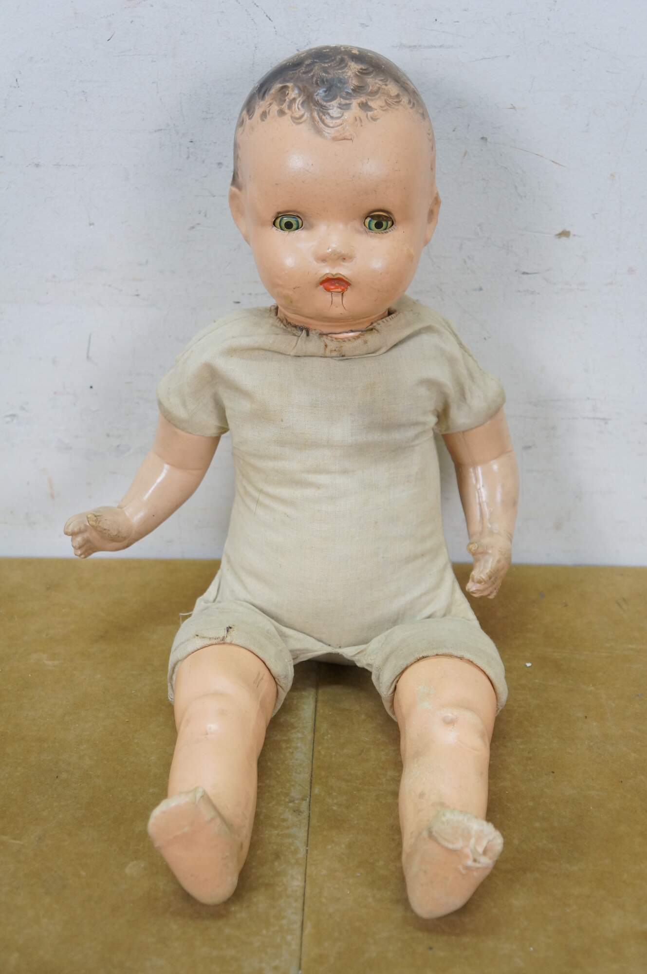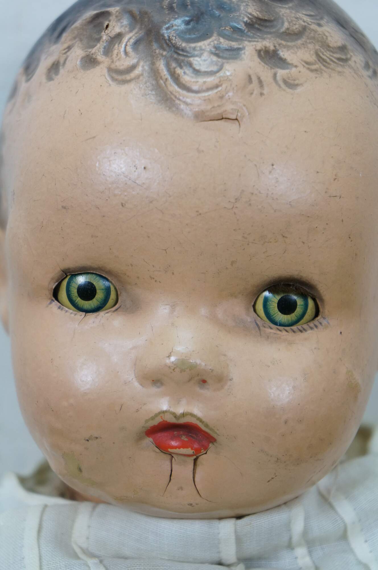 Circa 1940's Horsman Enchanting Eyes baby doll with composition head, arms, and legs, stuffed cotton body, green sleep eyes, and painted hair/features. Unknown puck shaped object inside back. Dressed in Victorian style white cotton nightgown / shift. "1940s Horsman Enchanting Eyes doll, 15-16" tall (probably other sizes as well), composition flange head, full or partial composition arms or legs, cloth stuffed body, brown painted molded hair, flirty sleep eyes that also move side to side (some have been found with non-flirty sleep eyes too), closed mouth, doll marked A Horsman Doll." (Doll Reference)