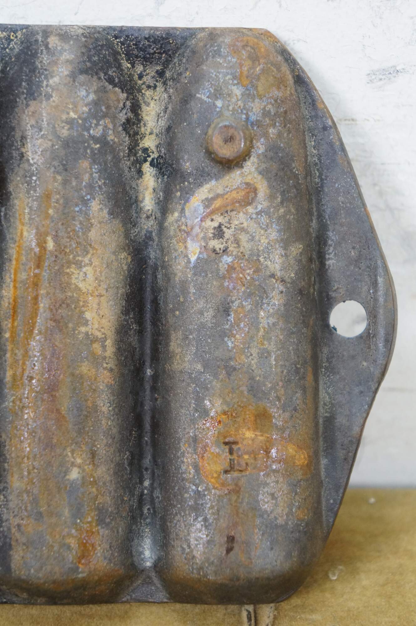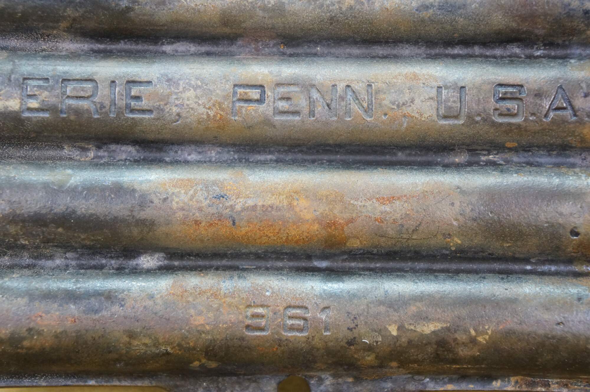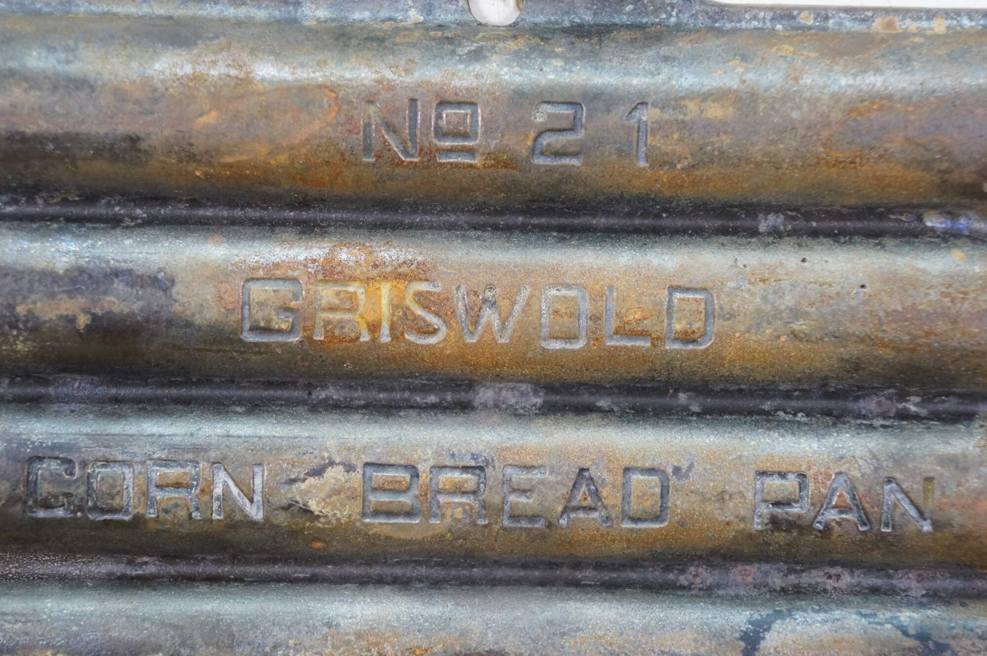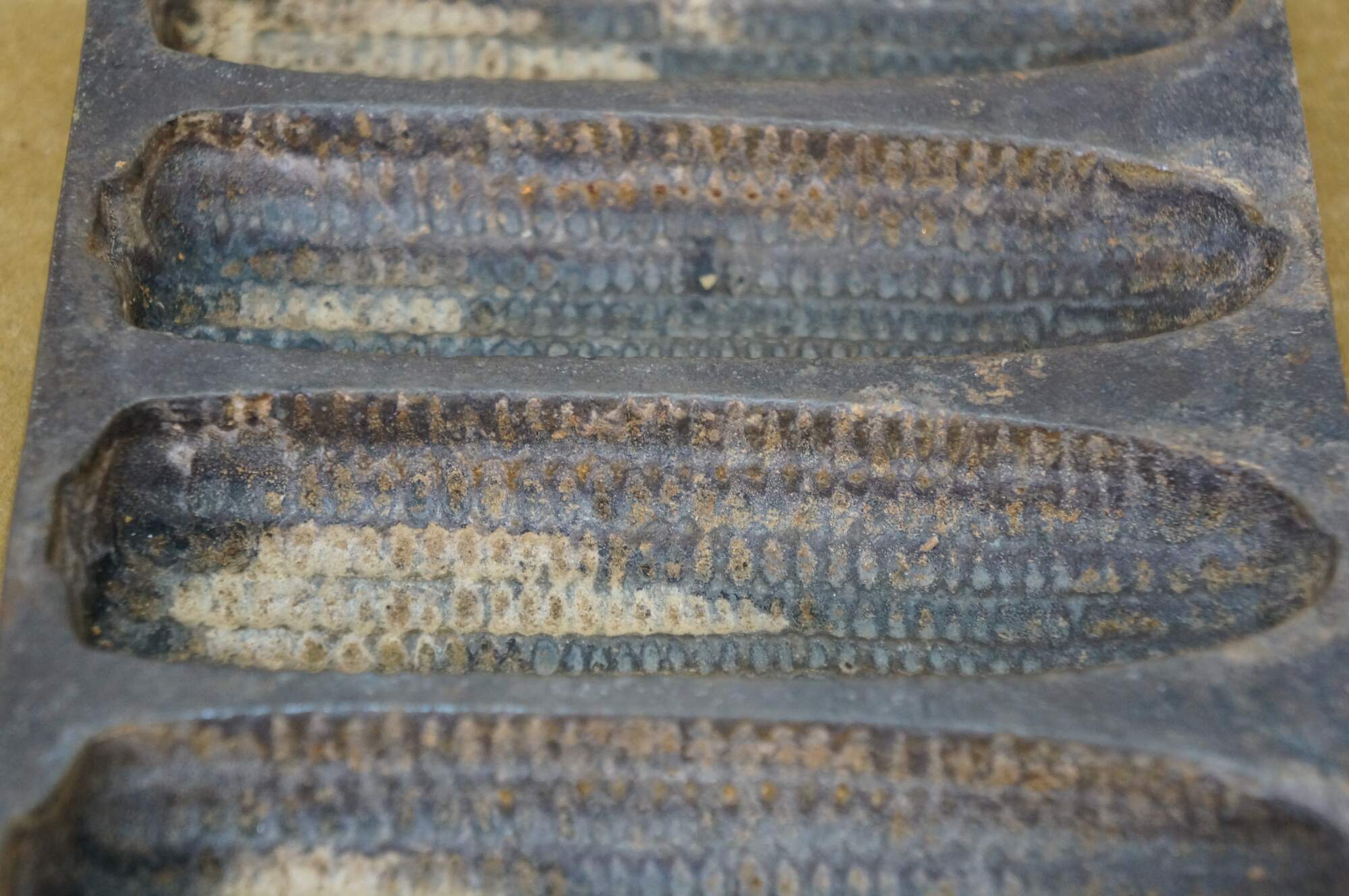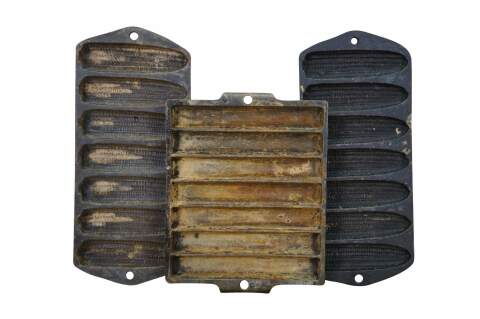 Set of three early to mid 20th century cast iron cornbread / corn stick / bread stick baking pans. One Griswold No 21 Cornbread Pan - Erie, Penn, USA - 961 - Rectangular shape with small handles at the ends; makes 7 cylinder shaped bread sticks. And two rectangular corn pattern cornbread pans simply marked with an L; make 7 bread sticks shaped like ears of corn.