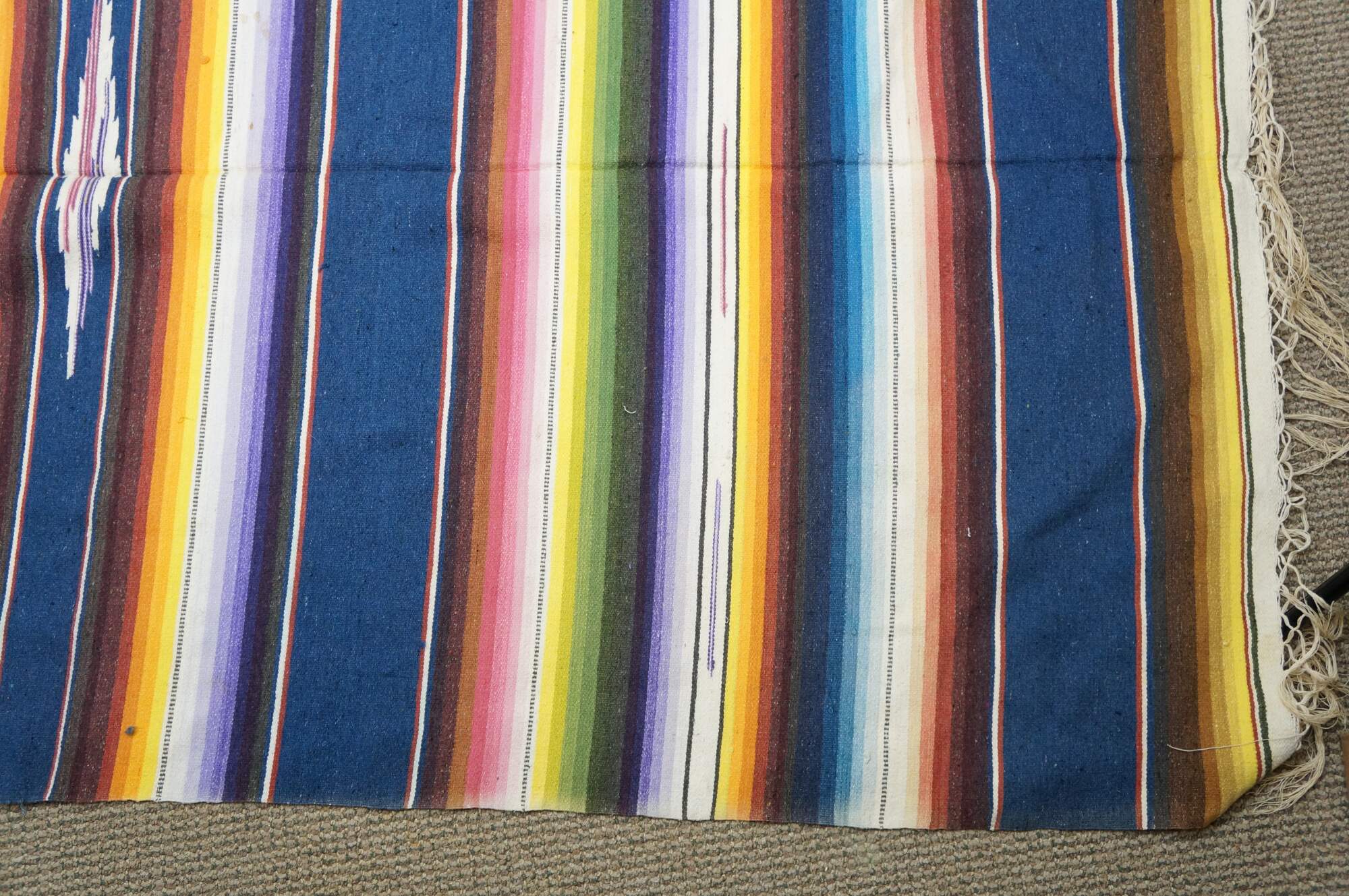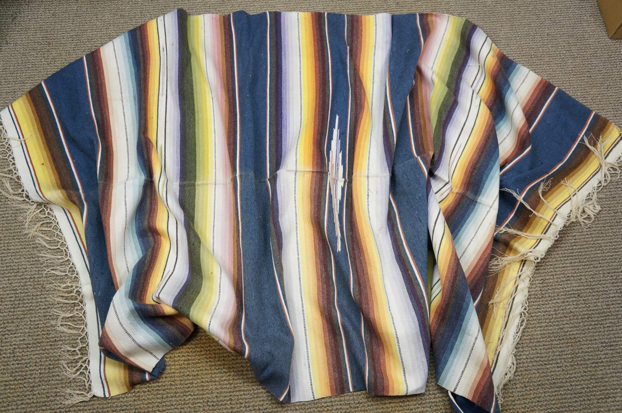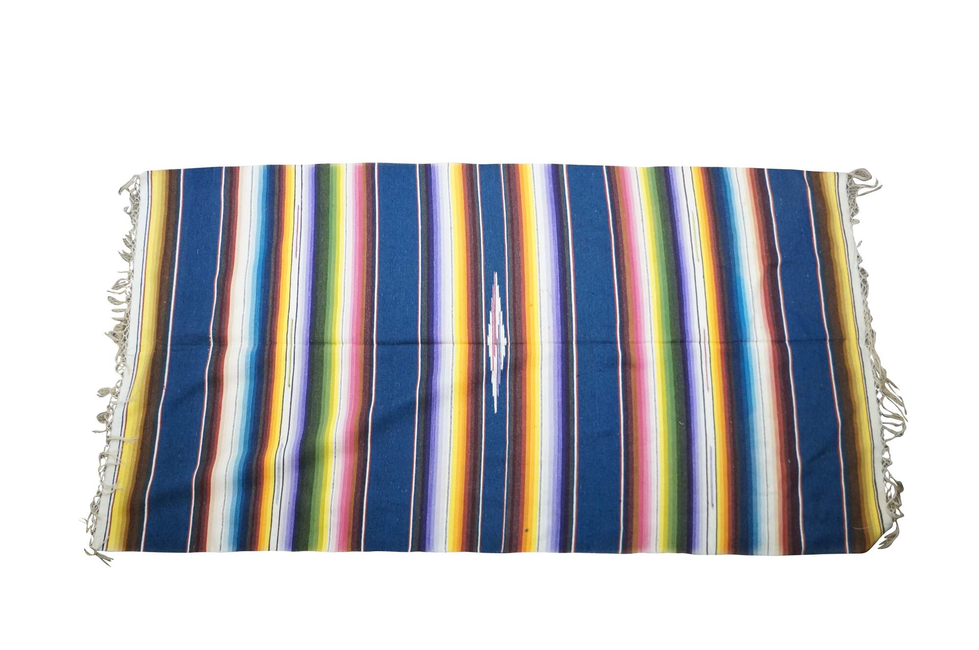 Vintage 20th century Mexican wool serape / rug / blanket. Lightweight woven fabric in a bright multi-colored rainbow of stripes and a central geometric motif. White knotted fringe. Circa 1970s.