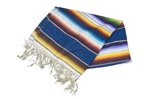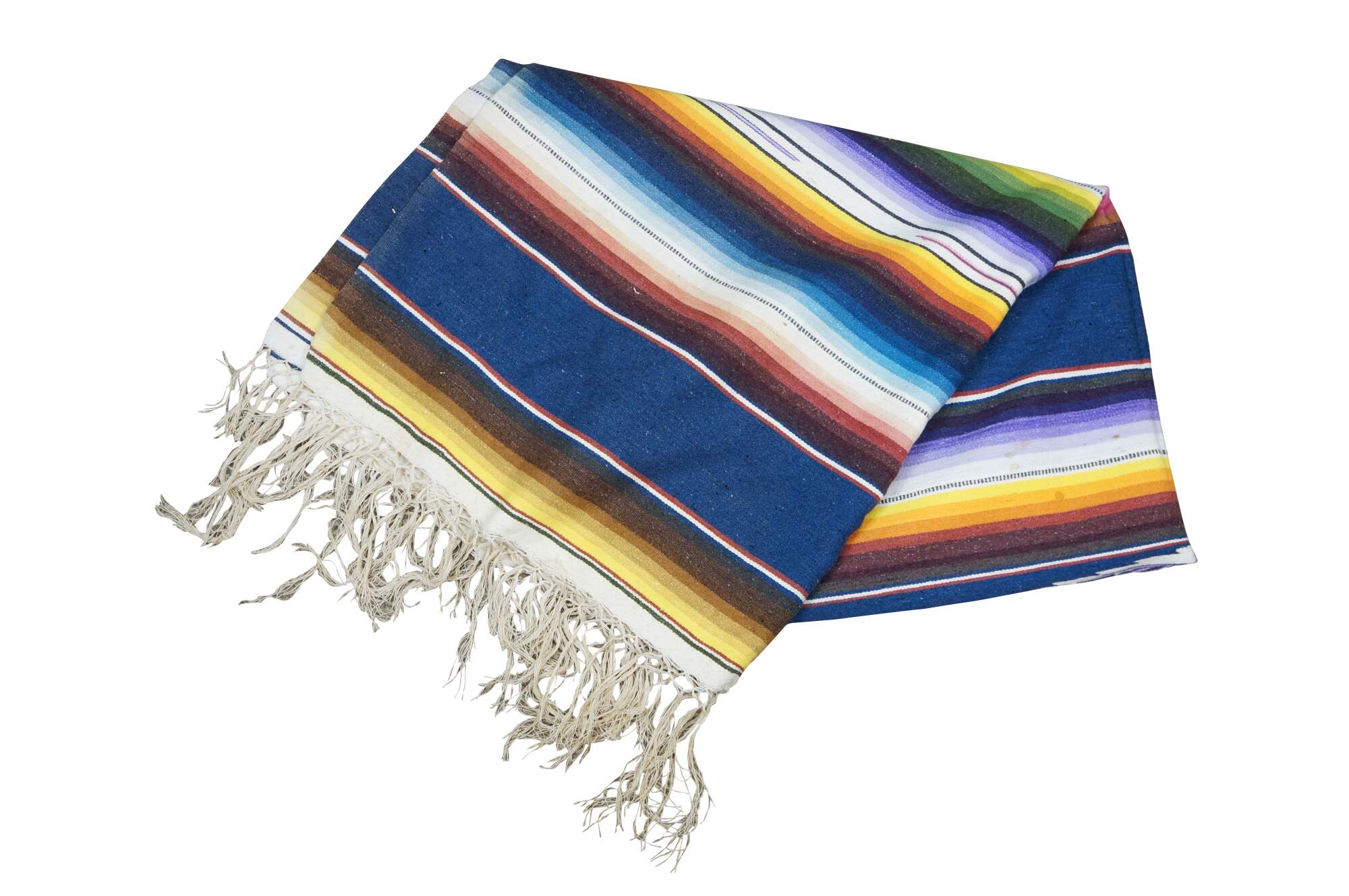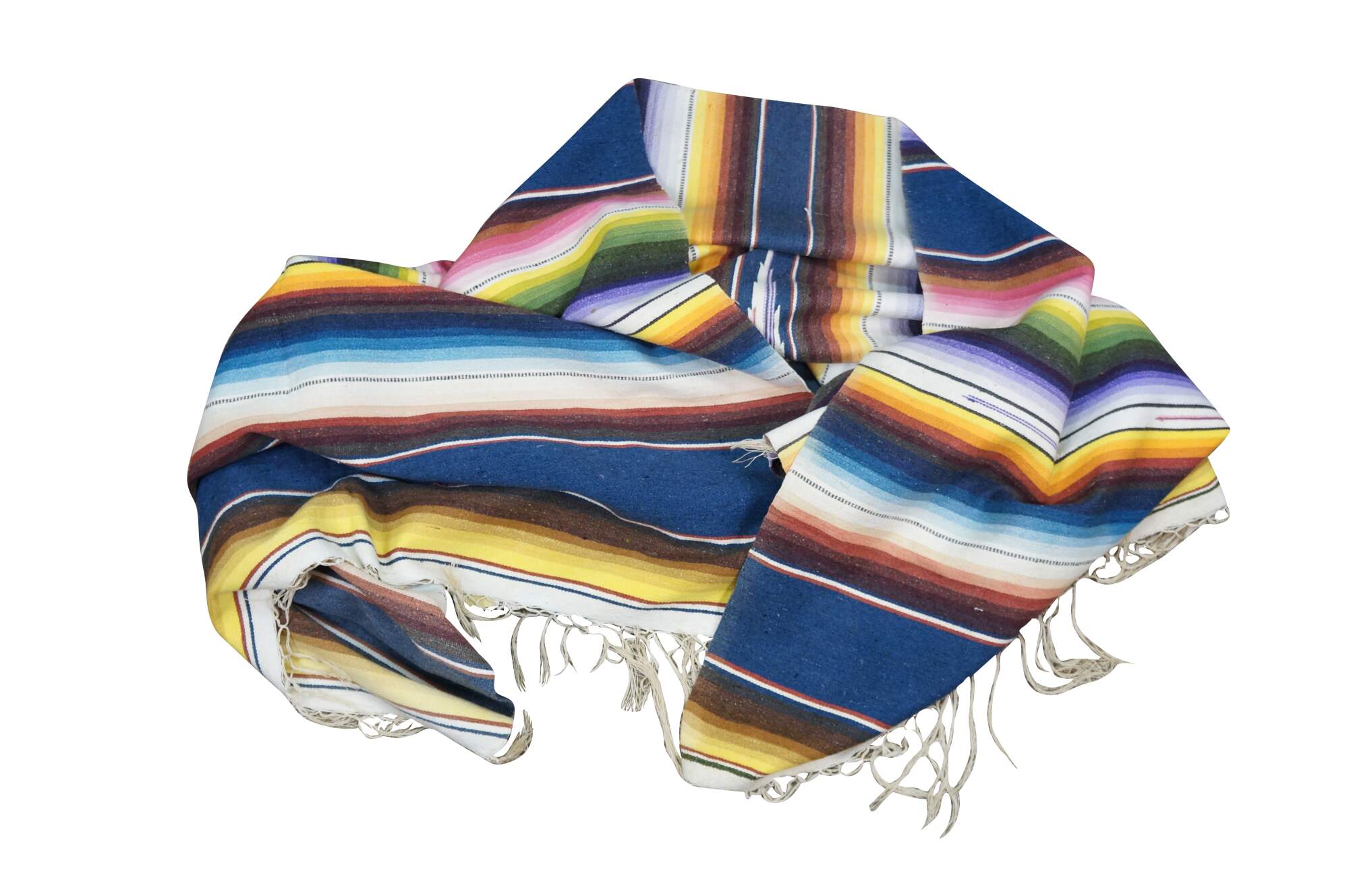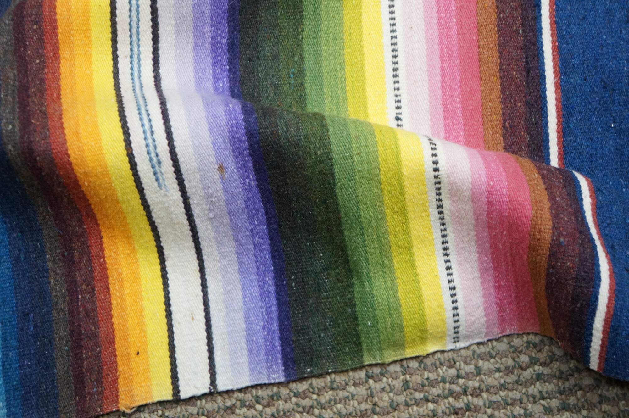 Vintage 20th century Mexican wool serape / rug / blanket. Lightweight woven fabric in a bright multi-colored rainbow of stripes and a central geometric motif. White knotted fringe. Circa 1970s.