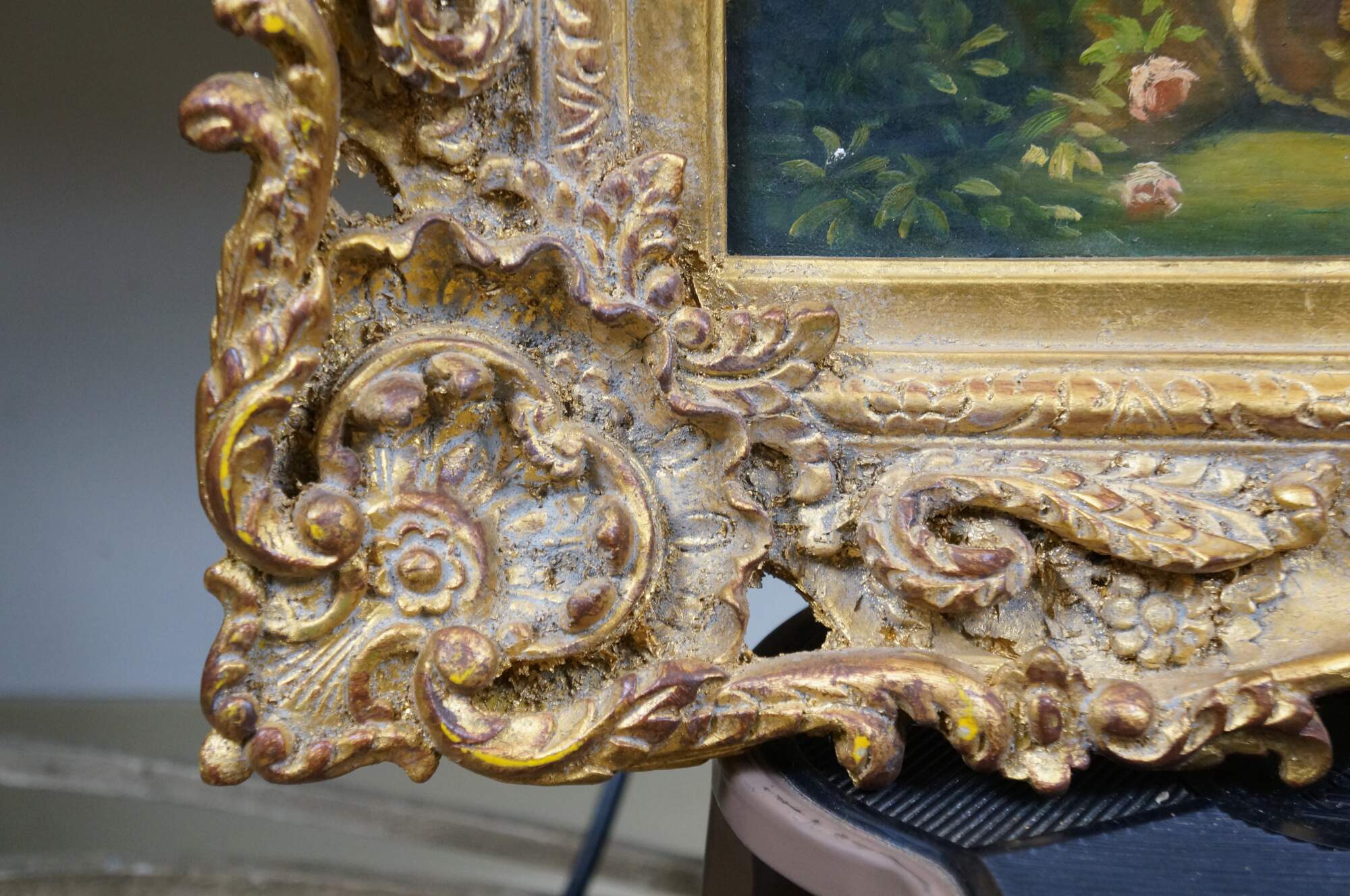 Late 20th century oil painting on linen after Portrait of Madame de Pompadour by Francois Boucher. Portrait of Madame de Pompadour is a 1759 oil-on-canvas painting by the French Rococo artist François Boucher, now in the Wallace Collection in London. Elaborate baroque gilt composite frame with a deep pierced scrolling foliate and floral design.