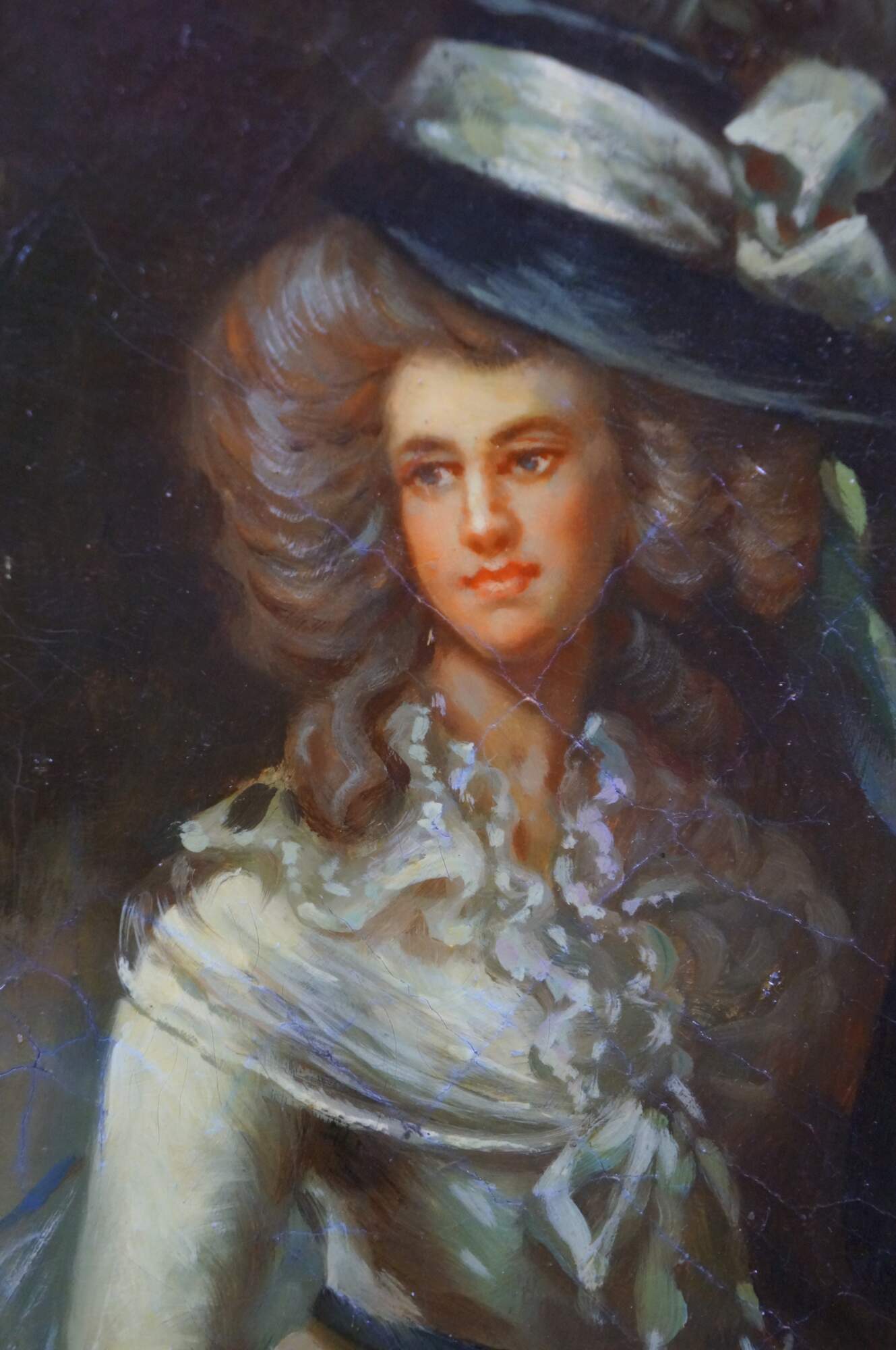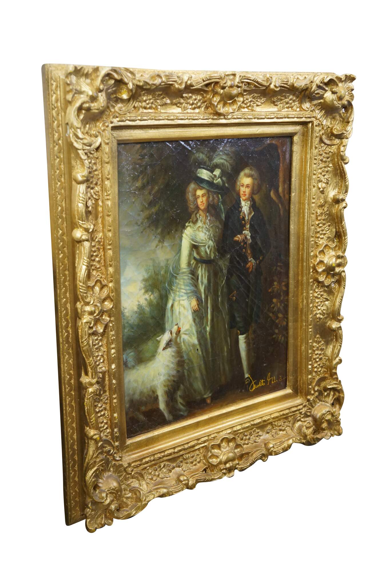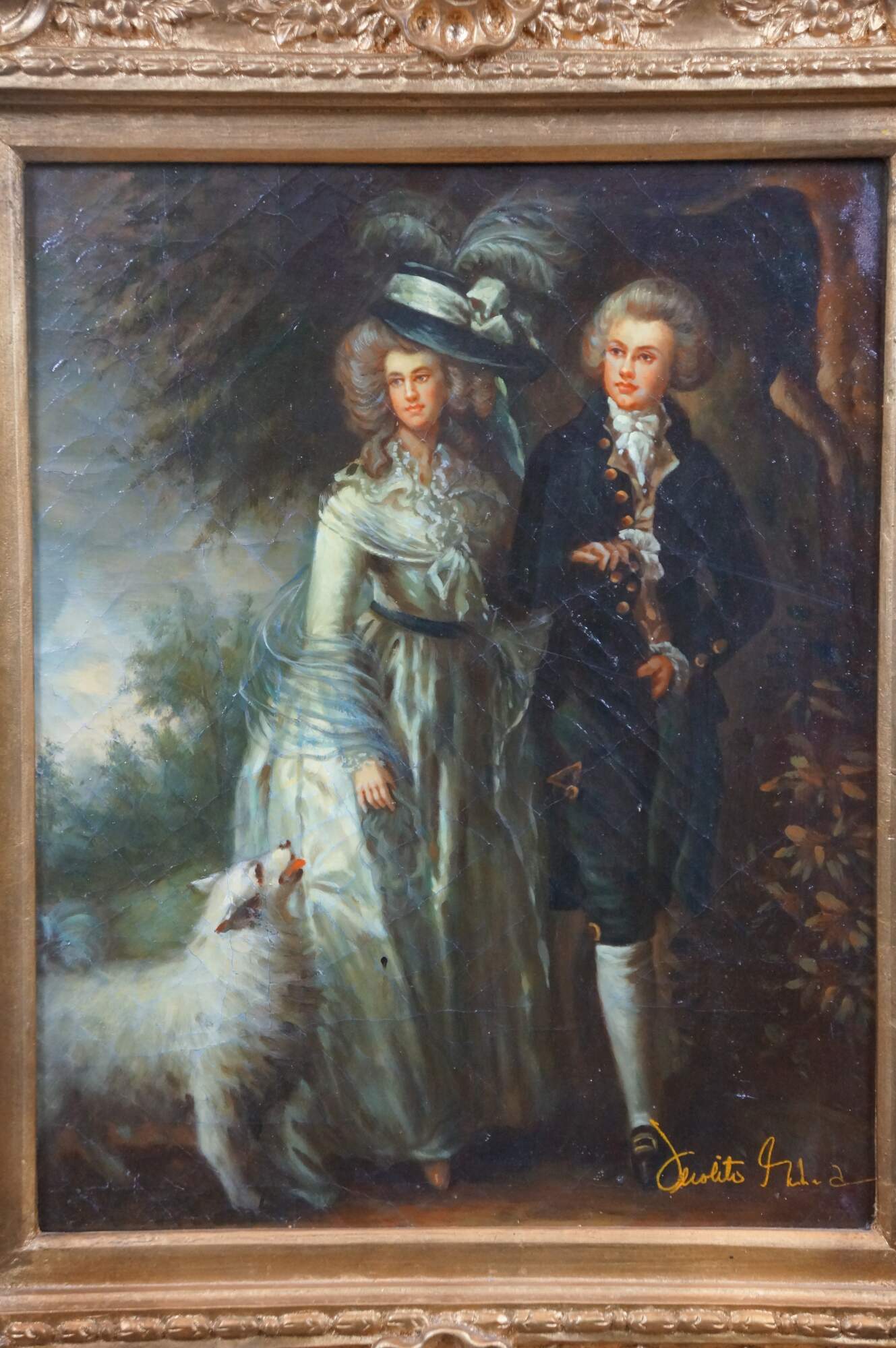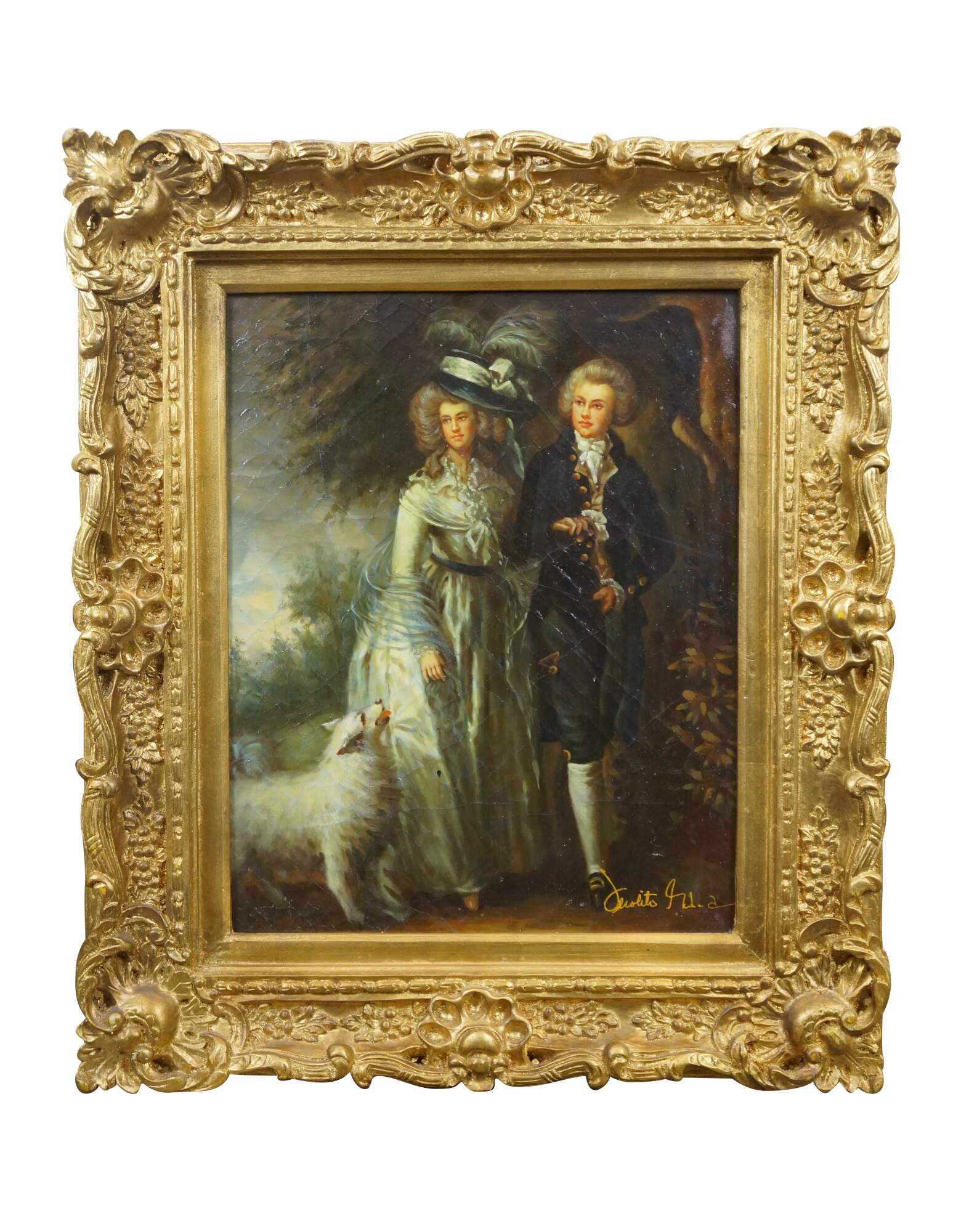 Late 20th century oil on linen painting after "Mr and Mrs William Hallett aka The Morning Walk" by Sir Thomas Gainsborough. "Mr. and Mrs. William Hallett (1785) also known as The Morning Walk is a double full-length portrait of William Hallett and Elizabeth Stephen, painted ahead of their wedding on July 30, 1785. The handsome young couple is seen arm-in-arm strolling on their morning walk with a Pomeranian sheepdog. They are dressed in elegant frocks, possibly their wedding clothes. This type of portrait, which presented the sitters in a natural setting dressed up in their finest garments, was fashionable among wealthy patrons in the late 18th century. Such paintings were a powerful status symbol, signifying the couple’s wealth and social status." (Wikiart) Signed, lower right. Gilt composite frame featuring a floral and scallop shell design.