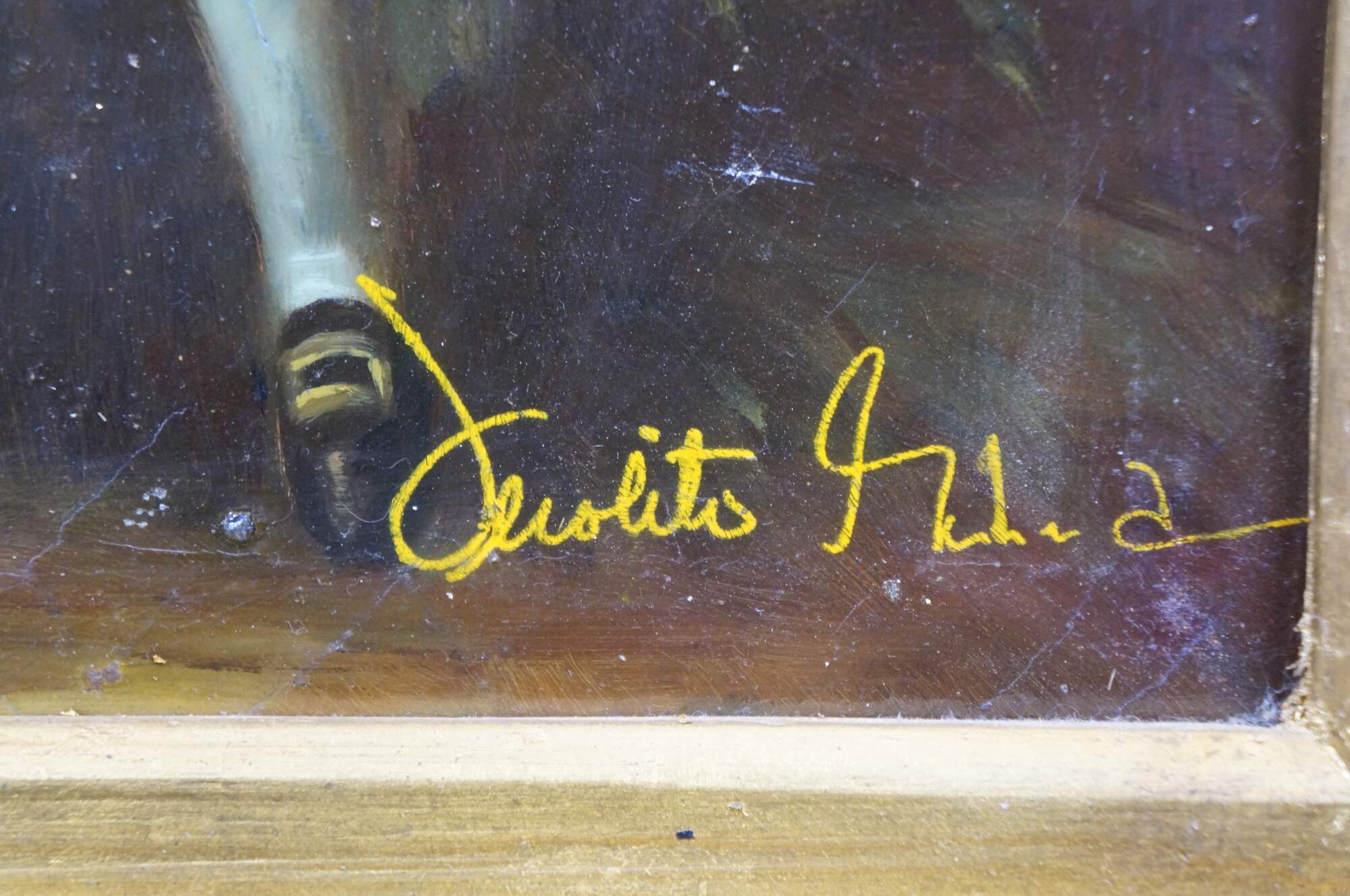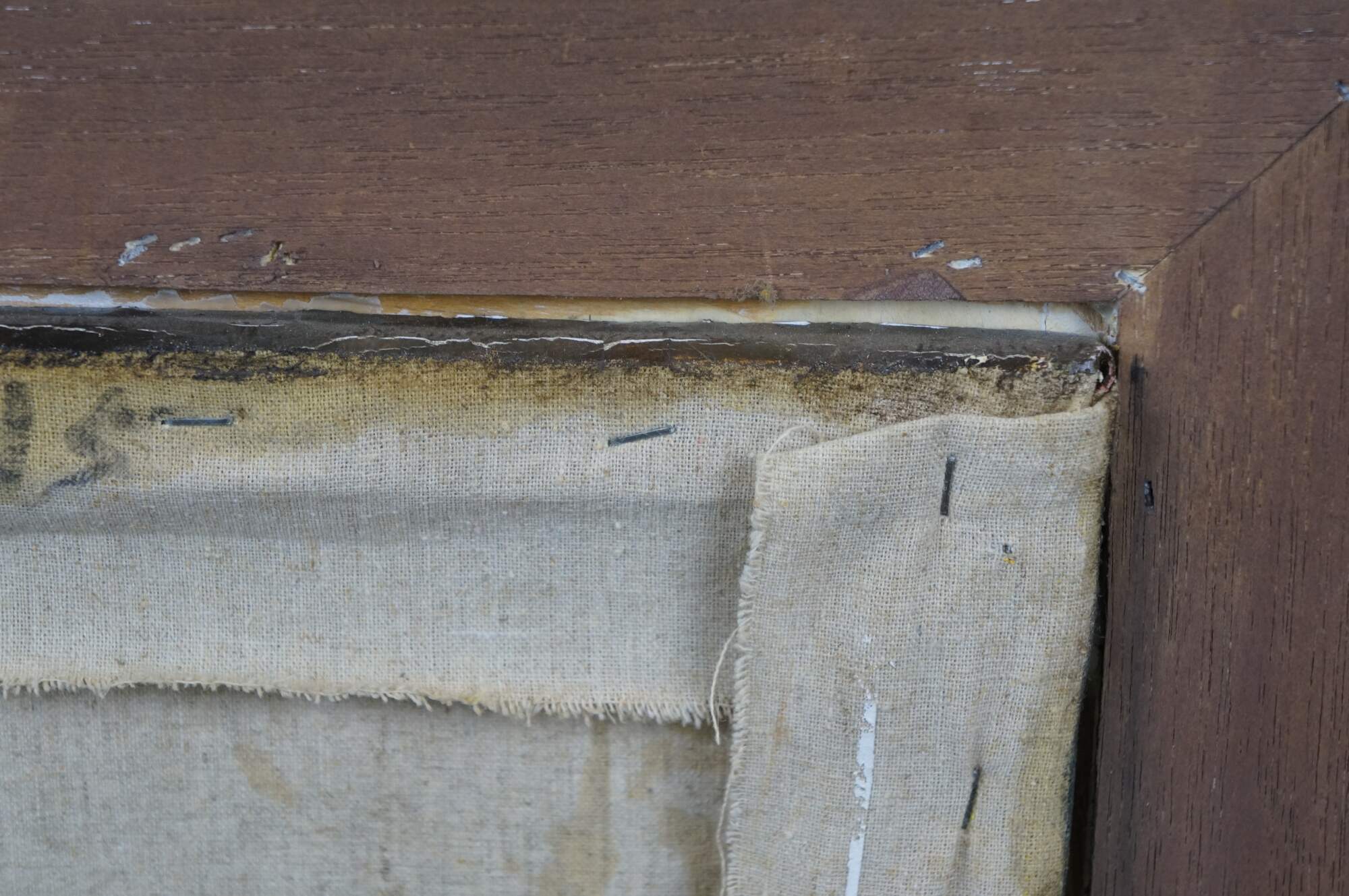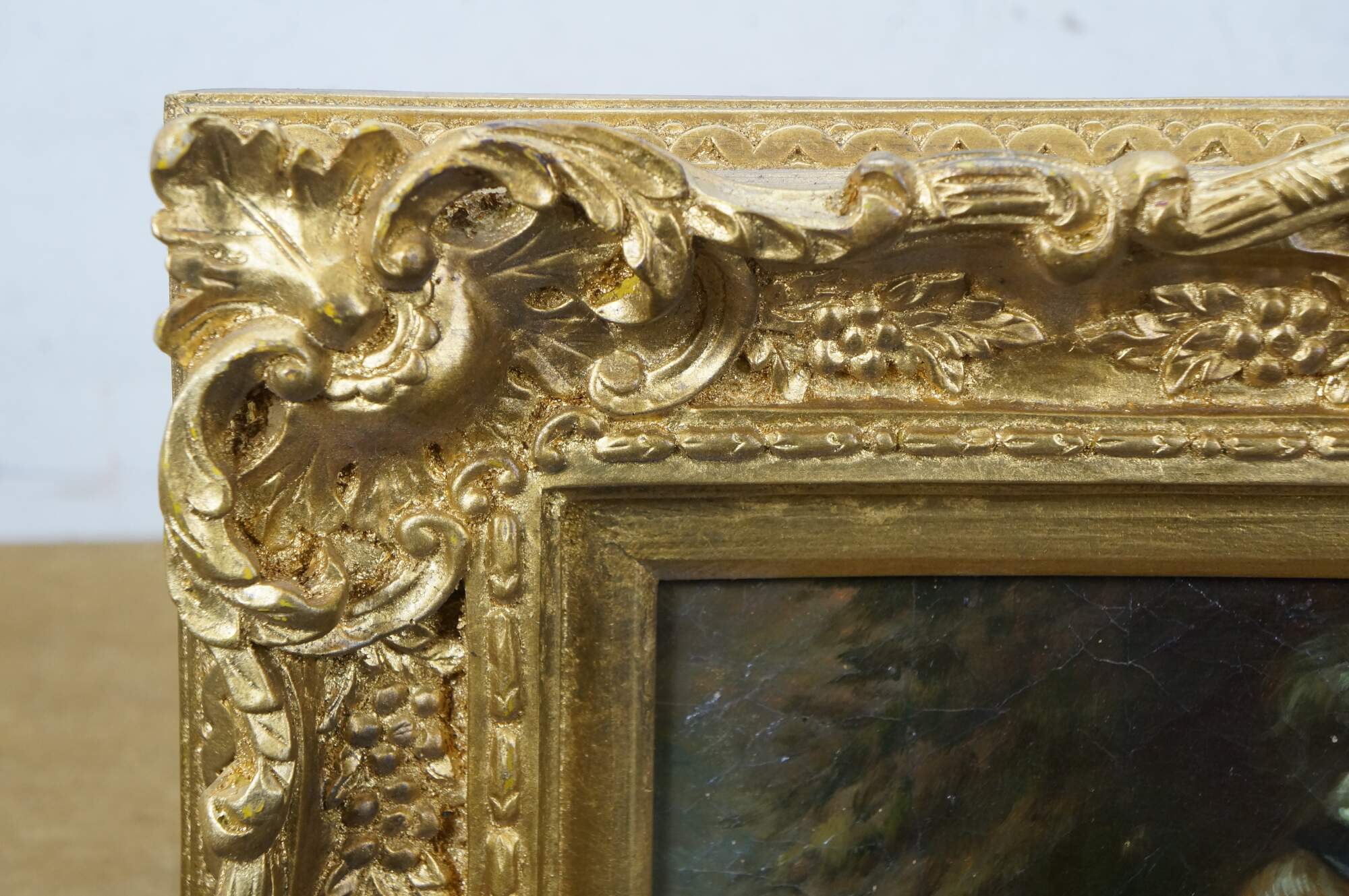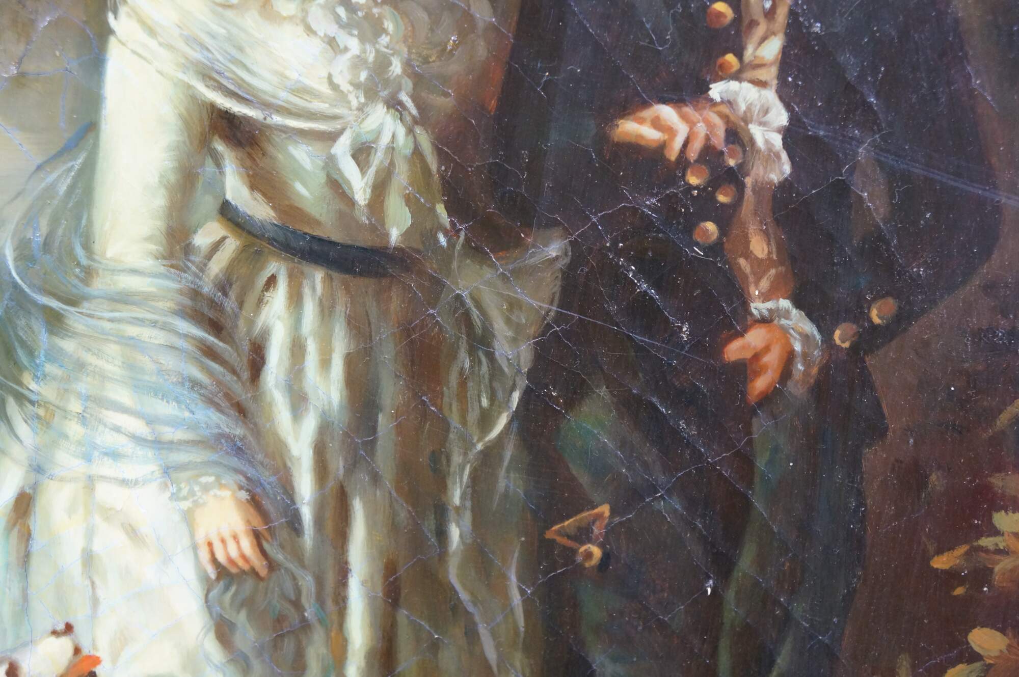 Late 20th century oil on linen painting after "Mr and Mrs William Hallett aka The Morning Walk" by Sir Thomas Gainsborough. "Mr. and Mrs. William Hallett (1785) also known as The Morning Walk is a double full-length portrait of William Hallett and Elizabeth Stephen, painted ahead of their wedding on July 30, 1785. The handsome young couple is seen arm-in-arm strolling on their morning walk with a Pomeranian sheepdog. They are dressed in elegant frocks, possibly their wedding clothes. This type of portrait, which presented the sitters in a natural setting dressed up in their finest garments, was fashionable among wealthy patrons in the late 18th century. Such paintings were a powerful status symbol, signifying the couple’s wealth and social status." (Wikiart) Signed, lower right. Gilt composite frame featuring a floral and scallop shell design.