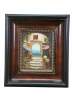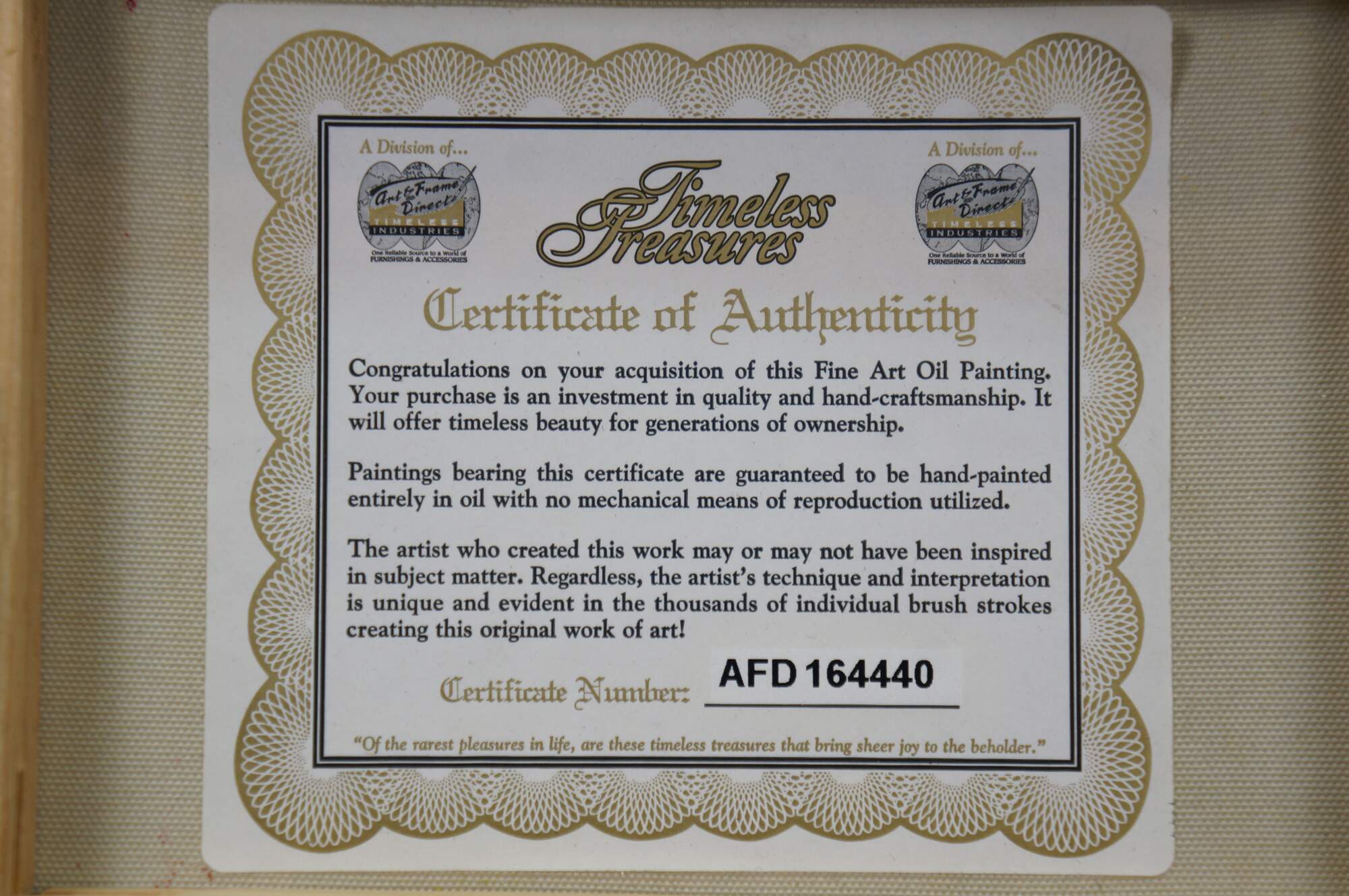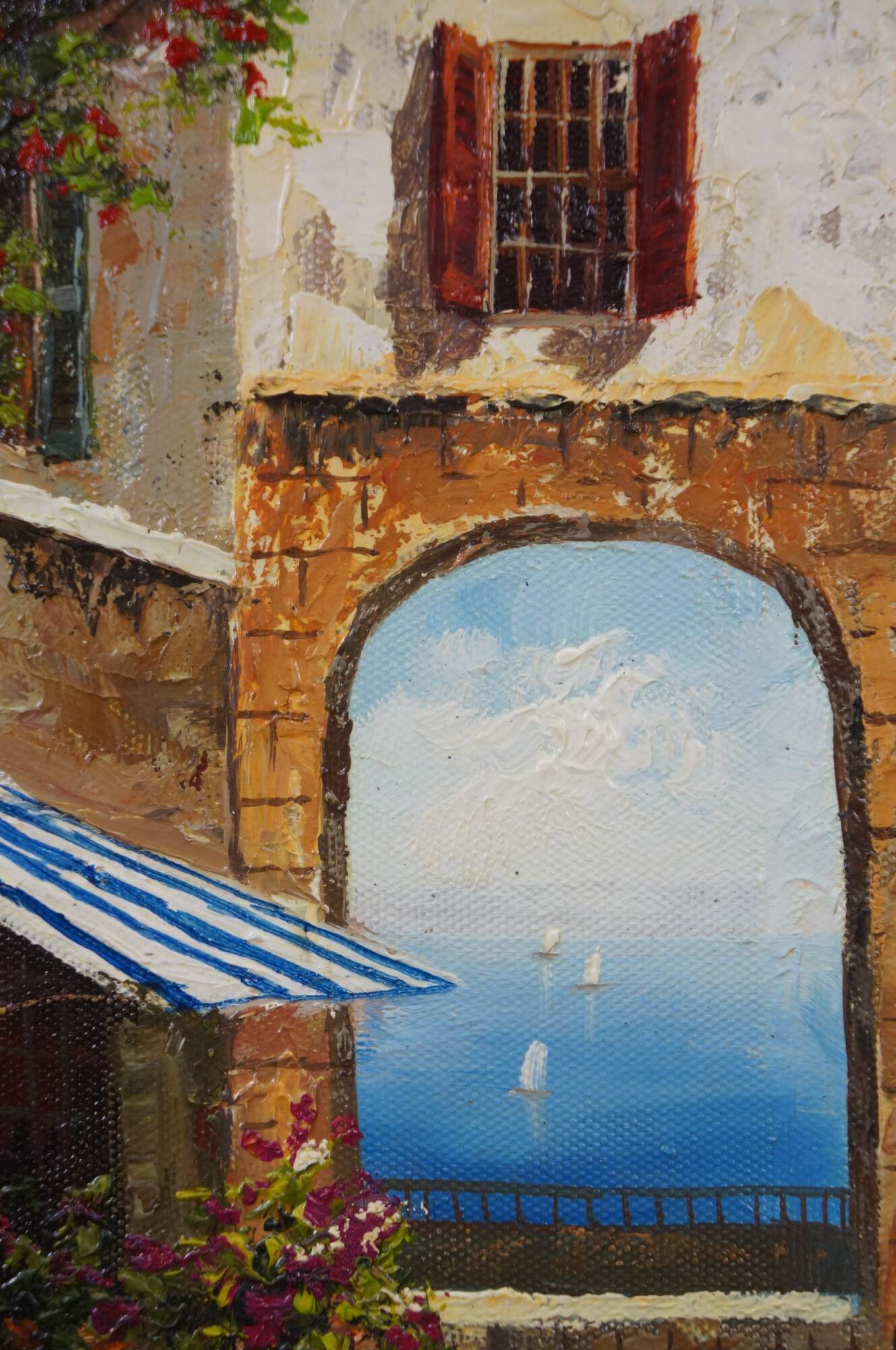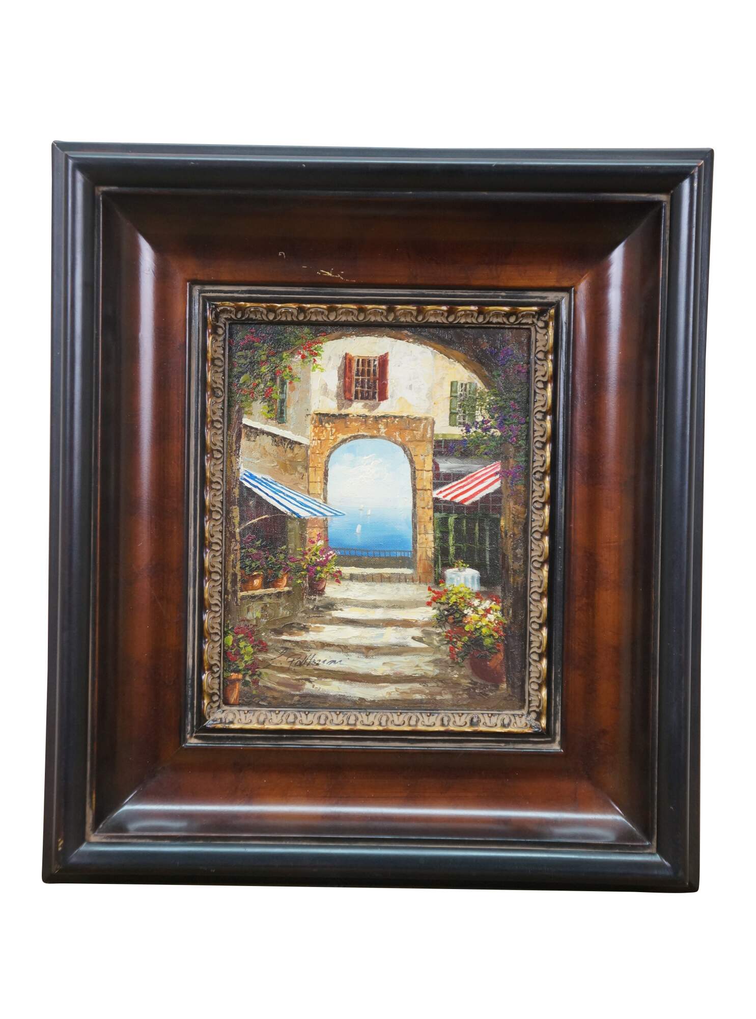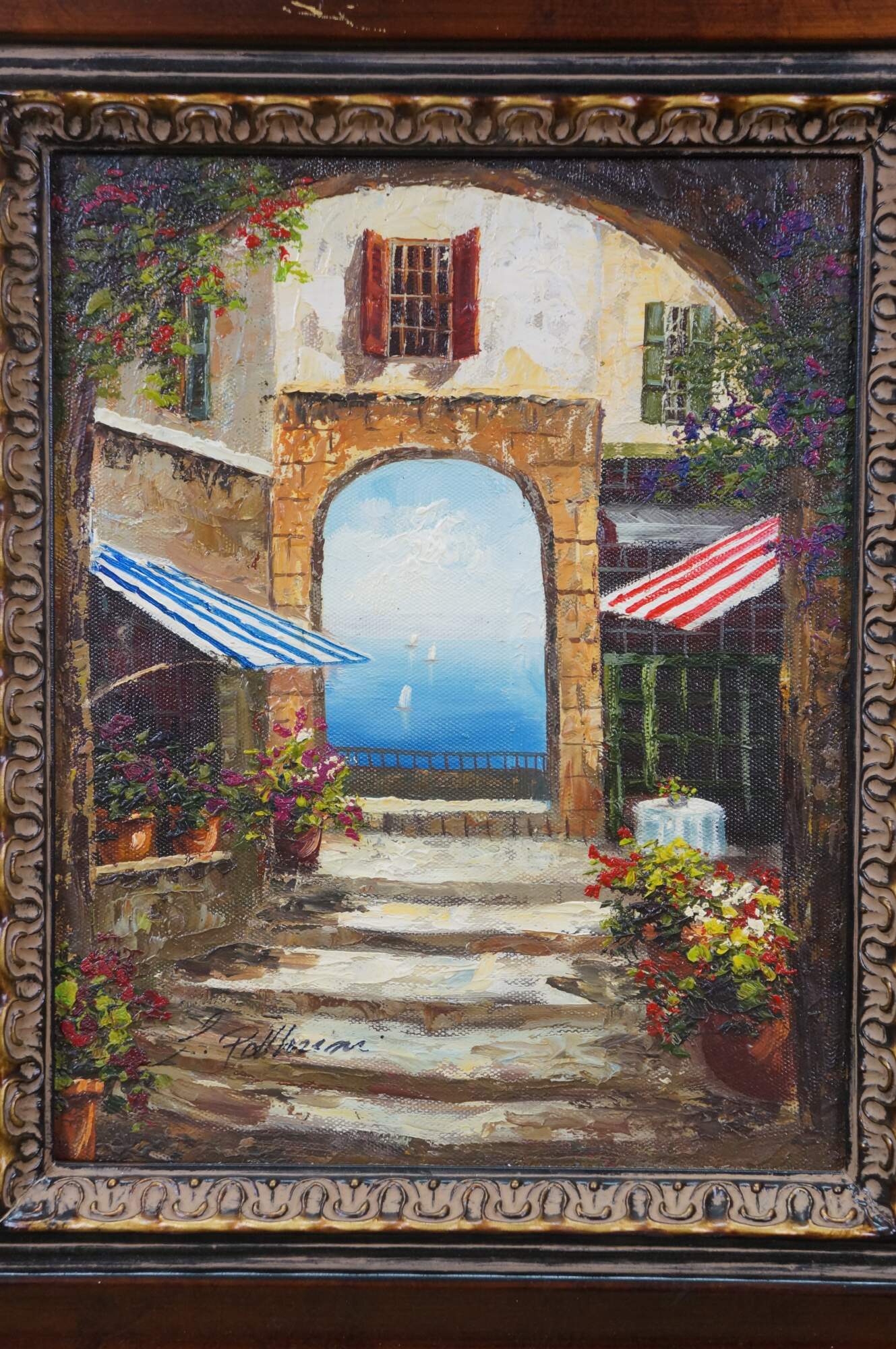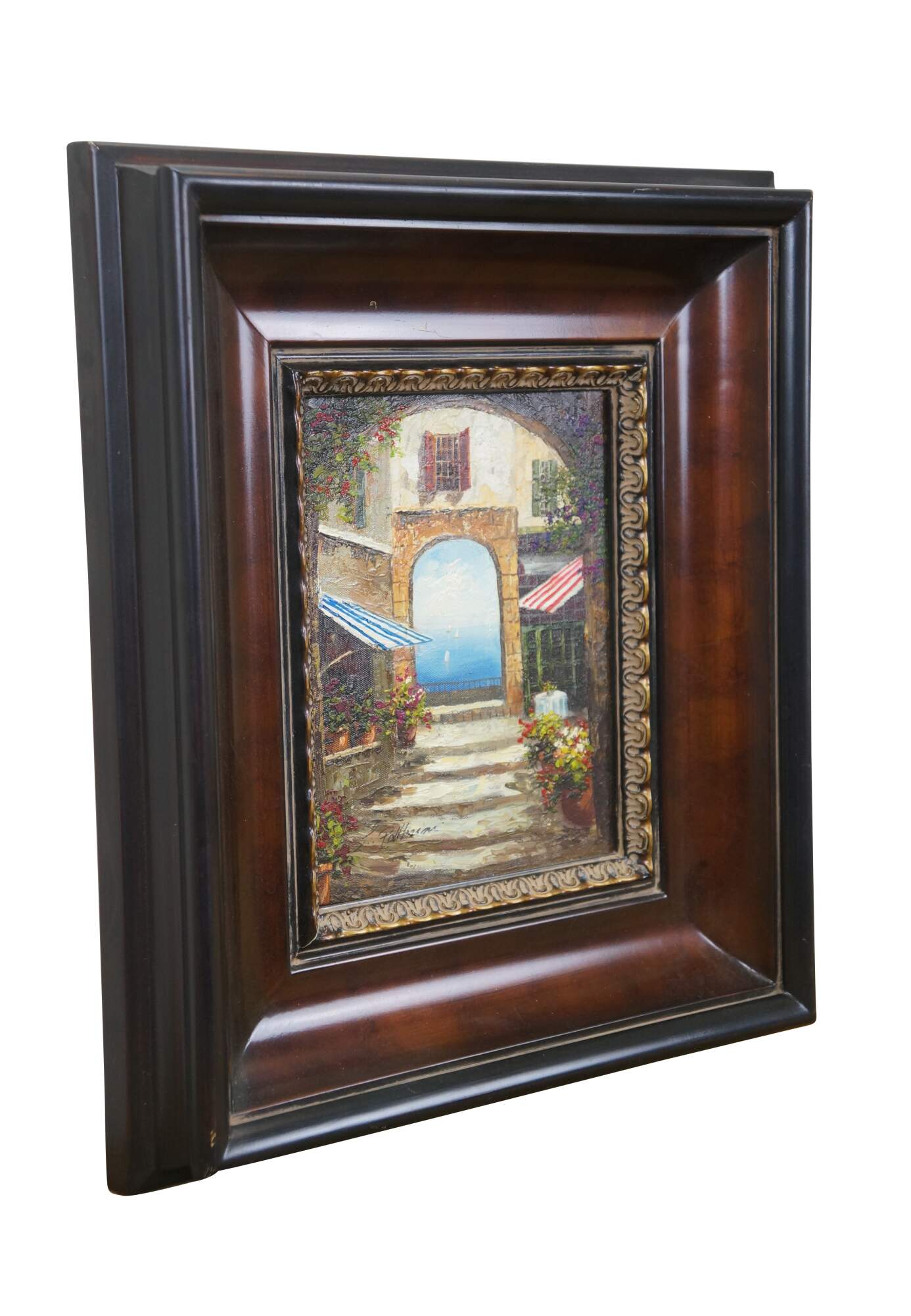 Late 20th century oil on canvas painting showing a Mediterranean courtyard with steps leading to an archway to a view of blue water dotted with sailboats. Signed, lower left. Produced for Timeless Treasures. Certificate of Authenticity Number AFD164440. Beveled wood tone composite frame with girl foliate detail.