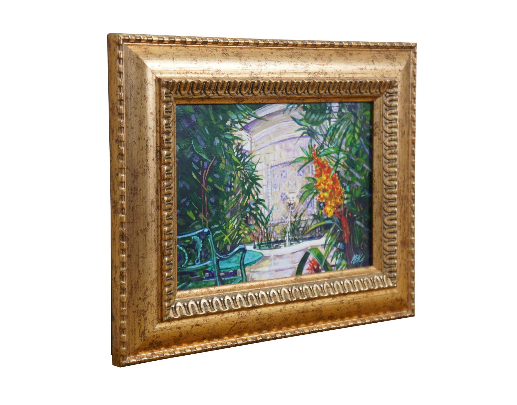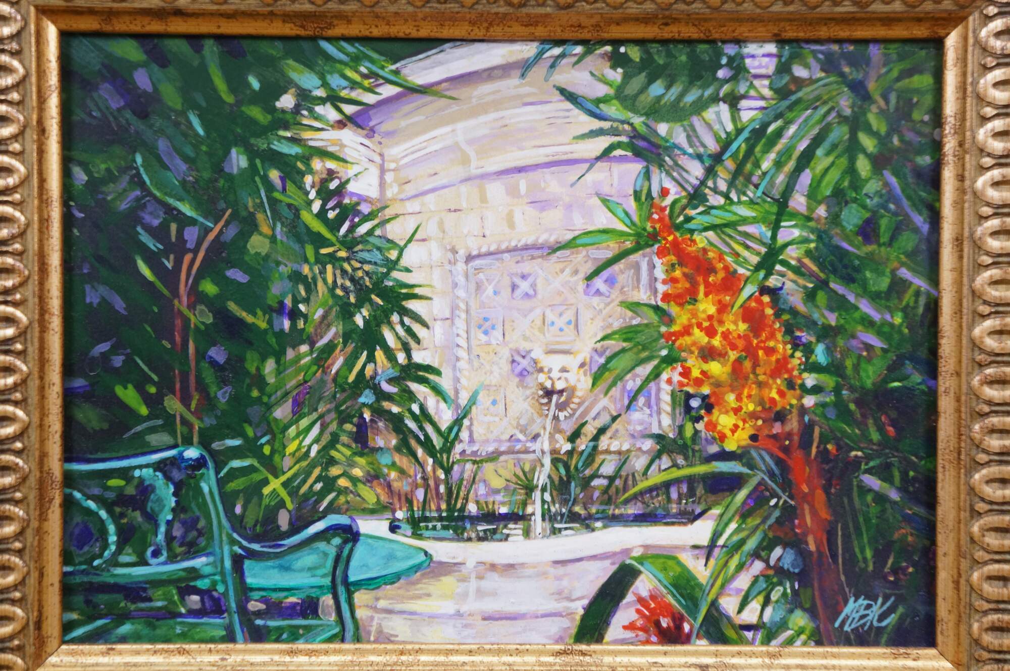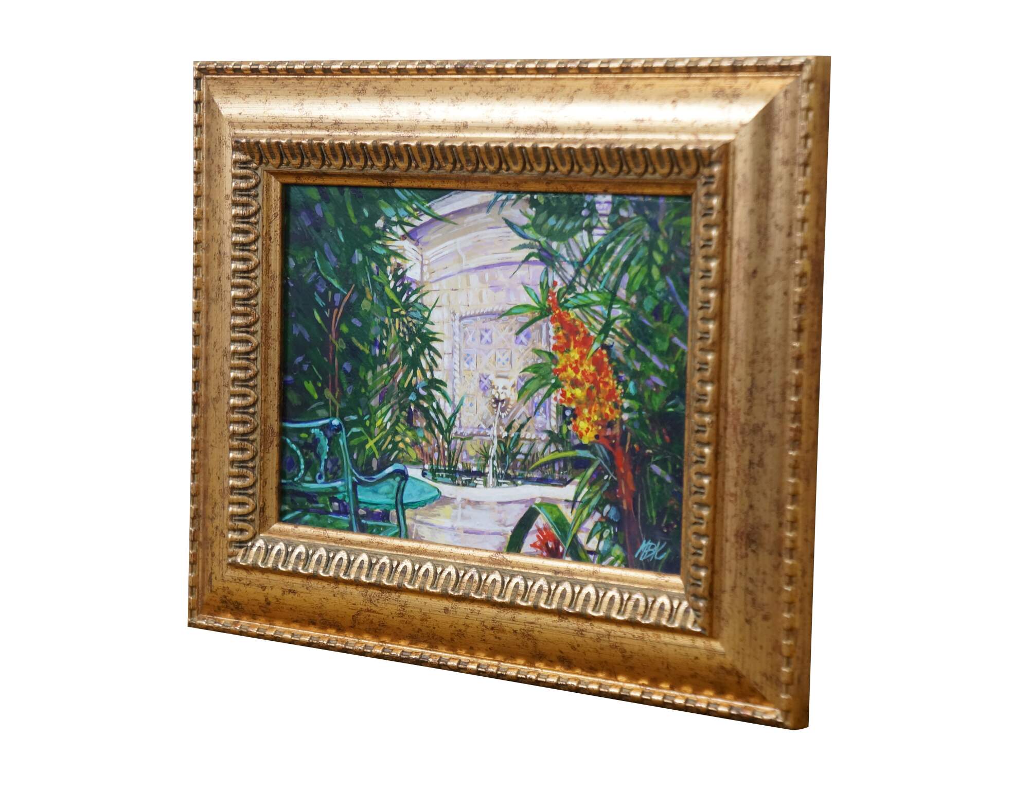 Late 20th century oil on board painting of a marble lion head fountain surrounded by tropical plants and a green bench. Signed MBK, lower right. Gilt composite frame with egg and dart border and beaded edge.