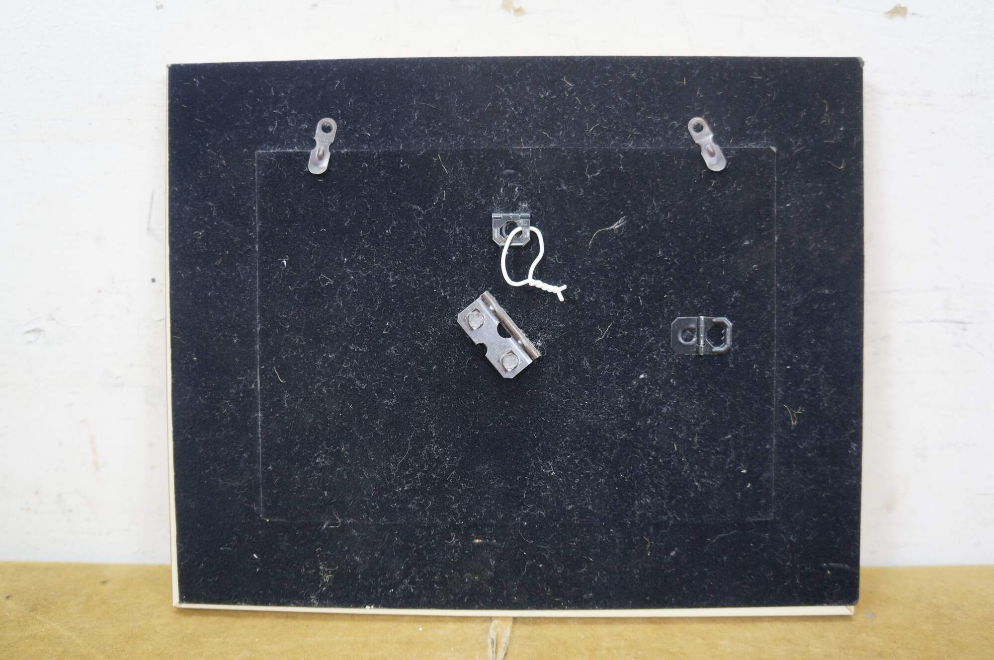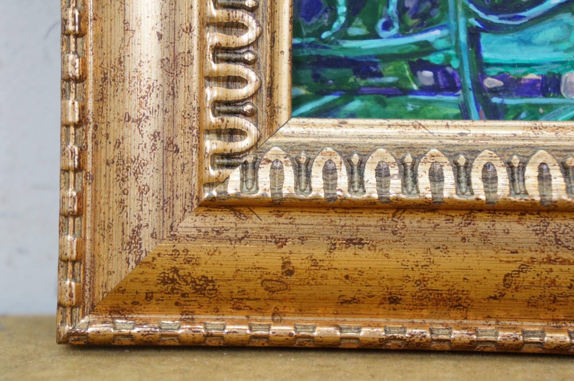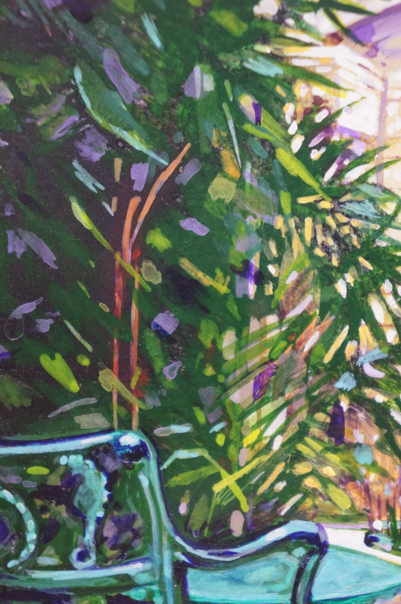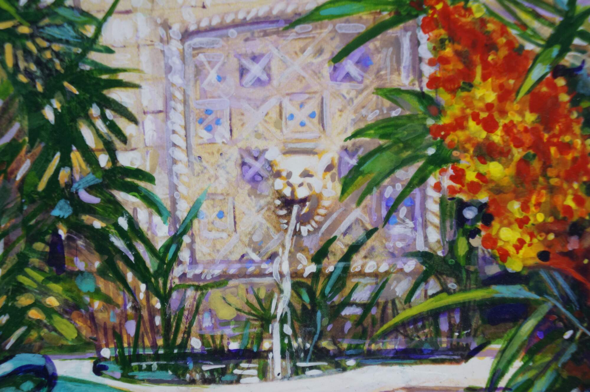 Late 20th century oil on board painting of a marble lion head fountain surrounded by tropical plants and a green bench. Signed MBK, lower right. Gilt composite frame with egg and dart border and beaded edge.