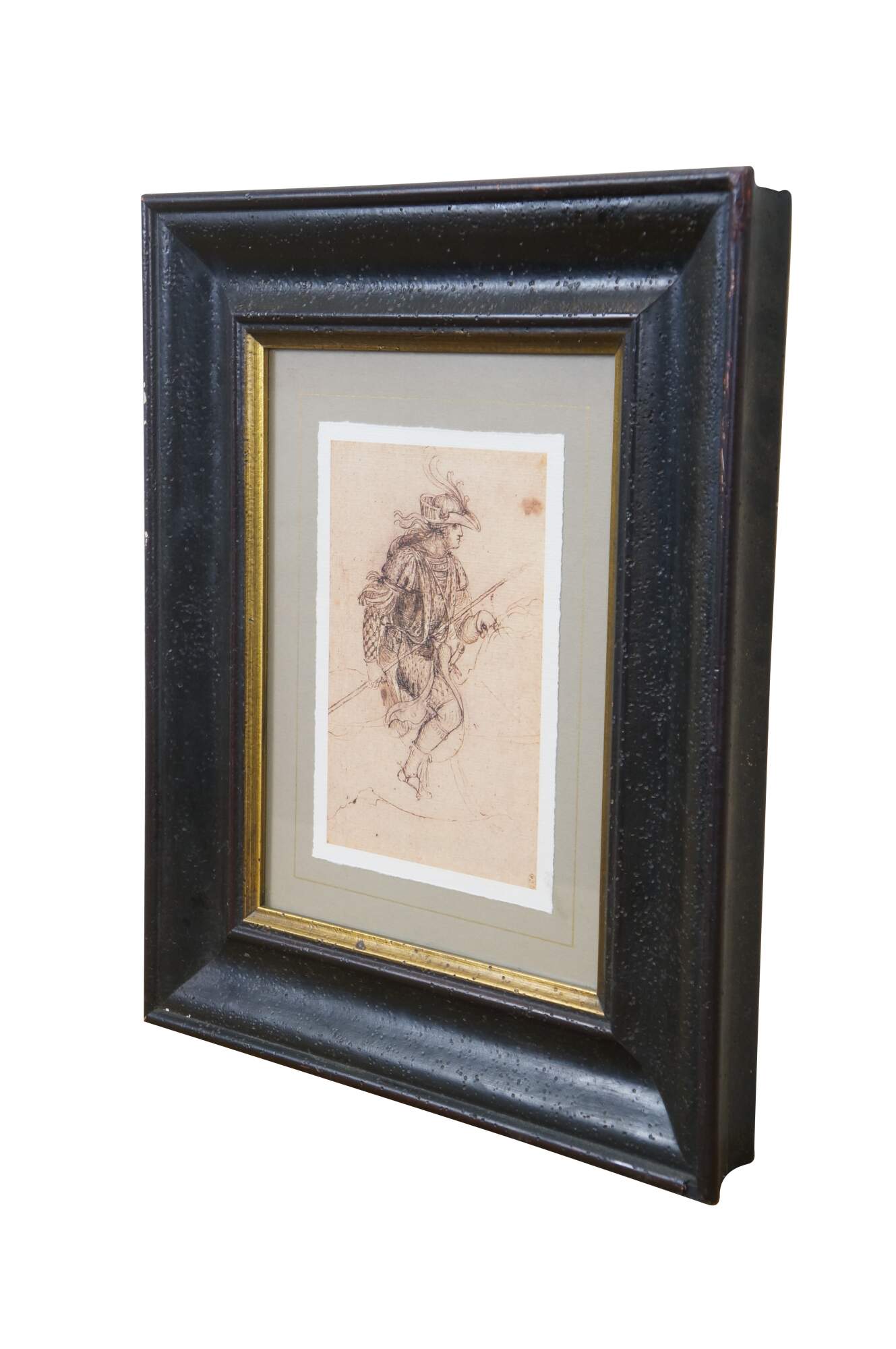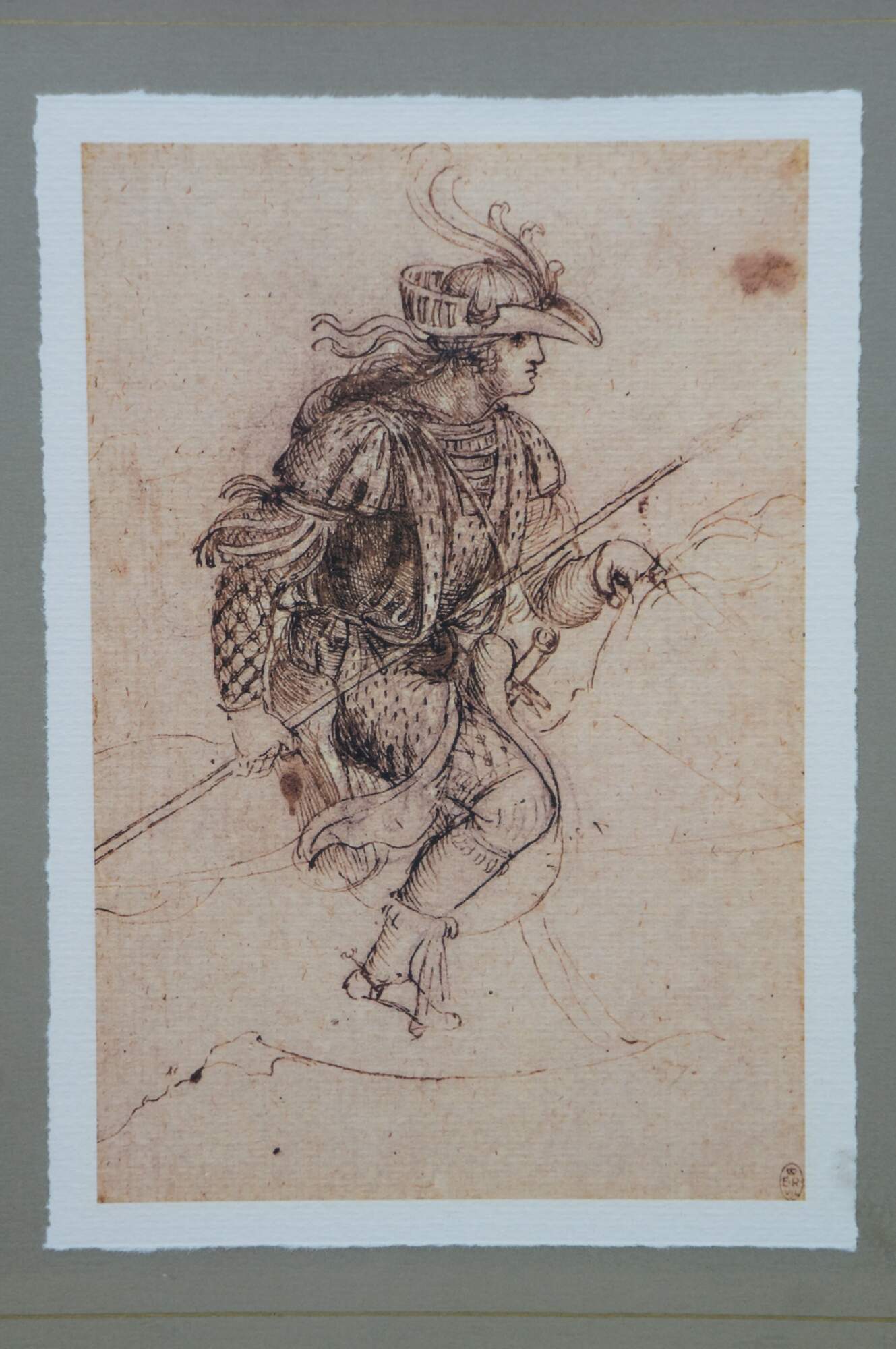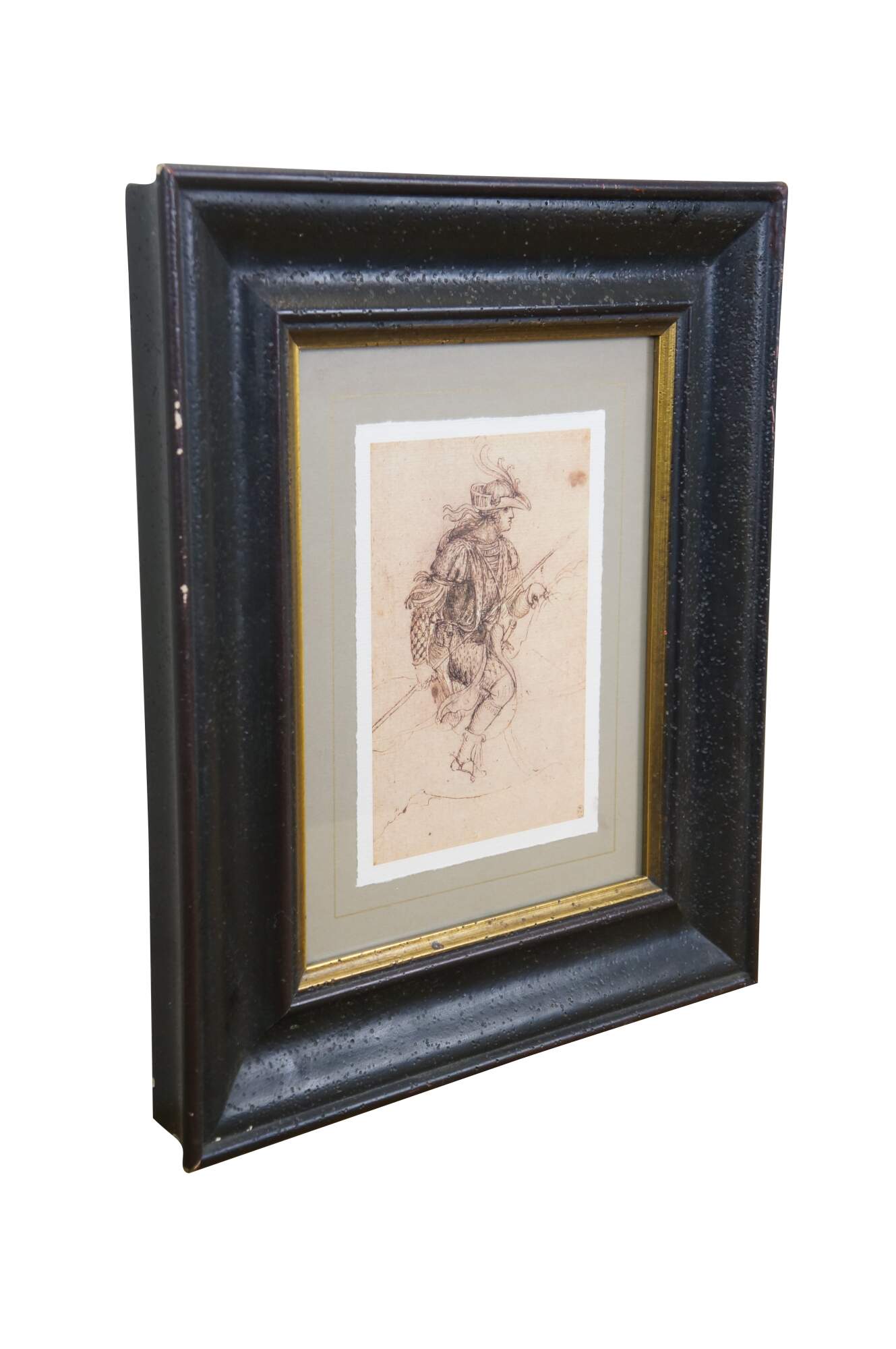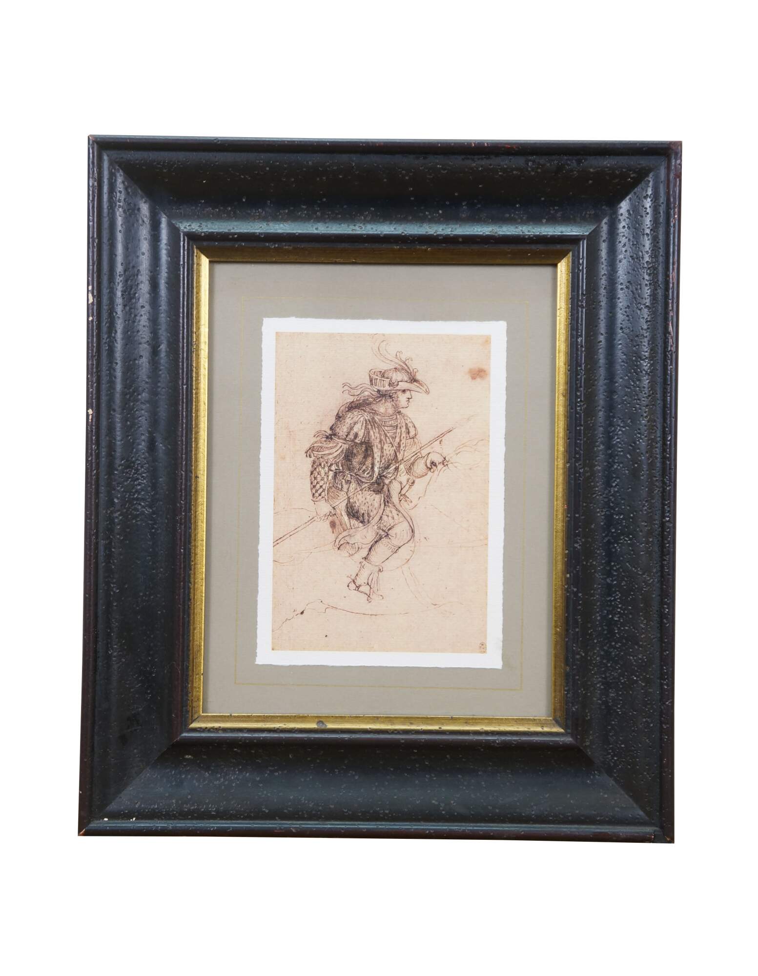 Late 20th century print of "A Masquerader on Horseback" originally drawn by Leonardo Da vinci circa 1517-1518. "A drawing of a young man on horseback, in profile to the right. He wears a masquerade costume, with many feathers, ribbons, and other elaborations. He carries a lance in his right hand. Leonardo was employed at the court of Francis I of France from late 1516 until his death in 1519. At this period, courtly entertainments, requiring ingenious settings and costumes, were popular throughout Europe. Major artists, such as Leonardo, were often involved in designing them, as this drawing demonstrates. The rider’s costume is extremely eye-catching; combining checked and striped fabrics with fur, quilting, and ribbons, which demonstrates the rich and exotic nature of the French court at this time. Text adapted from 'Leonardo da Vinci: the Divine and the Grotesque'" (Royal Collection Trust) Black painted wood & gesso frame with gilt inner border; gray mat. Soicher Marin for Due Process Stables Trading Company.