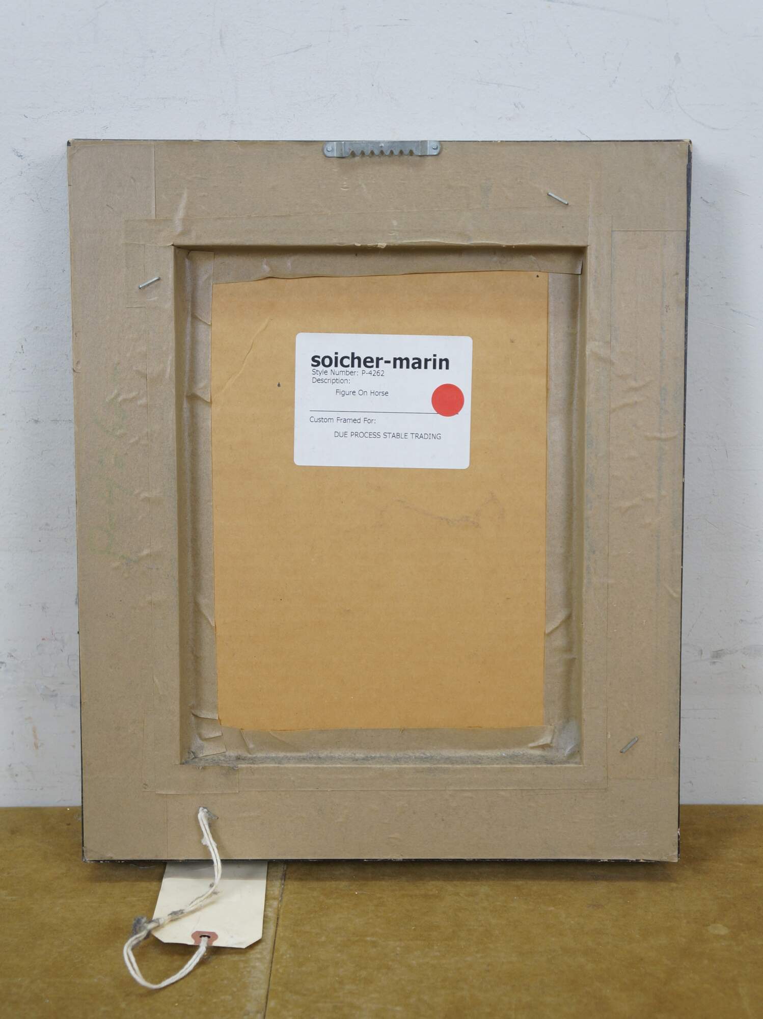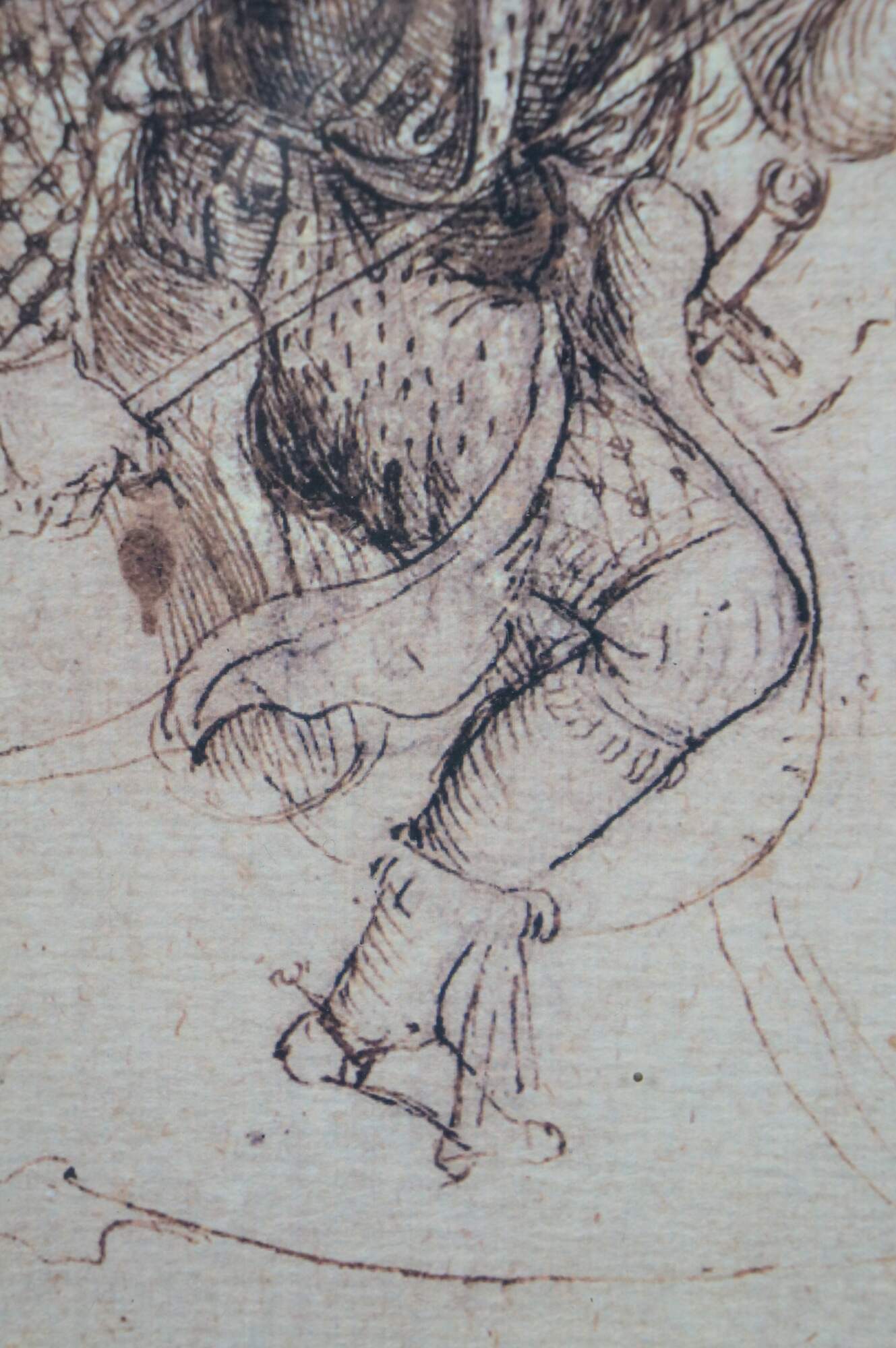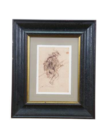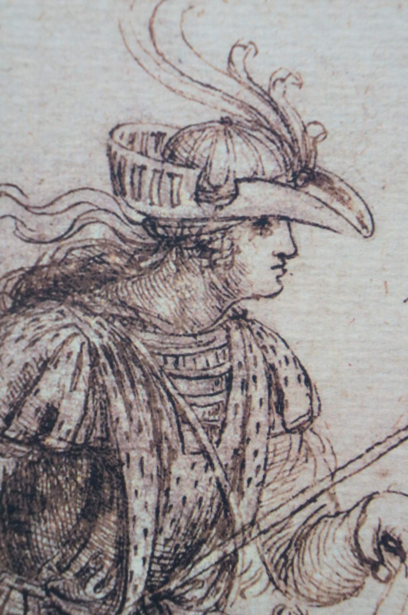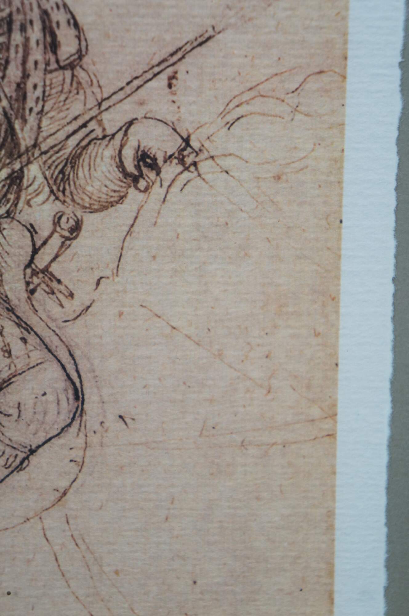 Late 20th century print of "A Masquerader on Horseback" originally drawn by Leonardo Da vinci circa 1517-1518. "A drawing of a young man on horseback, in profile to the right. He wears a masquerade costume, with many feathers, ribbons, and other elaborations. He carries a lance in his right hand. Leonardo was employed at the court of Francis I of France from late 1516 until his death in 1519. At this period, courtly entertainments, requiring ingenious settings and costumes, were popular throughout Europe. Major artists, such as Leonardo, were often involved in designing them, as this drawing demonstrates. The rider’s costume is extremely eye-catching; combining checked and striped fabrics with fur, quilting, and ribbons, which demonstrates the rich and exotic nature of the French court at this time. Text adapted from 'Leonardo da Vinci: the Divine and the Grotesque'" (Royal Collection Trust) Black painted wood & gesso frame with gilt inner border; gray mat. Soicher Marin for Due Process Stables Trading Company.