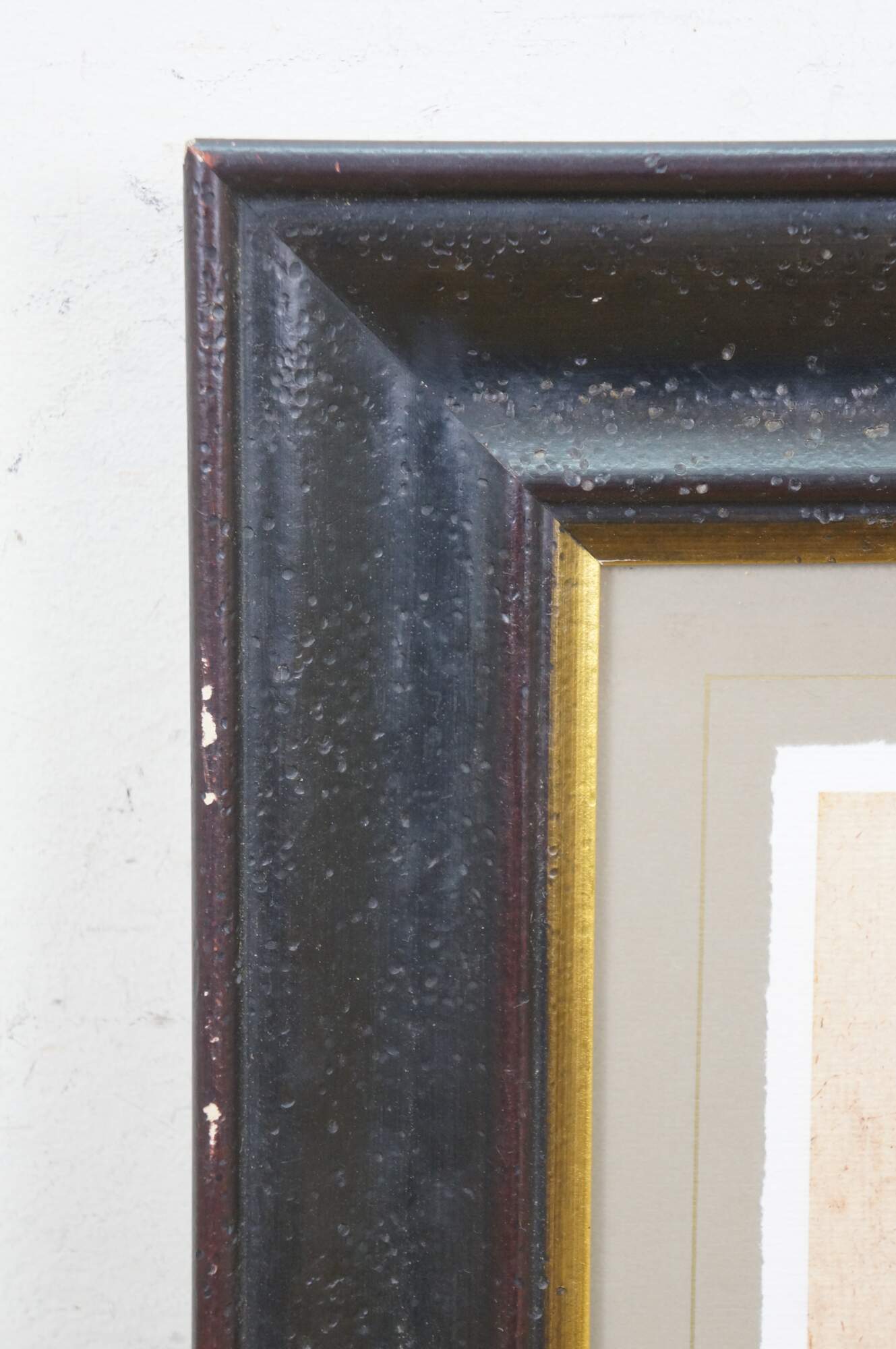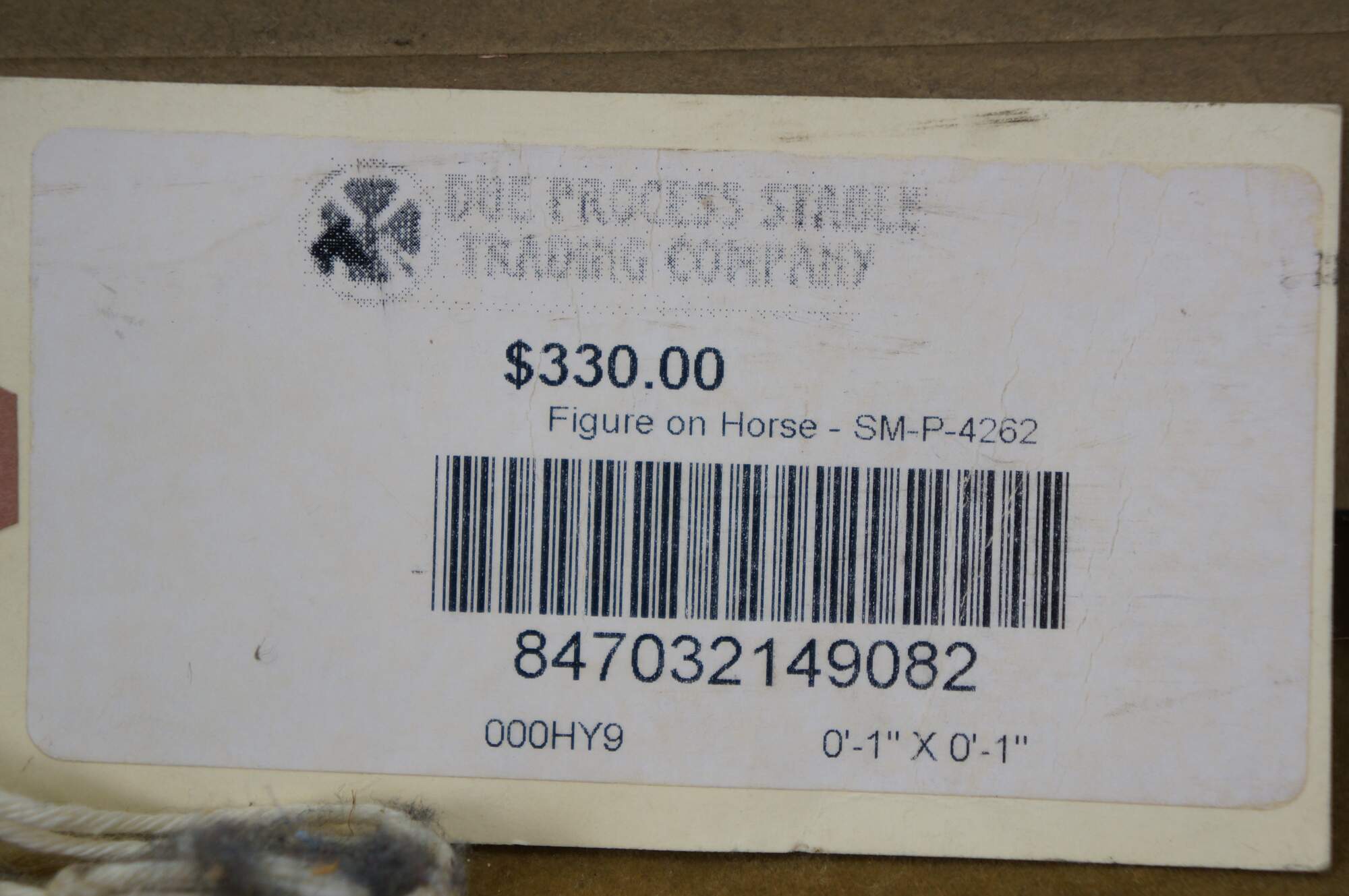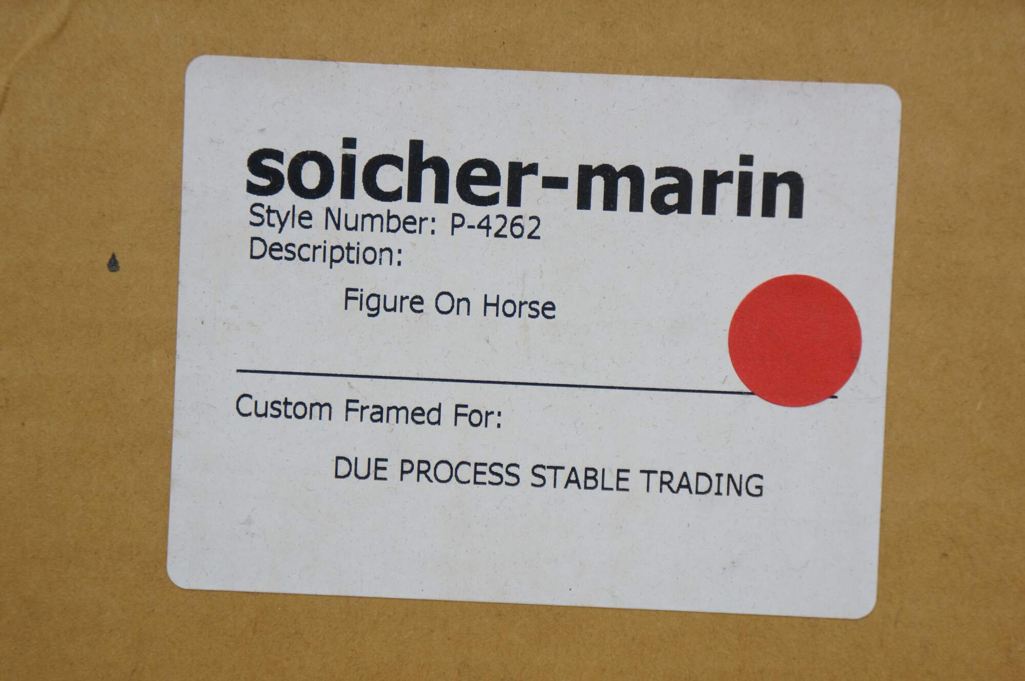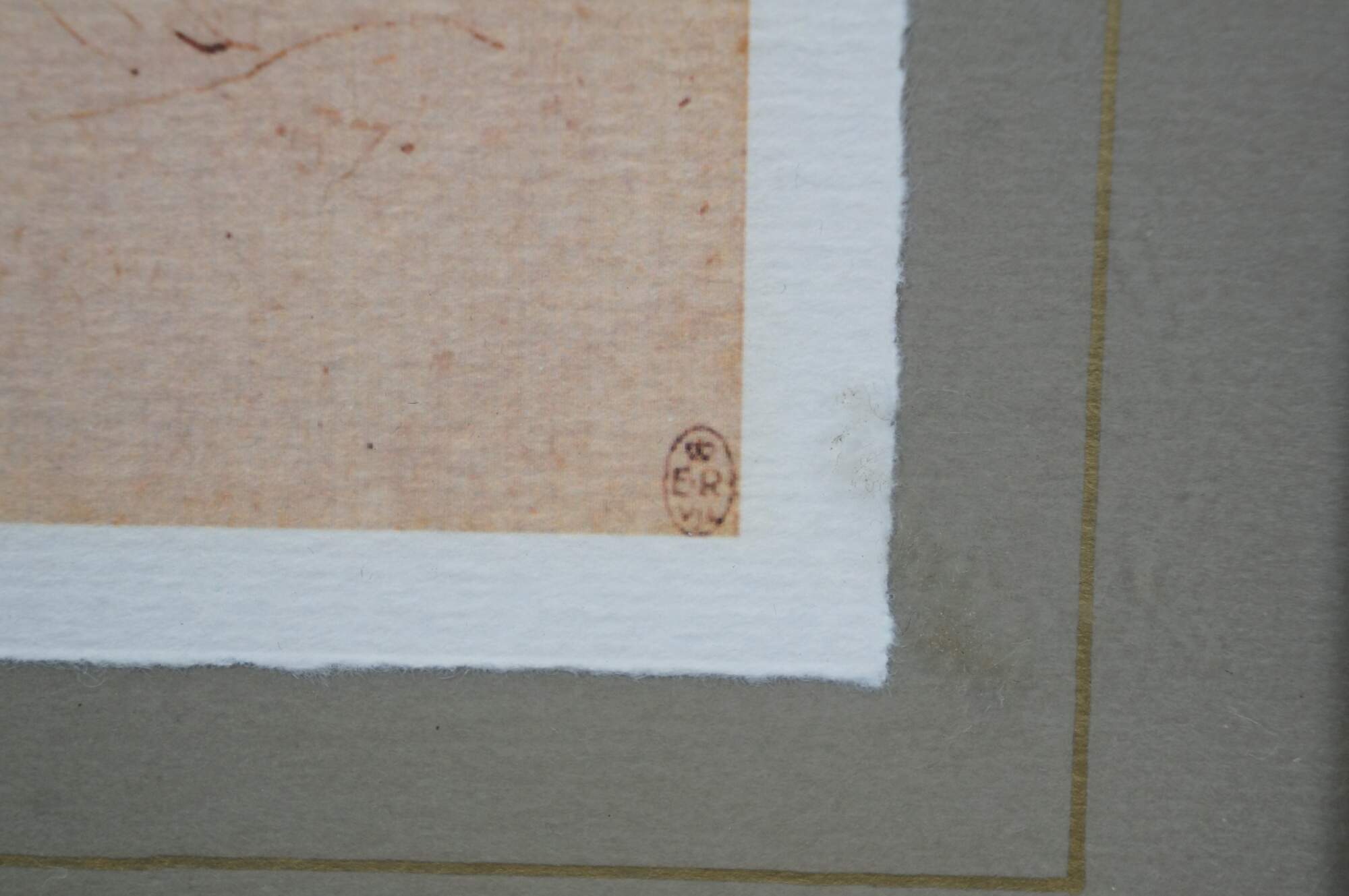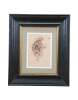 Late 20th century print of "A Masquerader on Horseback" originally drawn by Leonardo Da vinci circa 1517-1518. "A drawing of a young man on horseback, in profile to the right. He wears a masquerade costume, with many feathers, ribbons, and other elaborations. He carries a lance in his right hand. Leonardo was employed at the court of Francis I of France from late 1516 until his death in 1519. At this period, courtly entertainments, requiring ingenious settings and costumes, were popular throughout Europe. Major artists, such as Leonardo, were often involved in designing them, as this drawing demonstrates. The rider’s costume is extremely eye-catching; combining checked and striped fabrics with fur, quilting, and ribbons, which demonstrates the rich and exotic nature of the French court at this time. Text adapted from 'Leonardo da Vinci: the Divine and the Grotesque'" (Royal Collection Trust) Black painted wood & gesso frame with gilt inner border; gray mat. Soicher Marin for Due Process Stables Trading Company.