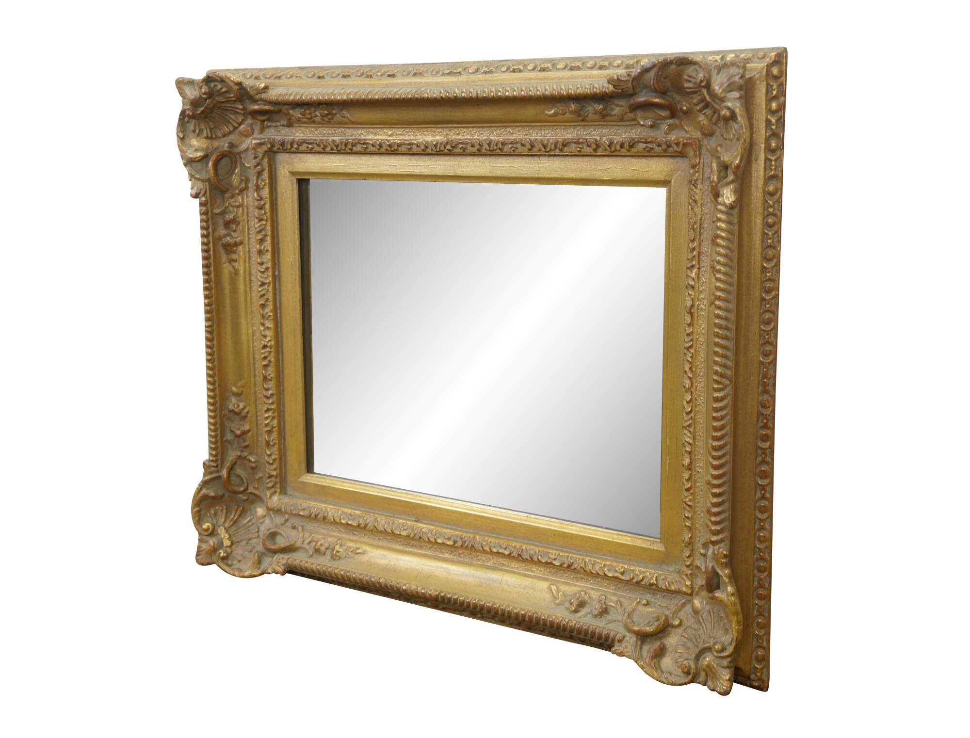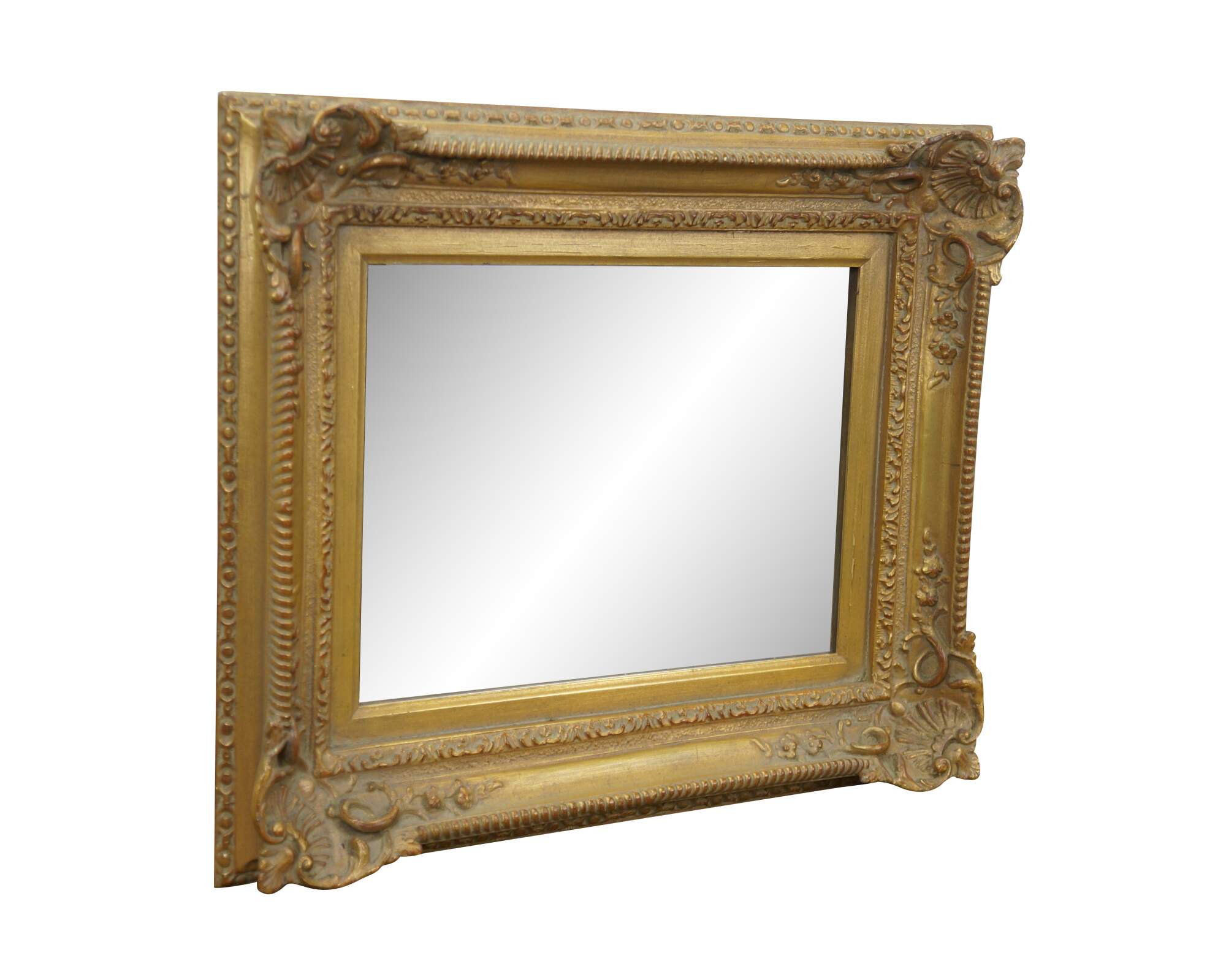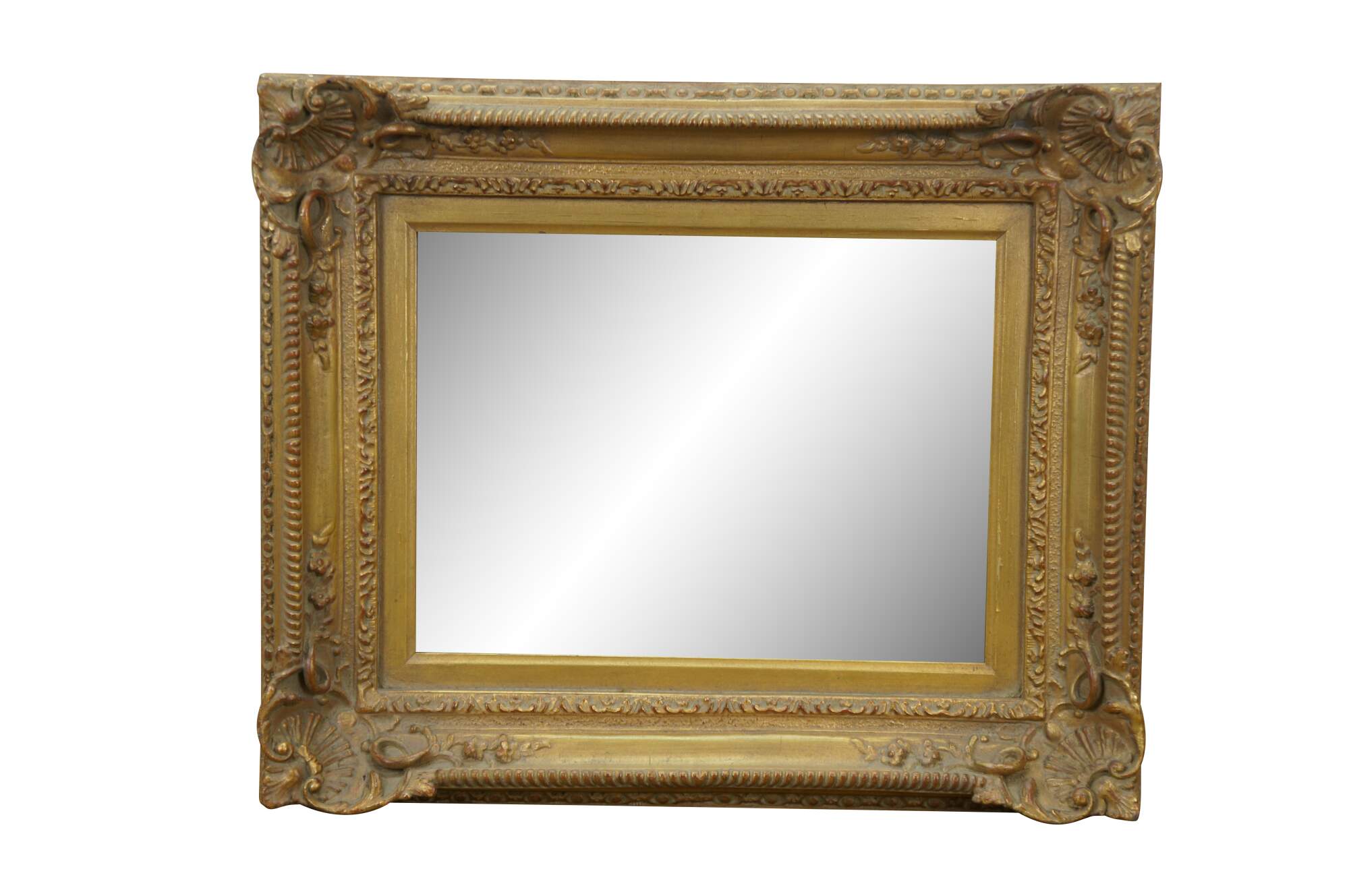 Late 20th century rectangular wall mirror with beveled glass. Gilt French baroque / rococo composite frame with foliate vines and scallop shell corners.