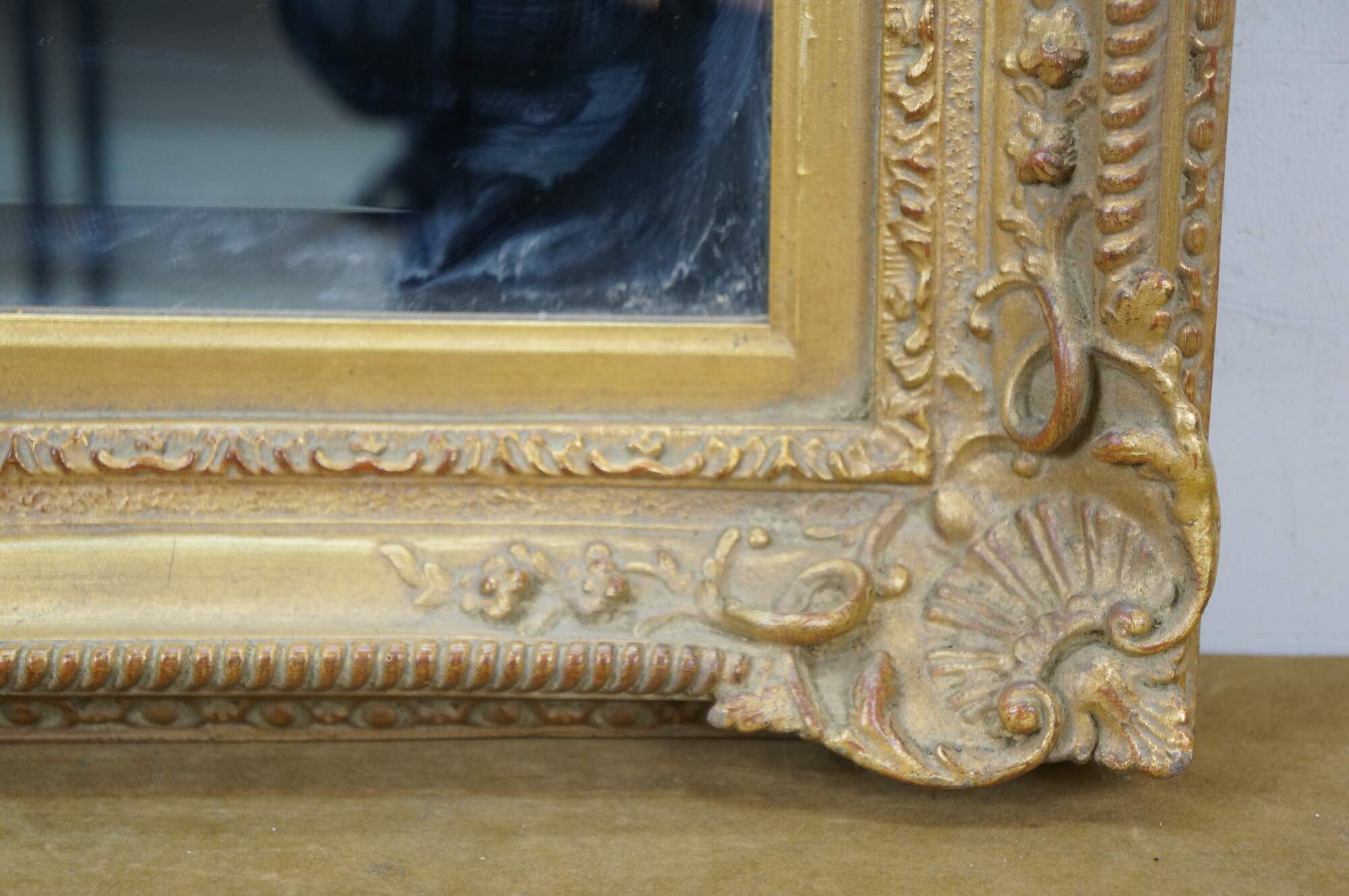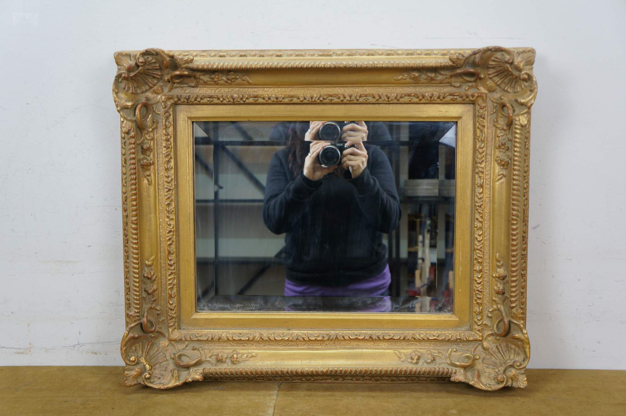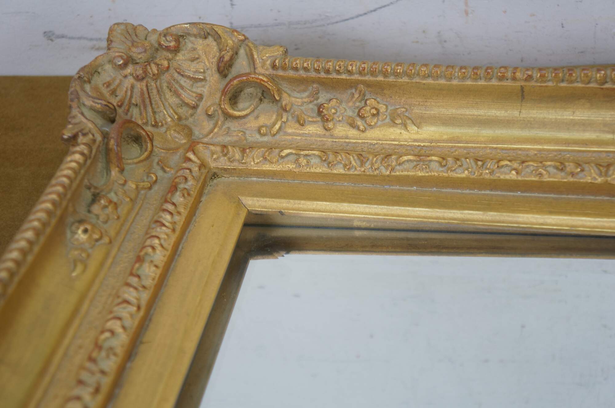 Late 20th century rectangular wall mirror with beveled glass. Gilt French baroque / rococo composite frame with foliate vines and scallop shell corners.