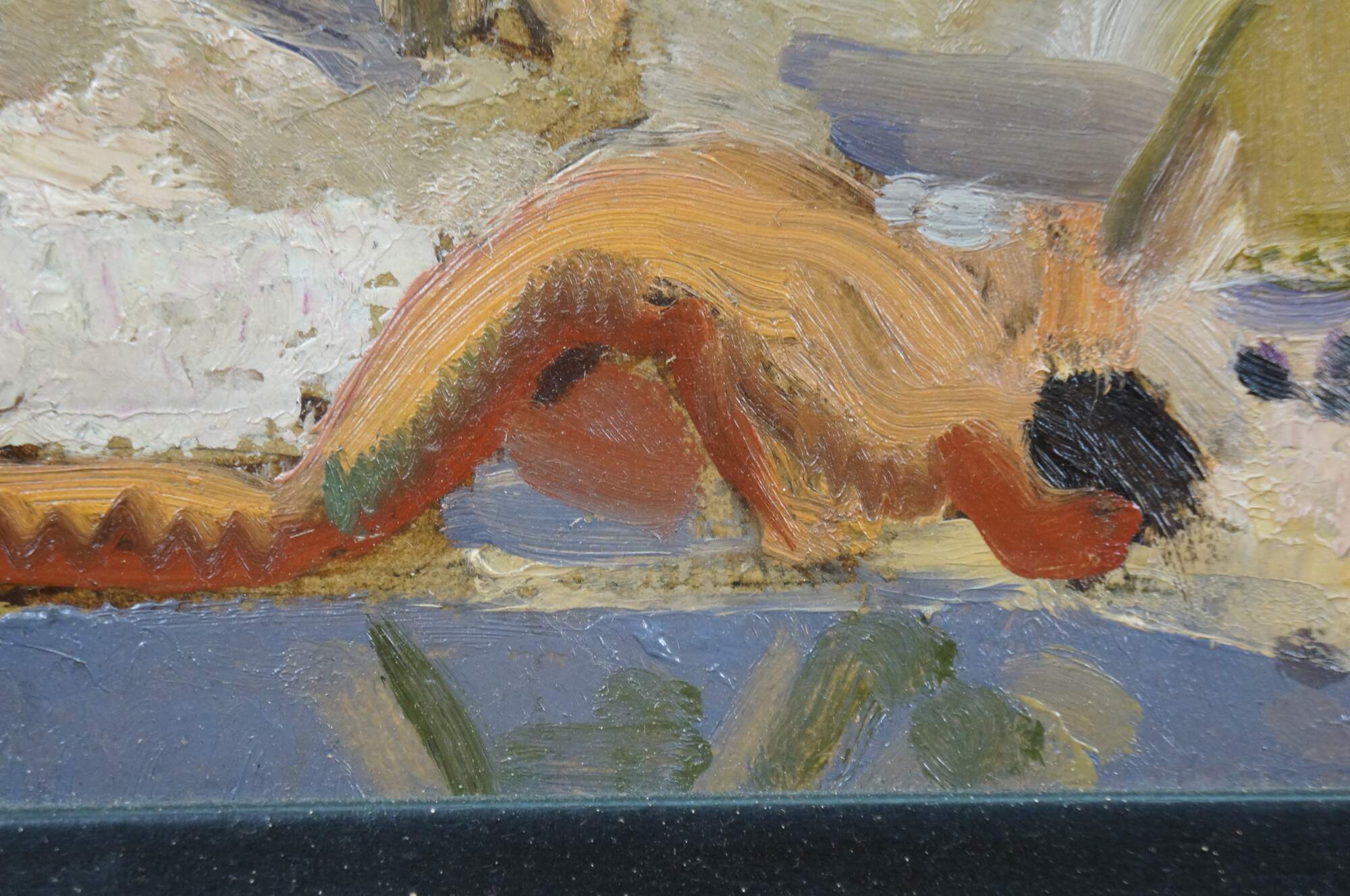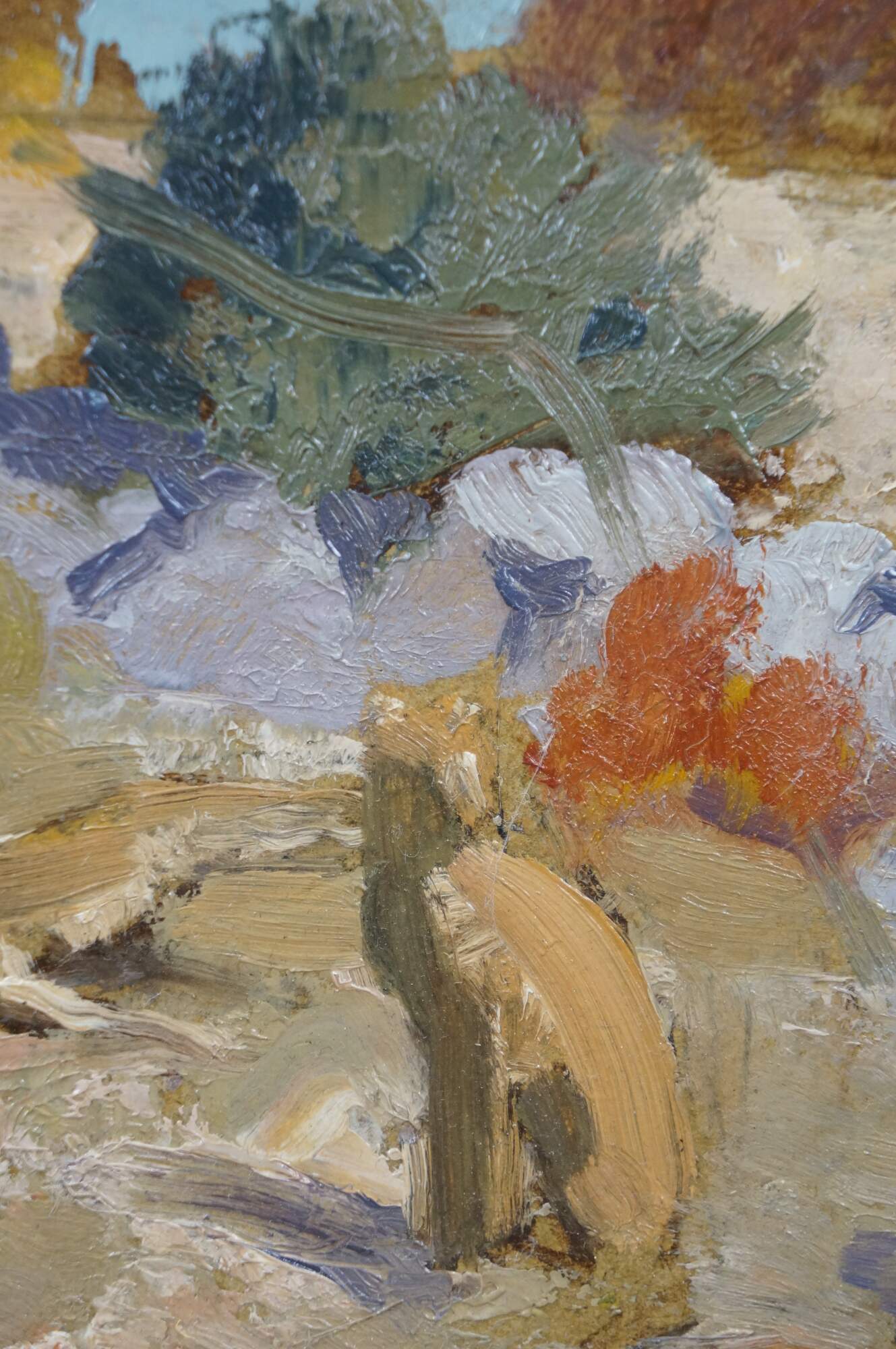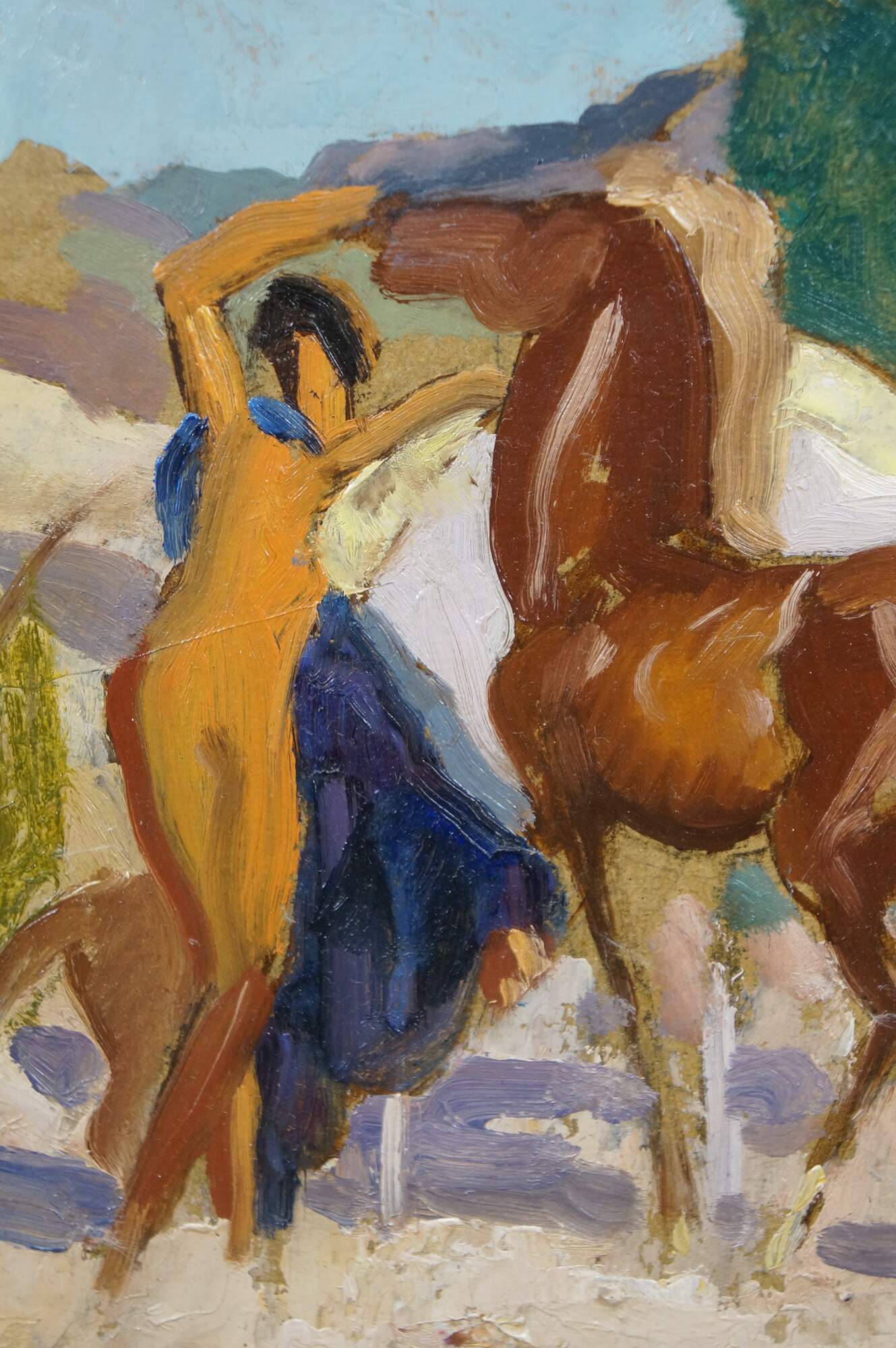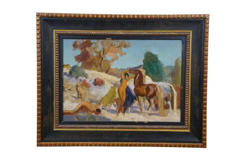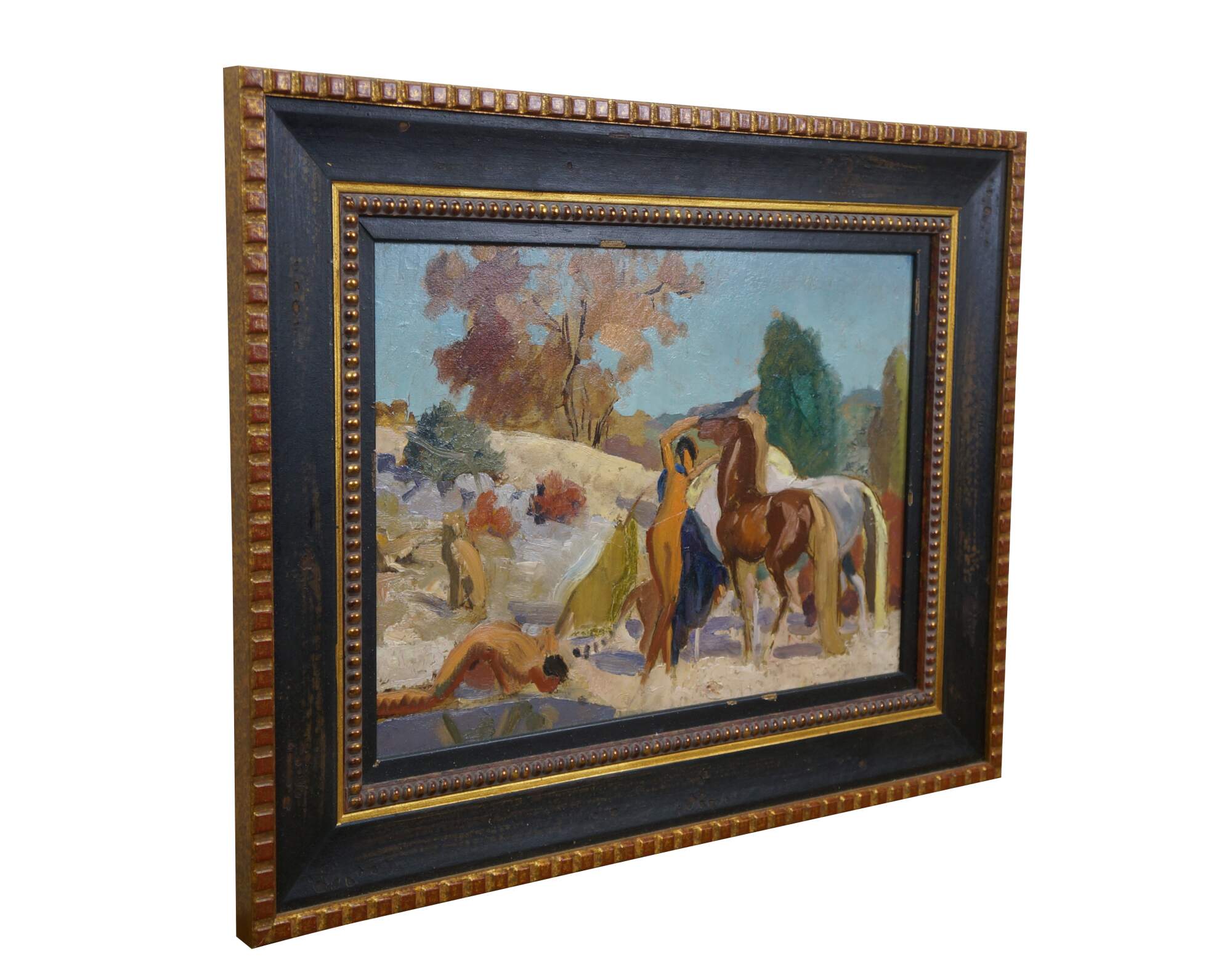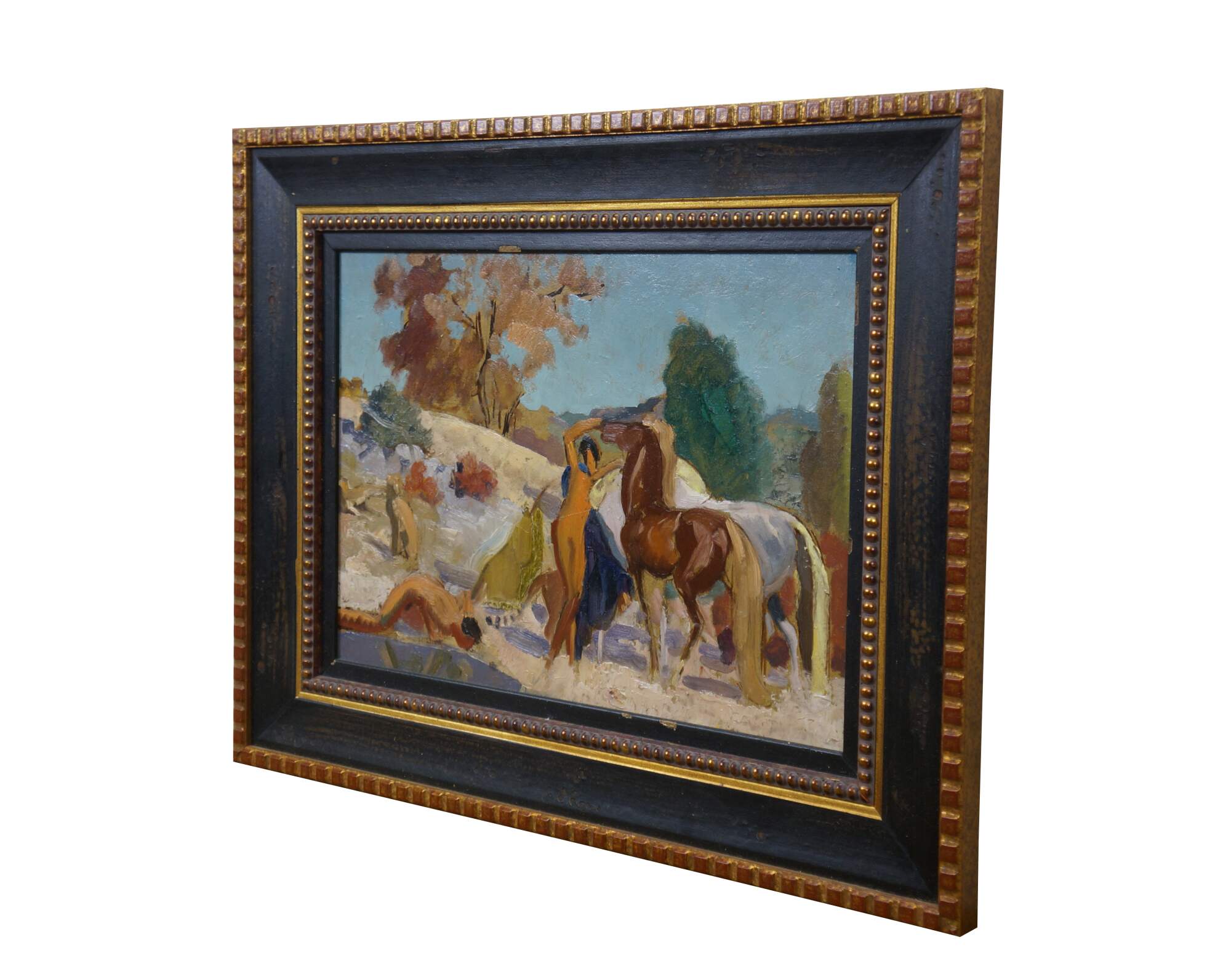 Late 20th century oil painting on board styled after "Les Dioscures (The Dioscuri)" by Robert Eugène Pougheon. An impressionist / expressionist landscape showing Castor and Pollox, two sons of Zeus at a watering hole with horses and other animals. Black and gilt composite frame with beaded edges.