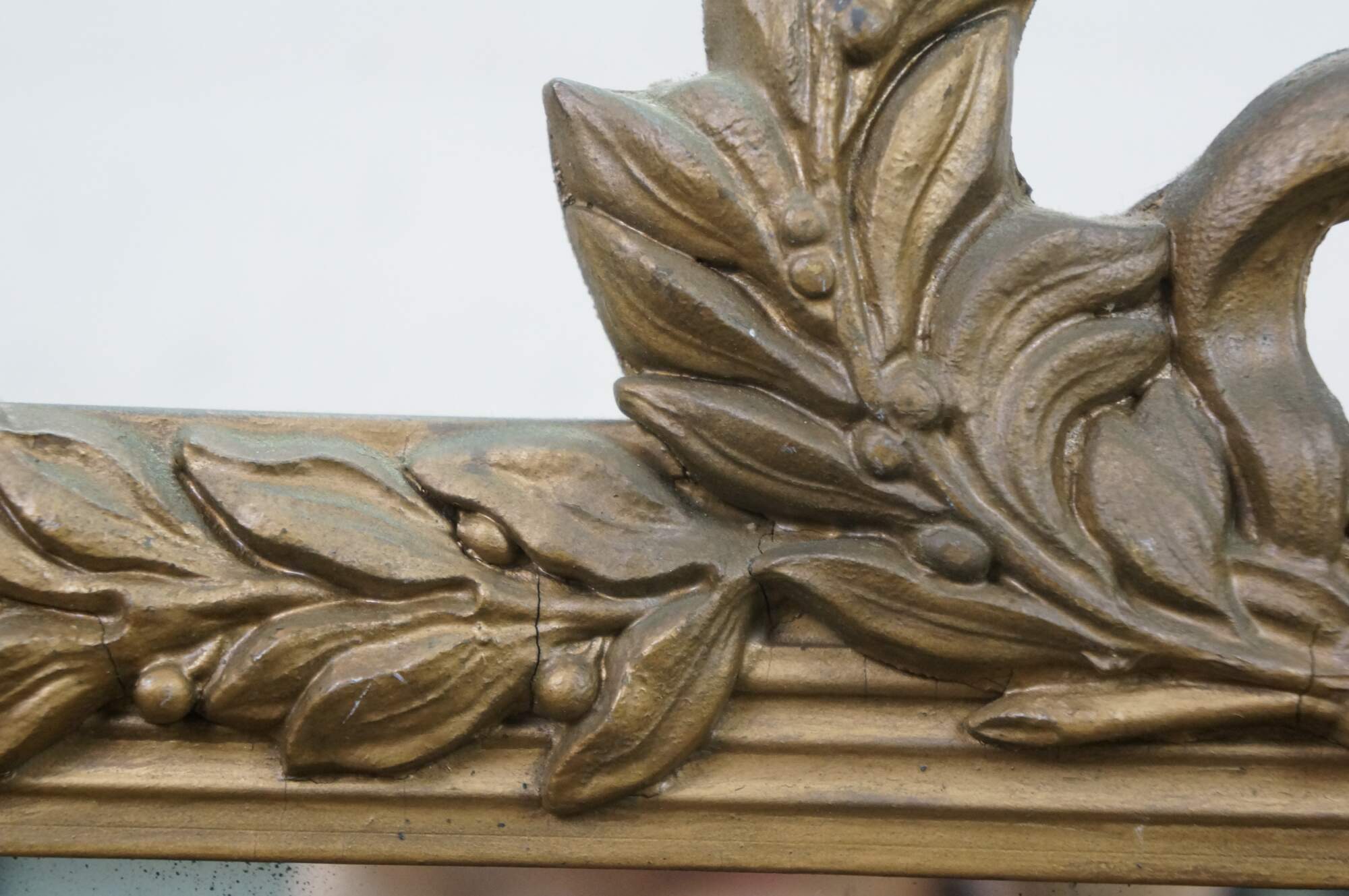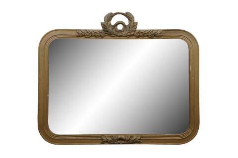 Antique French Louis XVI / Neoclassical gold gilt / gesso mirror featuring an elaborate Laurel Wreath crest design with rounded corners. A laurel wreath is a circular or horseshoe-shaped crown made of interlocking branches and leaves from the bay laurel plant (Laurus nobilis), historically worn on the head to symbolize victory, honor, and high status. Originating in Greek mythology and adopted by Ancient Rome, they recognized champions, military commanders, poets, and emperors.