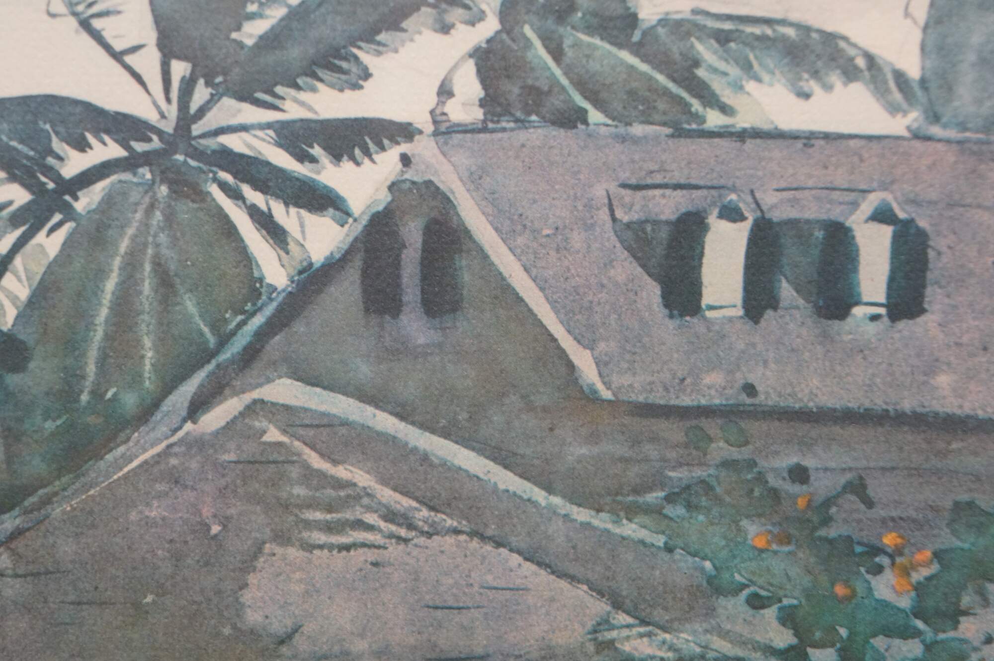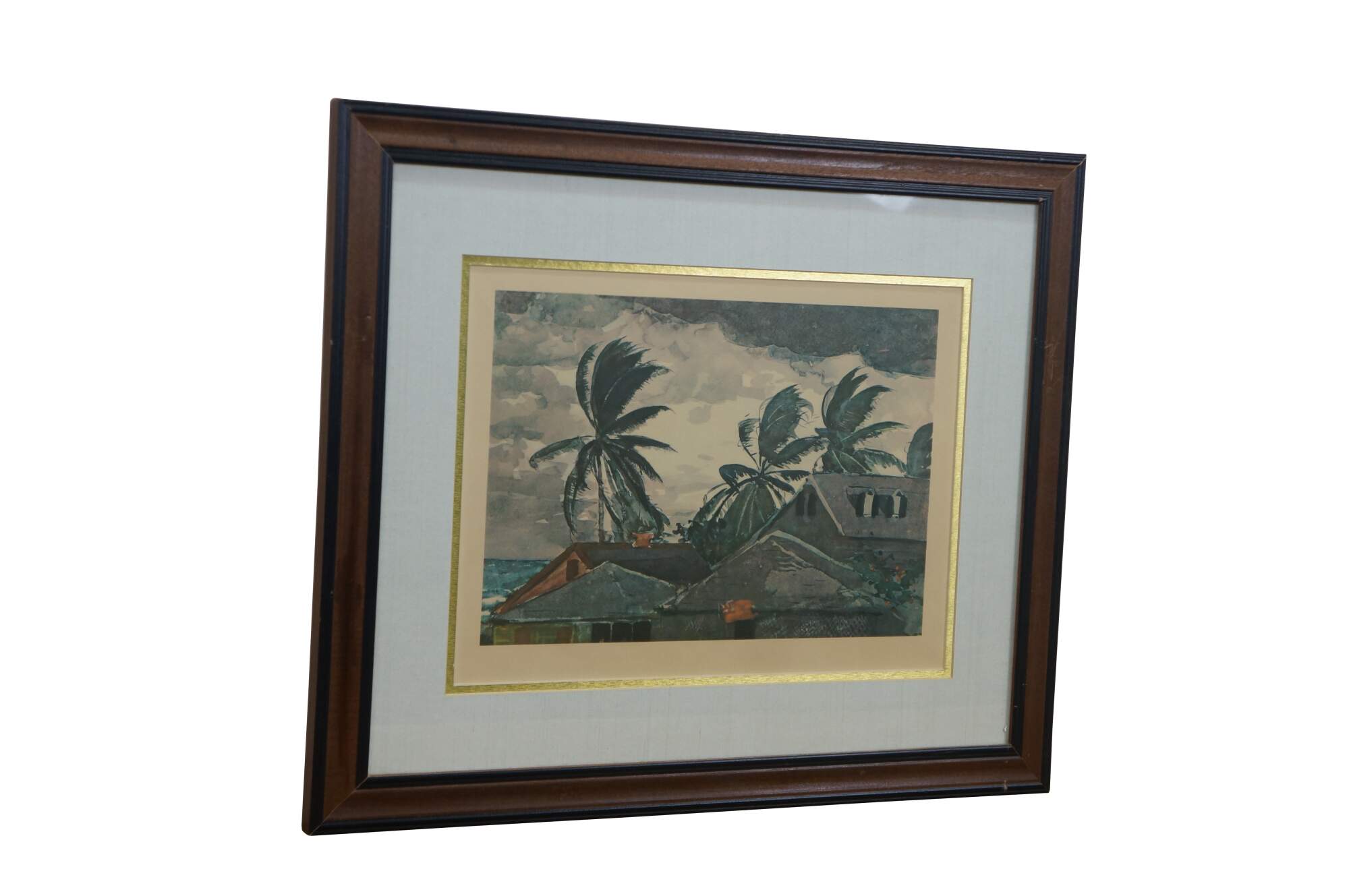 Vintage print after an original watercolor painting titled (Hurricane, Bahamas) created by American artist Winslow Homer in 1898. Winslow Homer (1836–1910) painted this scene during a period when he was deeply absorbed by the power of the sea. The painting captures the dramatic atmosphere of a storm approaching, with palm trees bending under strong winds over coastal houses in the Bahamas.