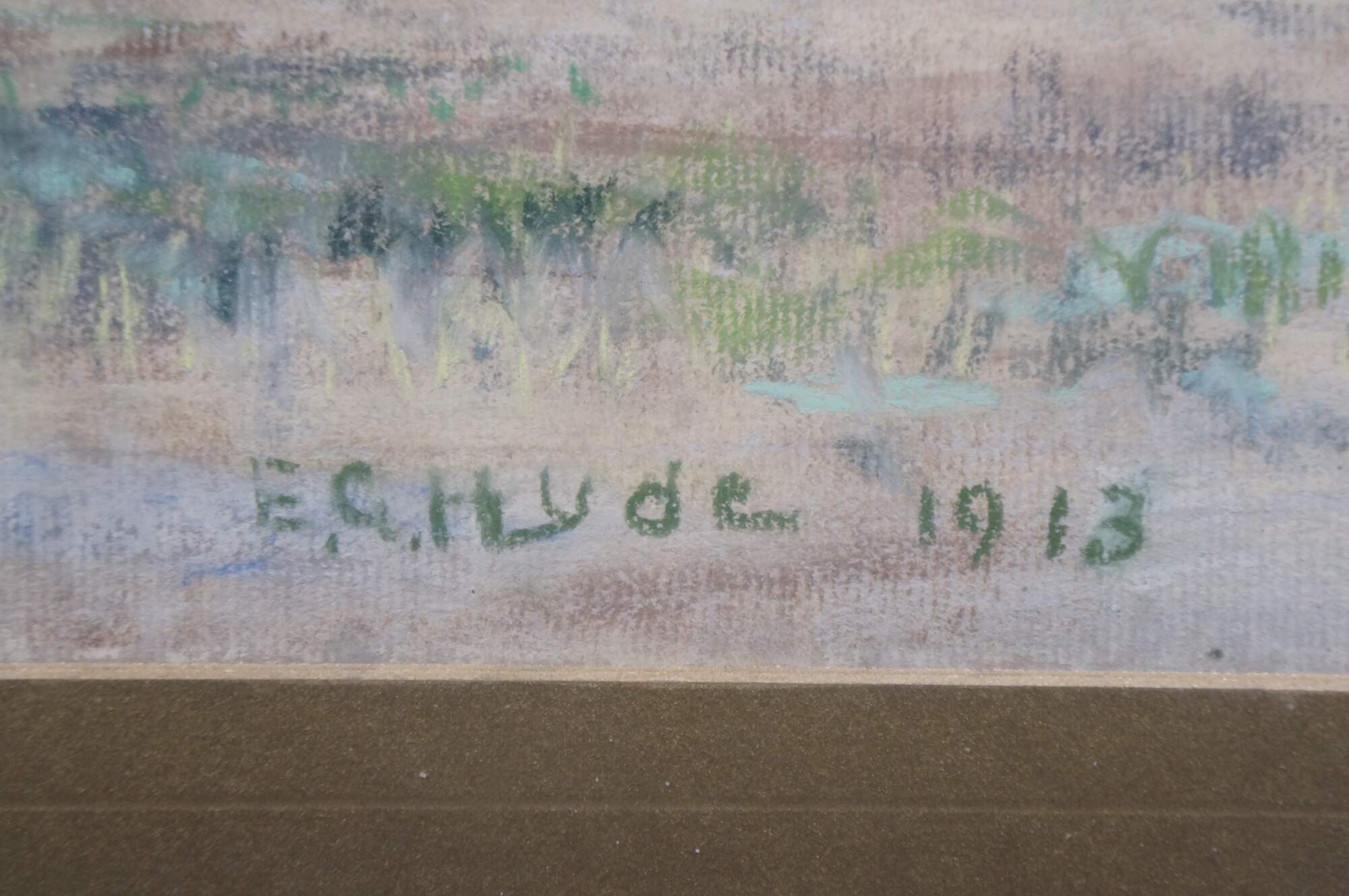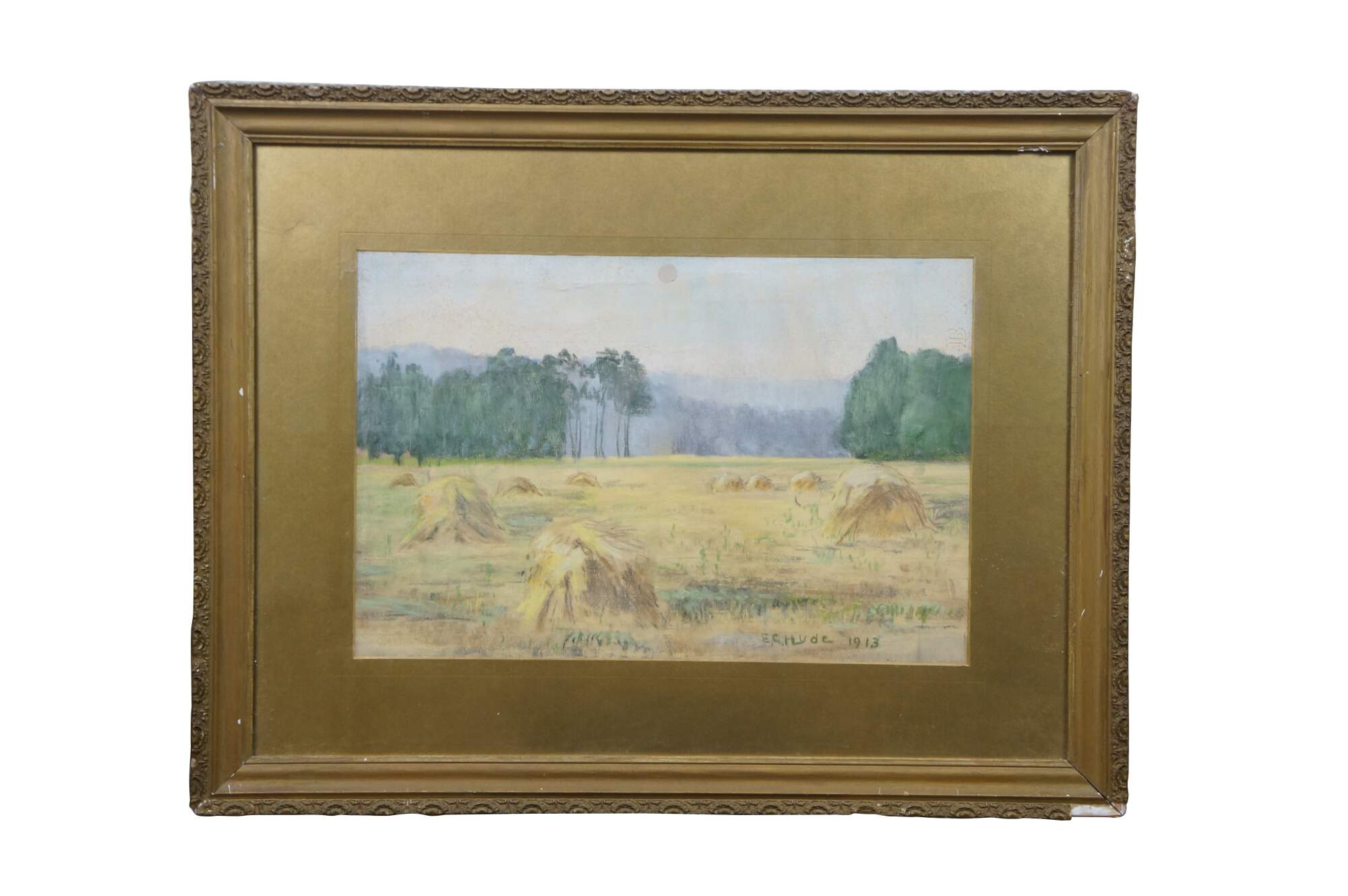 Antique 1913 Emily G. Hyde impressionist pastel on paper painting featuring a rural Indiana country farm / field landscape with haystacks / bales or sheaves under a hazy sky. Gold gesso frame.