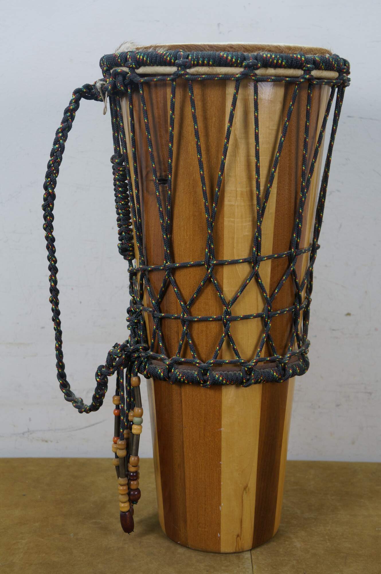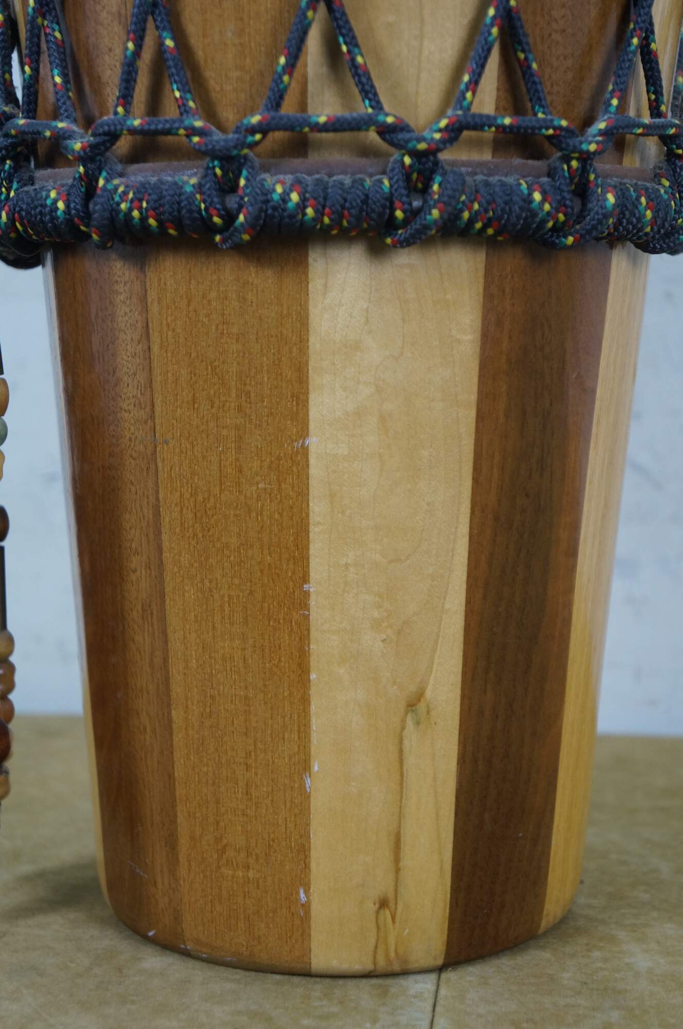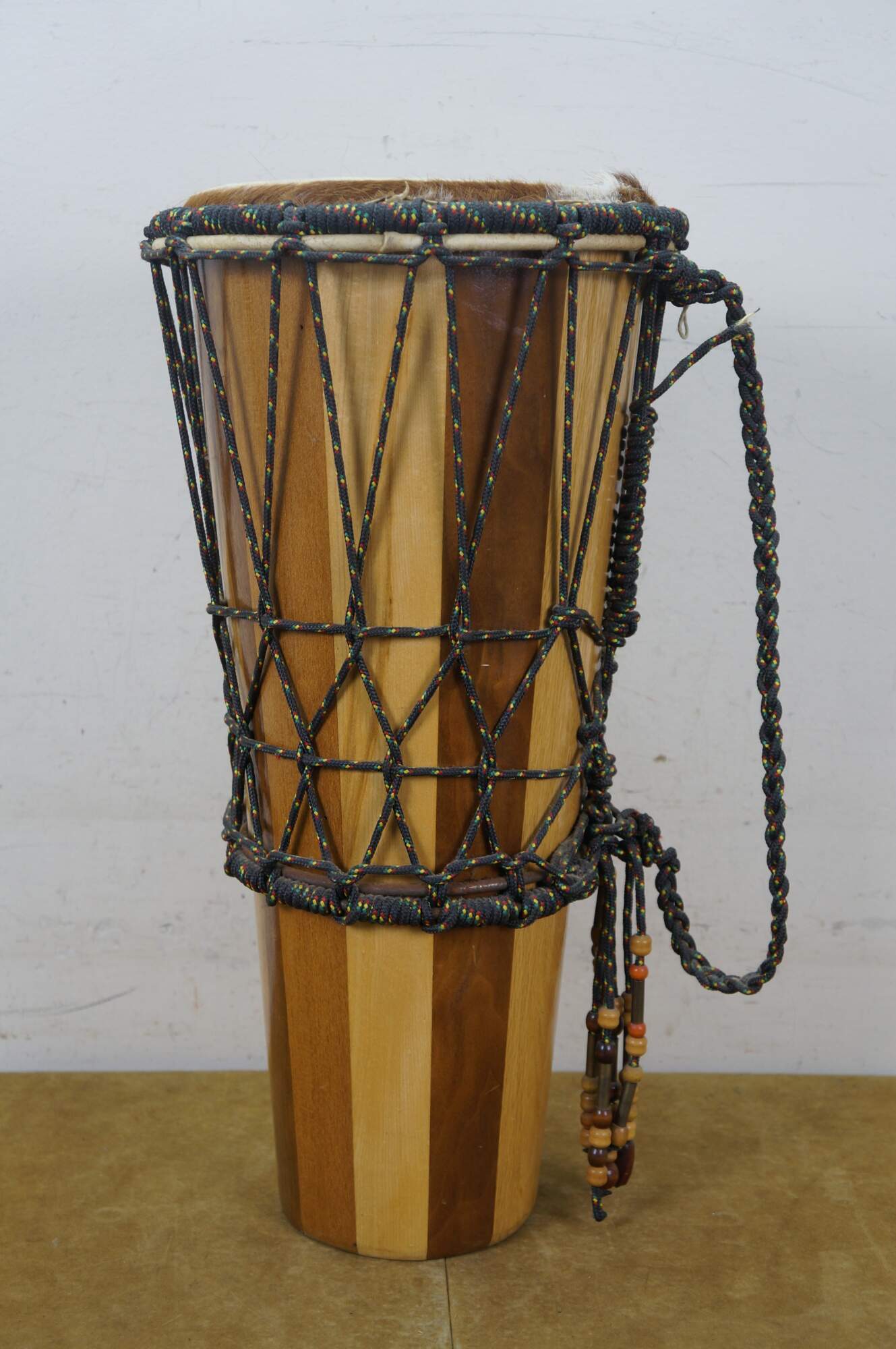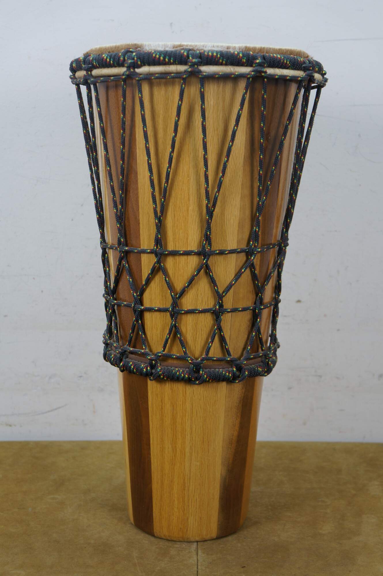 Late 20th century ashiko drum - tapered body of multi-toned panels of hardwood, toped with an 10" goat skin head, painted with folk art / tribal wave and animal design, bound with black speckled paracord.