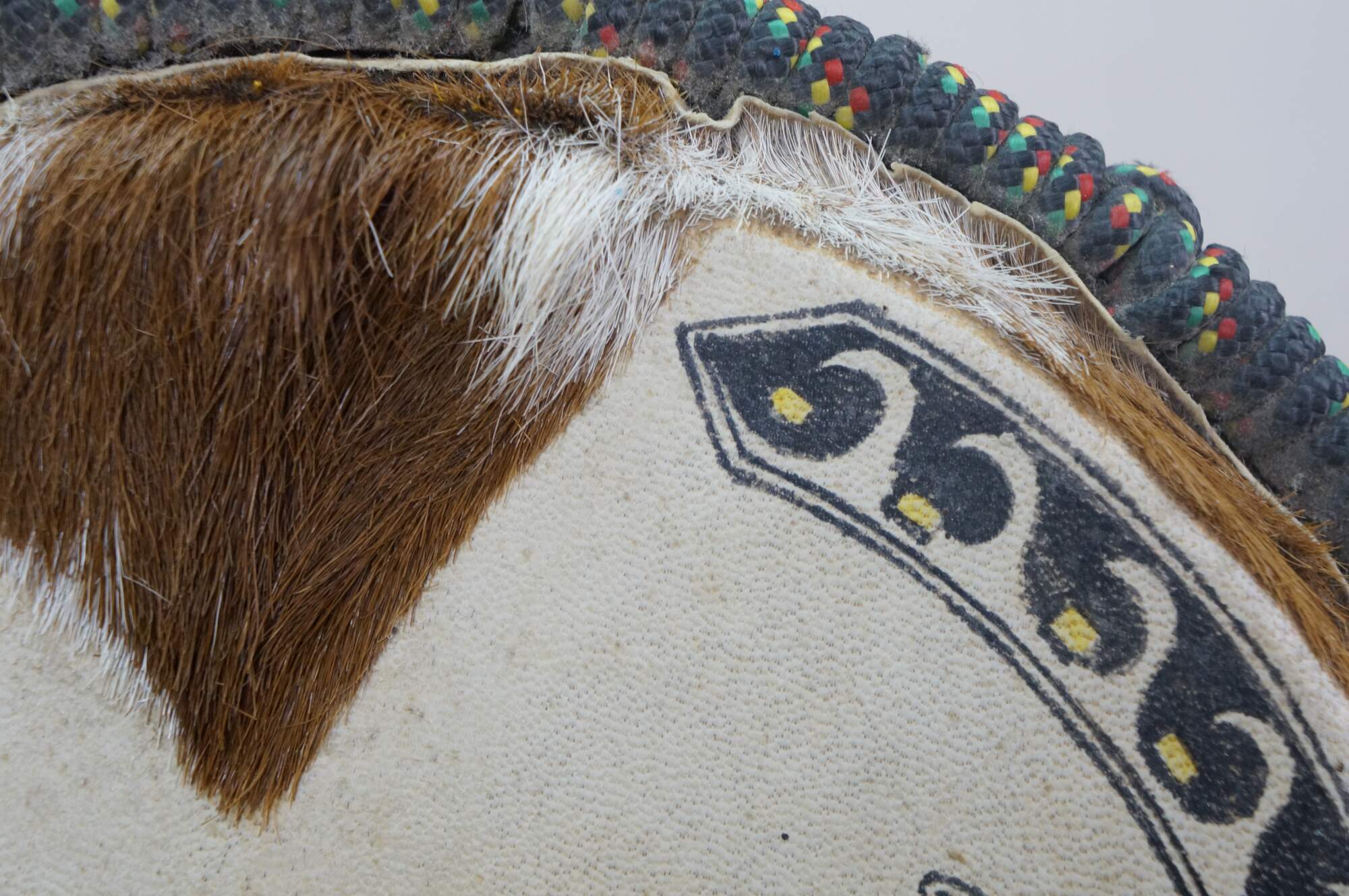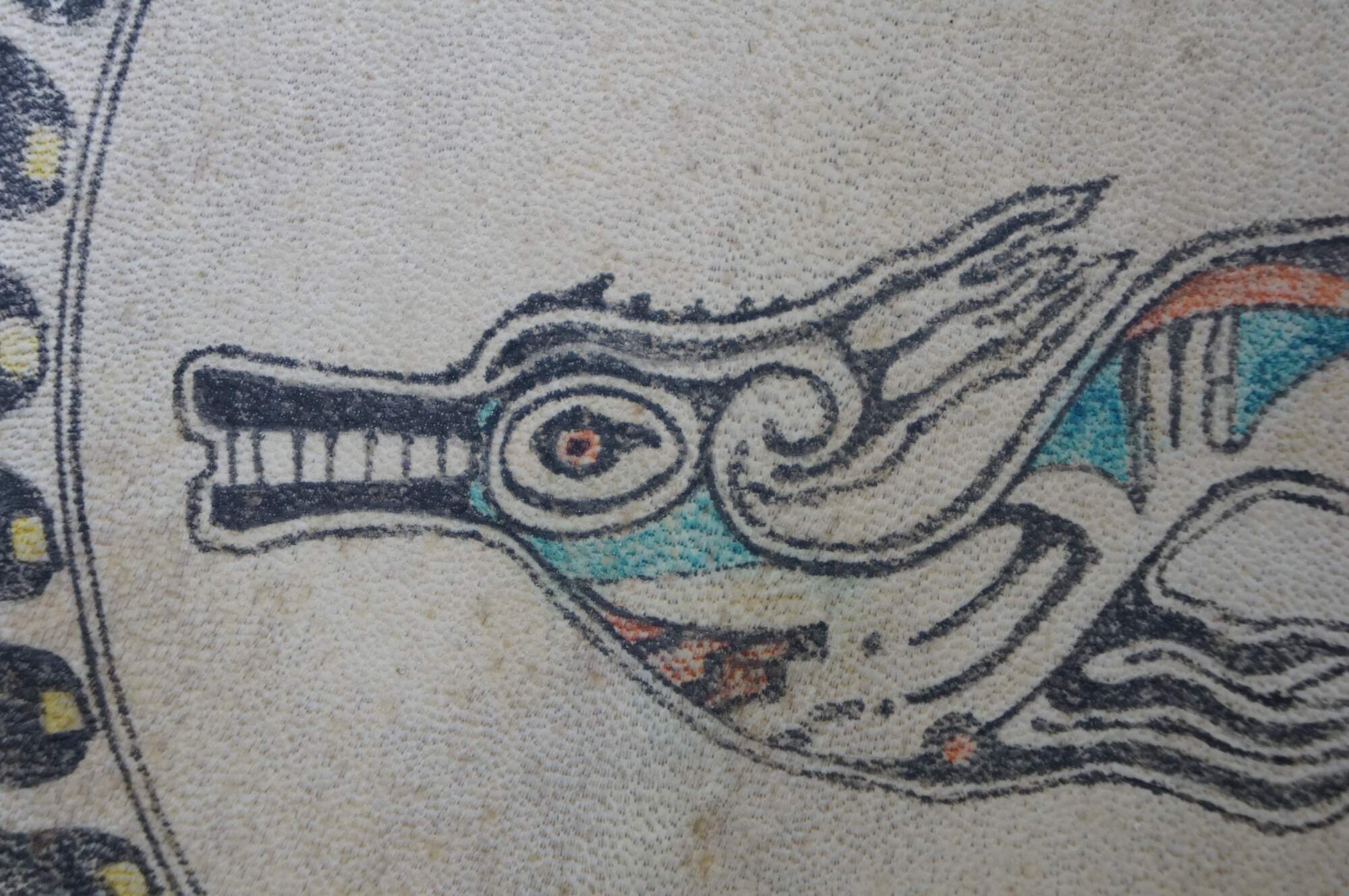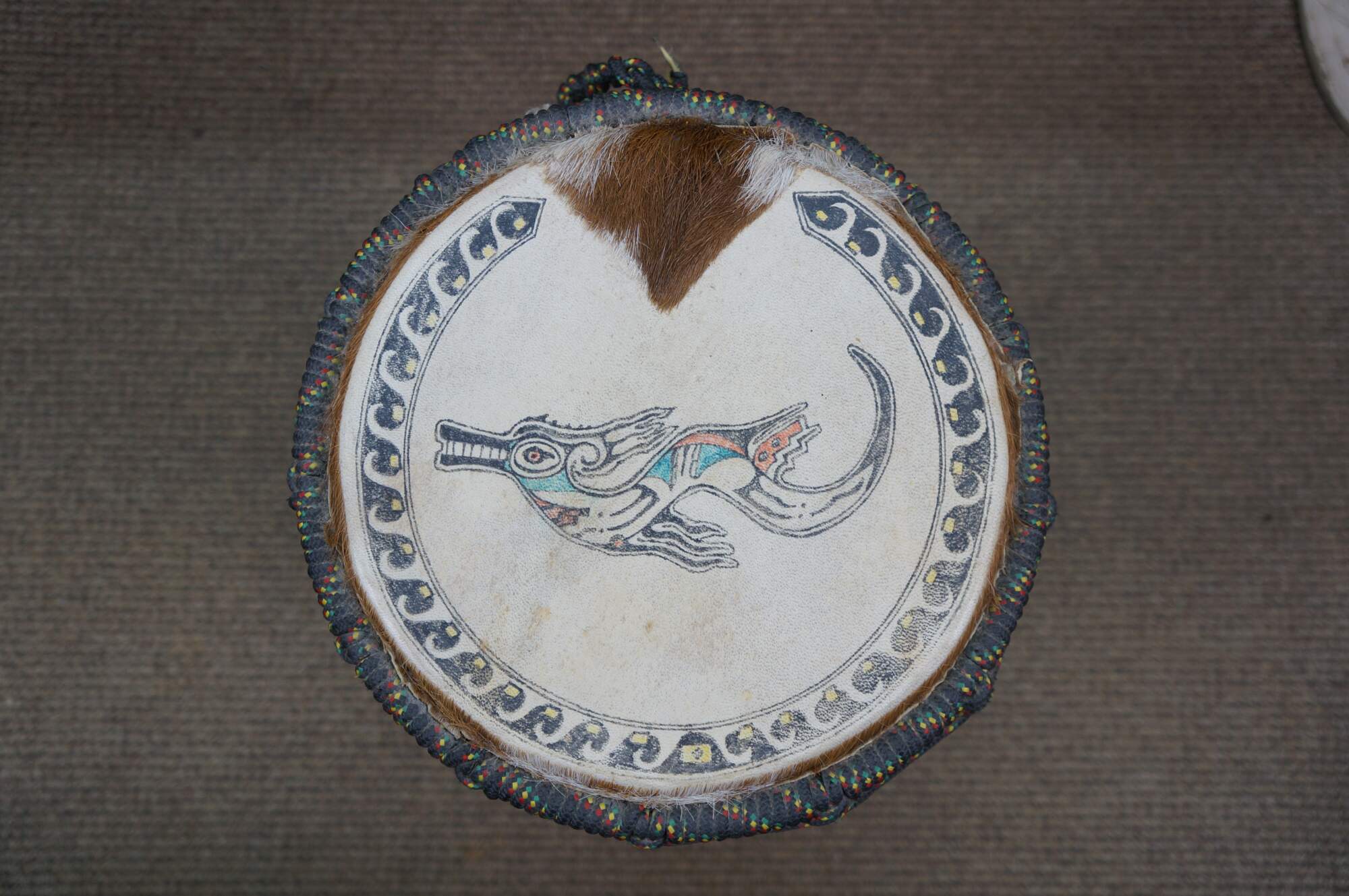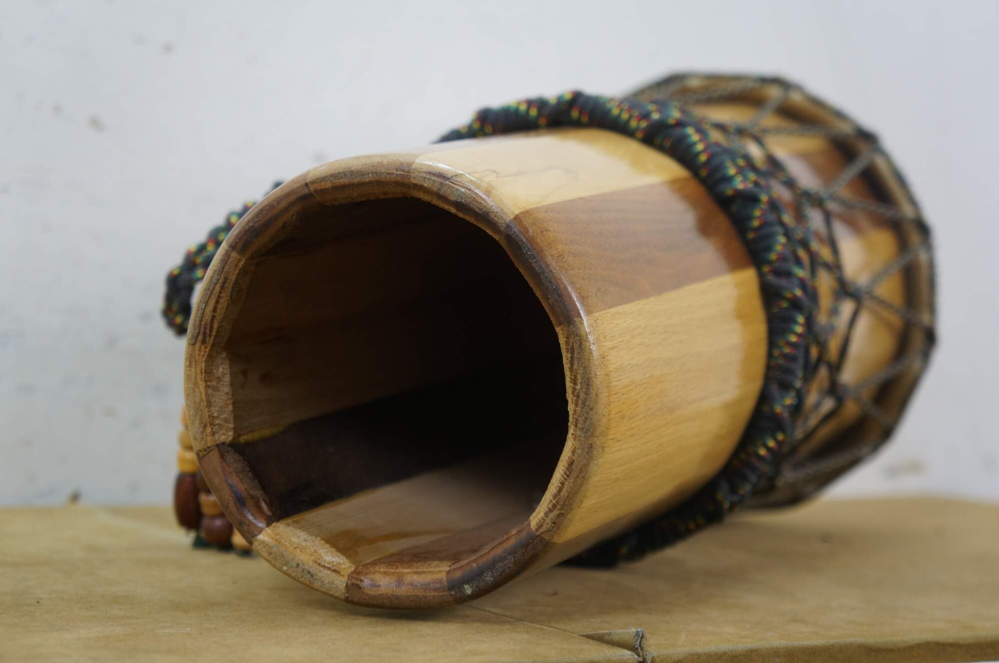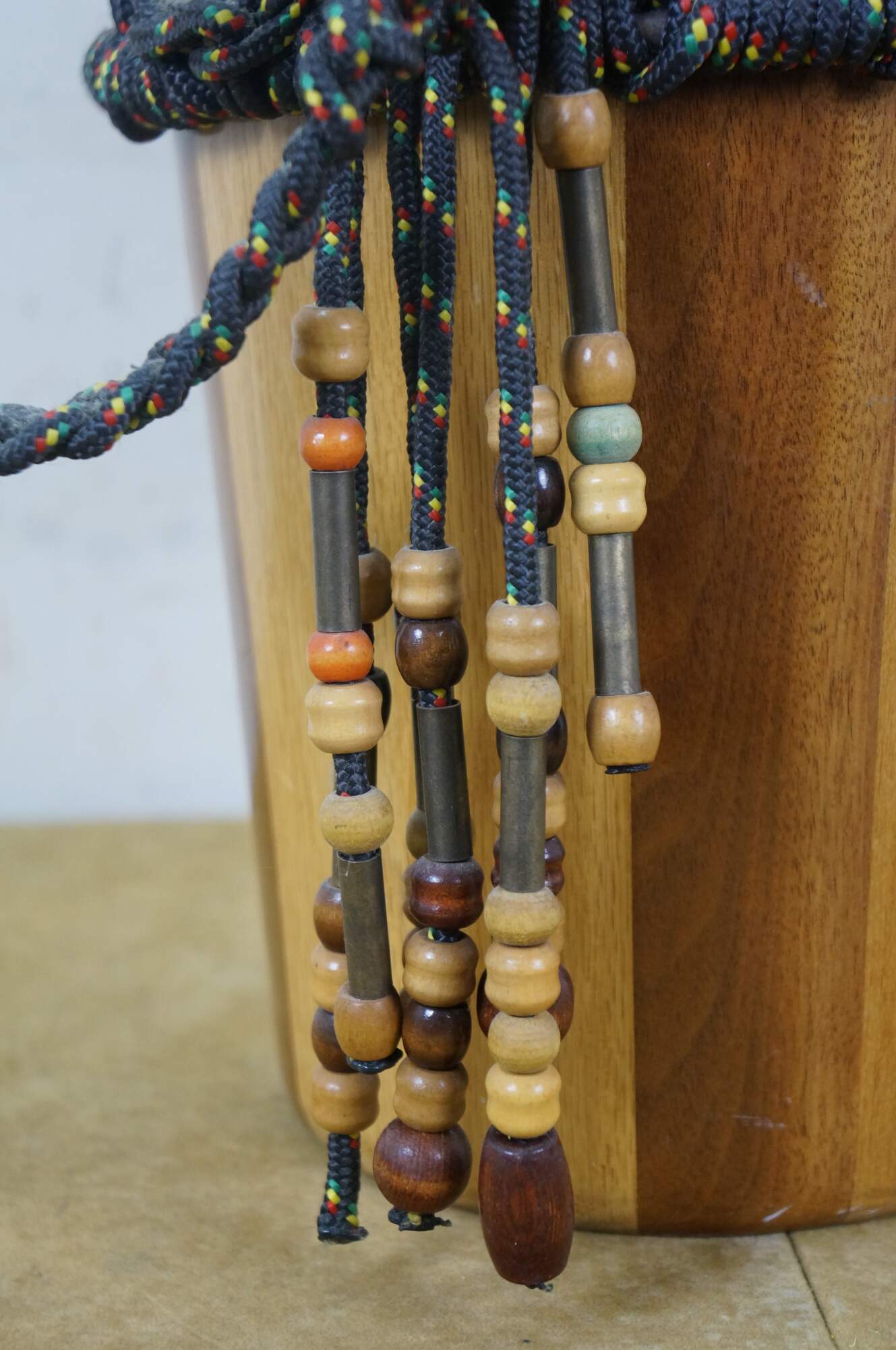 Late 20th century ashiko drum - tapered body of multi-toned panels of hardwood, toped with an 10" goat skin head, painted with folk art / tribal wave and animal design, bound with black speckled paracord.