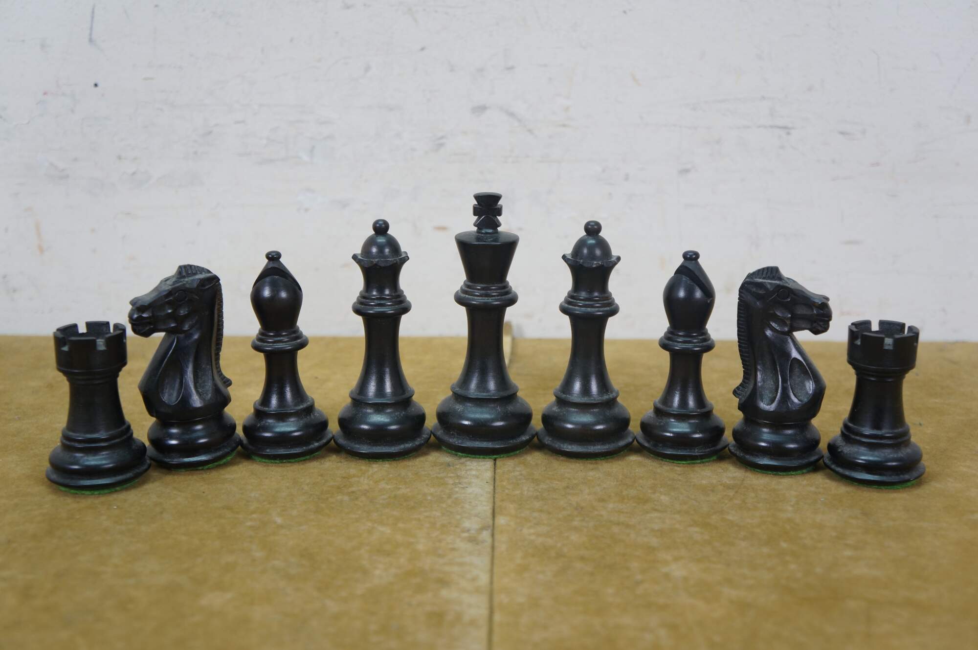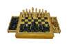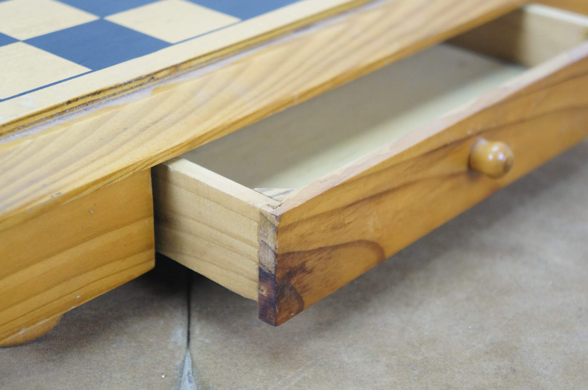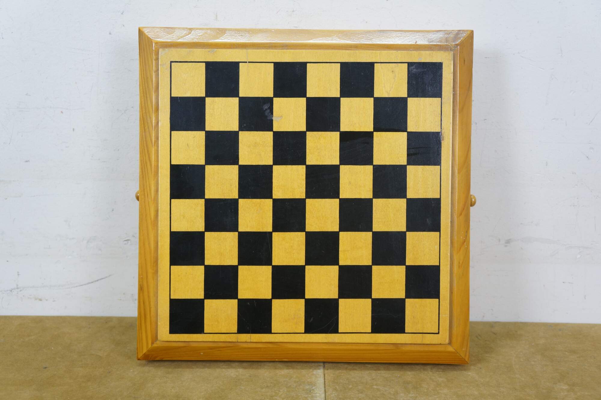 Late 20th century wooden tabletop chess board in black and natural wood tone, with two storage drawers. Includes a full 32 piece set of small wooden chess pieces and 31 checkers (possibly original to the board). Also includes a full set plus a spare Queen for each side of larger chess pieces with felted bases.