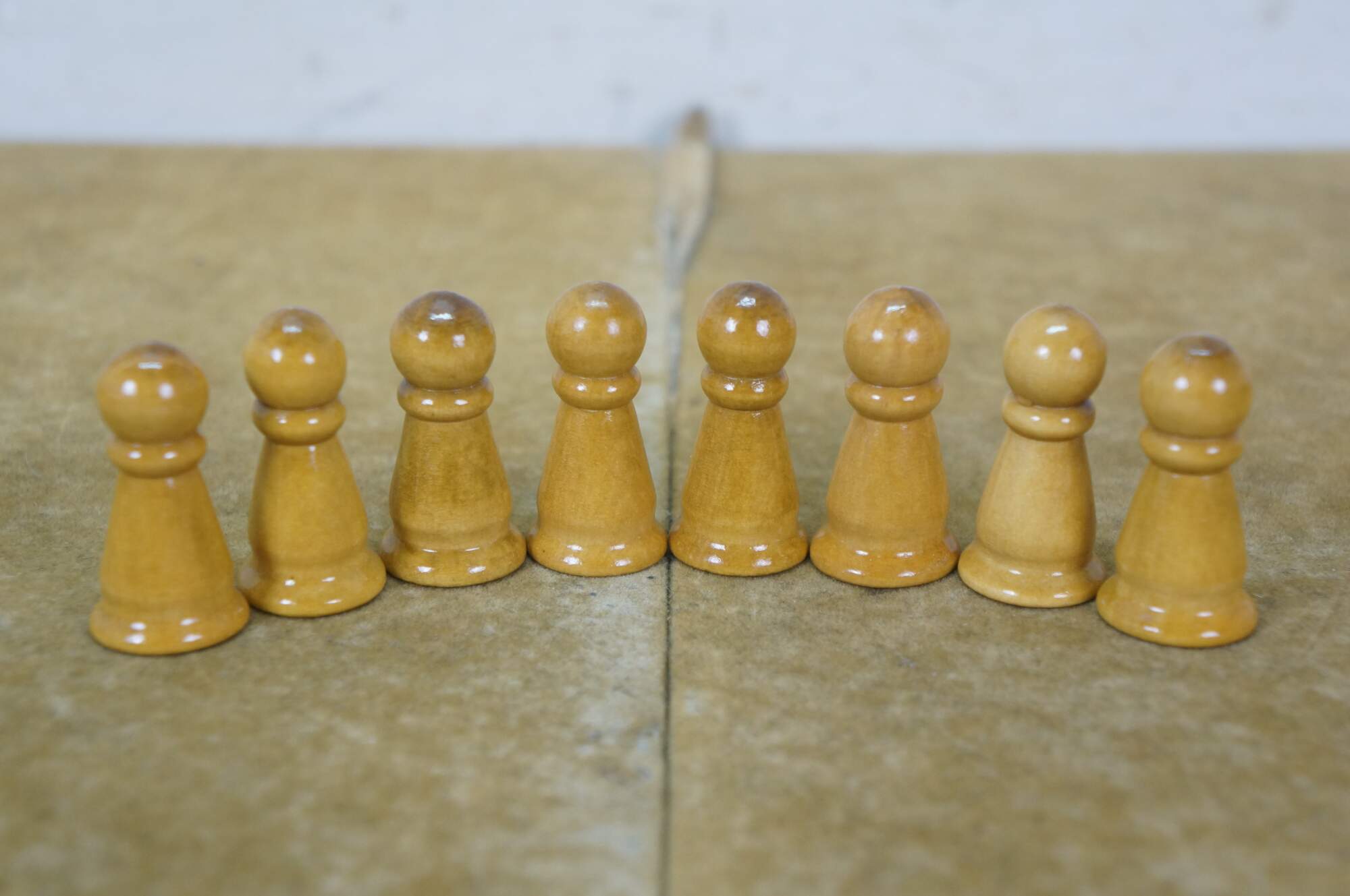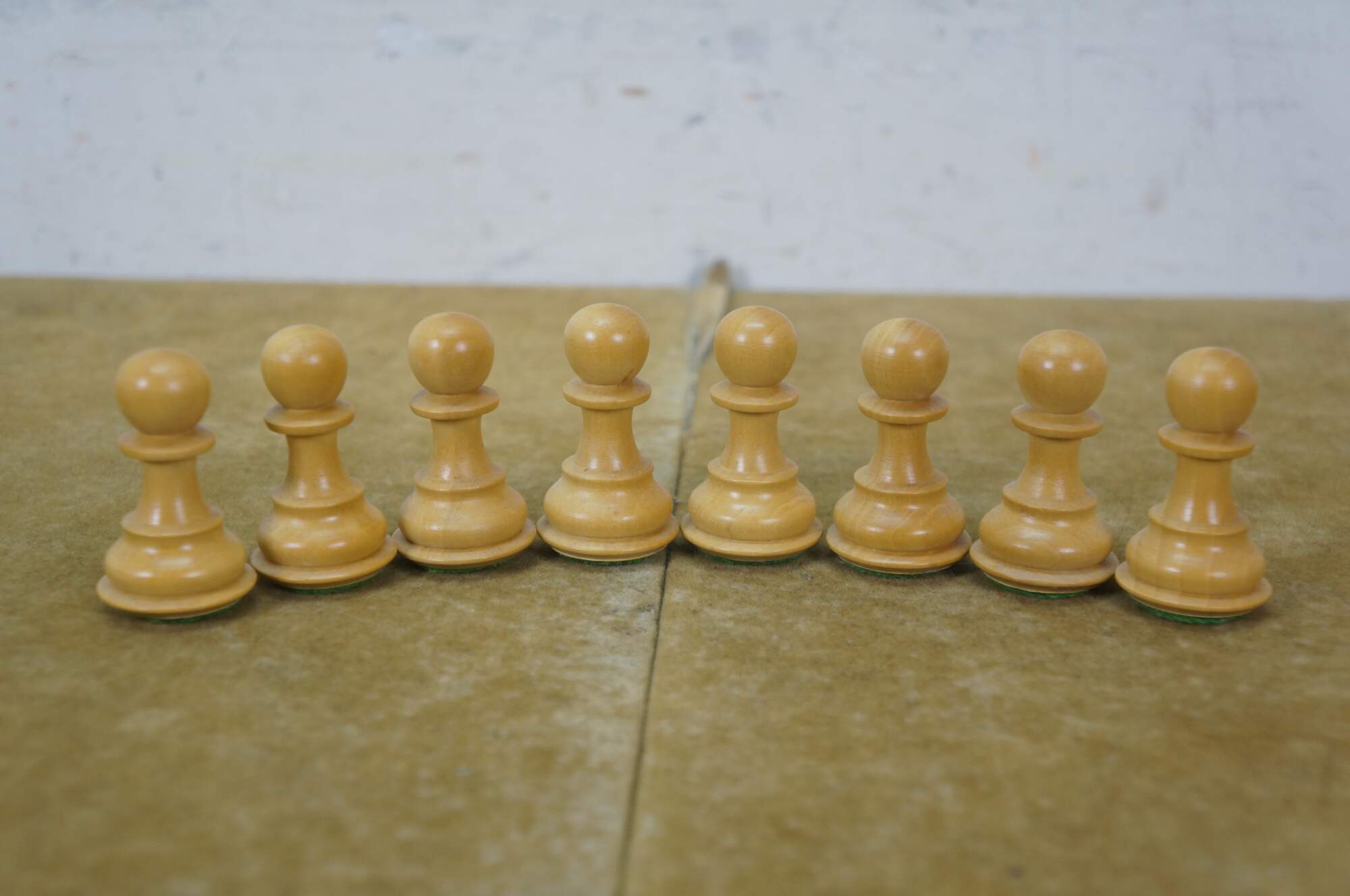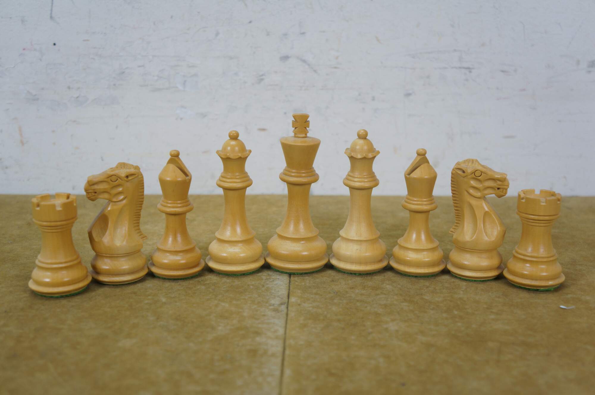 Late 20th century wooden tabletop chess board in black and natural wood tone, with two storage drawers. Includes a full 32 piece set of small wooden chess pieces and 31 checkers (possibly original to the board). Also includes a full set plus a spare Queen for each side of larger chess pieces with felted bases.